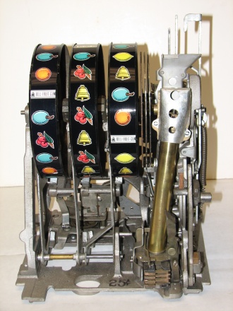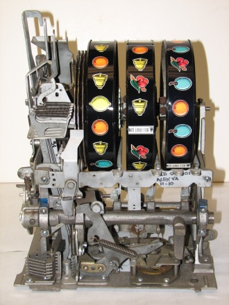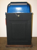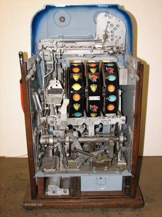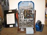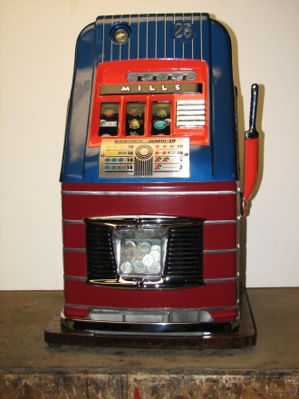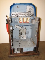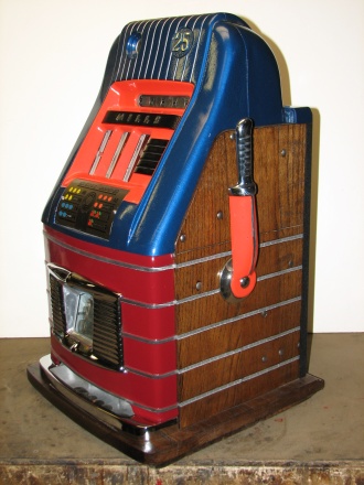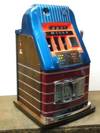Mills 1947 Jewel Bell Hi-Top 25 cent, This is a very nice restored machine, Gloss Blue trimmed in Orange. All the trim on this machine has been chrome plated to add a little flash to the gloss Blue color. Mint condition award card, Jack pot with reserve, original back door and lock with one key, original cash box.