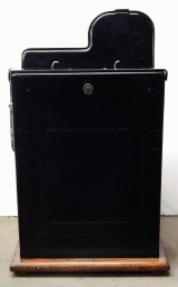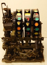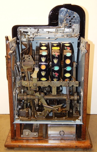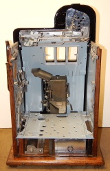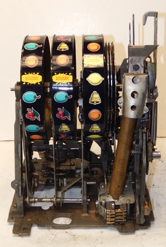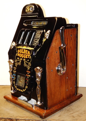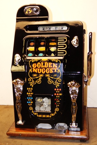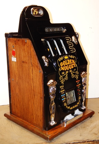Mills 1947 Black Cherry "Golden Nugget" 25 cent. High Gloss Black, trim in yellow. Complete Jackpot with reserve, original back door, oak cabinet. Reel strips, award card, cashbox are replacements. Plays very easy, pays as it should. 2-5 payout. This machine was never used in the Golden Nugget casino in Las Vegas. There were only a hundred or so Golden Nugget machines made for the casino back in the 50s. I don't want any one to think this is a original machine from that casino. The Golden Nugget kit was added to an original 1947 Black Cherry which only consist of two dolls, two nuggets, reel strips, award card. The machine it self is all original Mills black Cherry. This is the same way they made them for the casino back in the 50s.