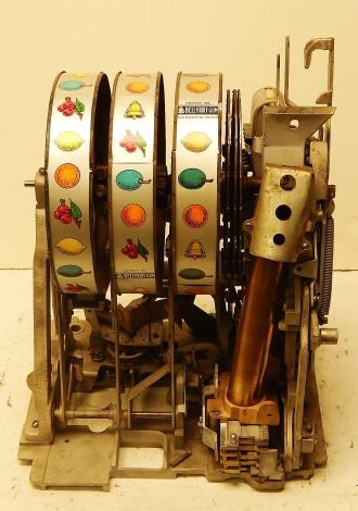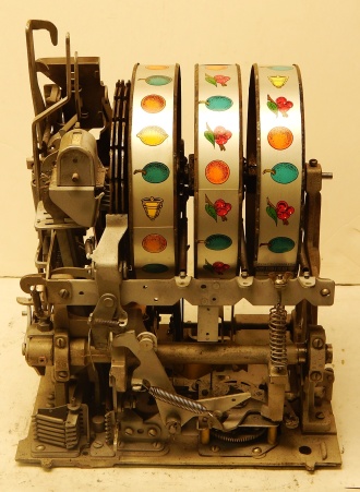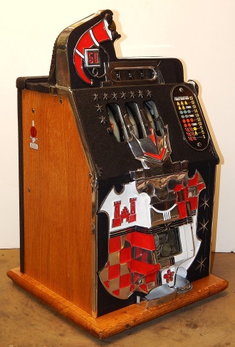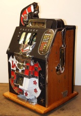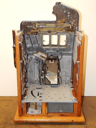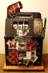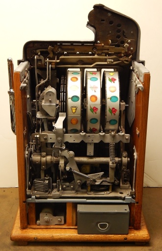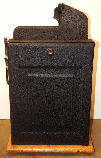 1934 Mills Castle Front 50 cent. Another very nice all original large coin machine. Restored back to it's original colors, wrinkle black trimed in red and white. Jackpot with reserve, original reel strips, original back door, original Mills lock with one key, original cash box. Mint original oak cabinet. Still has the original paper work on the inside of the cabinet. This is the way you want to find them. The only thing that is not original on this machine, is the paint we used to restore it. Plays very easy, 3-5 payout.