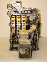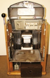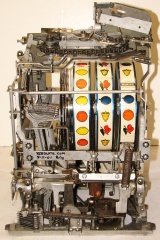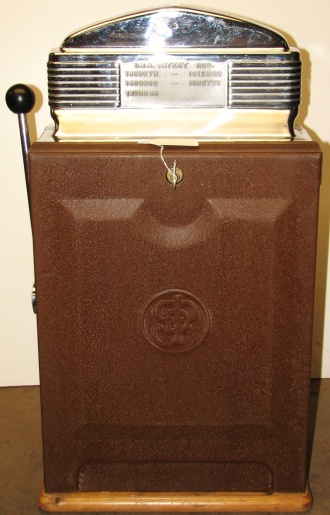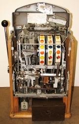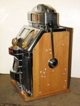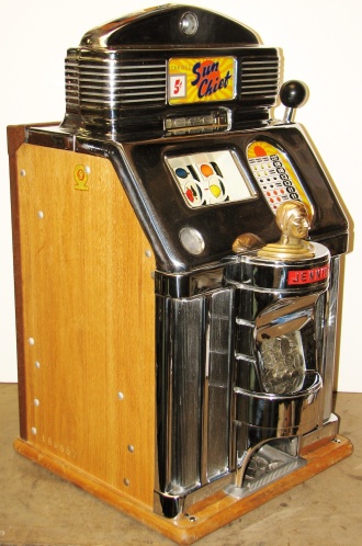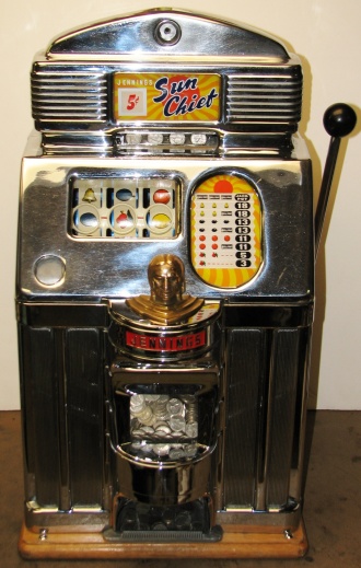 1951 Jennings Sun Chief, 5 cent. Very nice original machine not restored, the original chrome on this machine is 9 out of 10. Has the original cash box, original back door with original lock # ODJ-2200,original reel stripes. Cabinet on this machine is in mint condition with only three counter mounted holes on the base, two holes in the front have beed pluged with two chrome plated carriage screws which look very nice. If you are looking for a nice all original machine here it is.