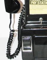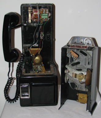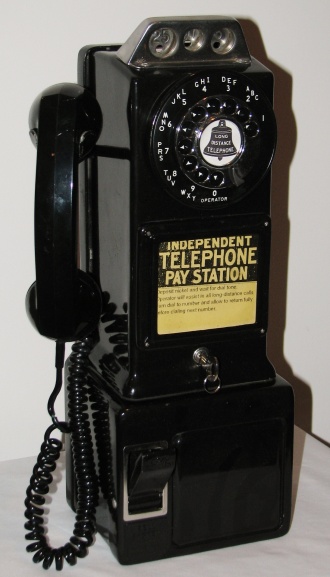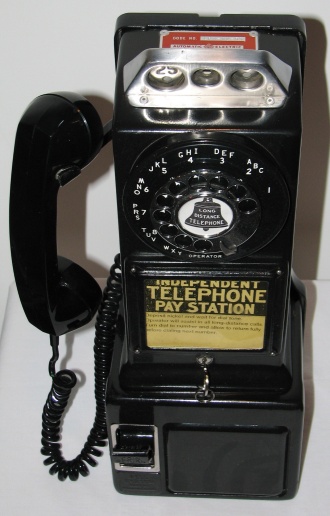 1950s Pay Phone made by Automatic Electric, comes with modern plug-in hook-up. There is a very small crack in the installation around the wire close to the hand set. Come with the original key.