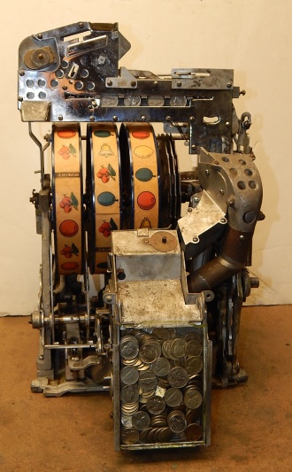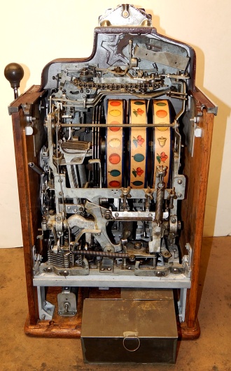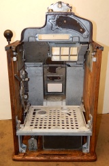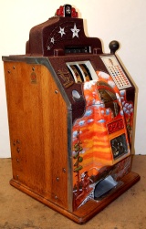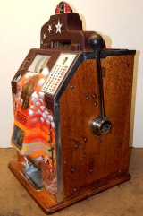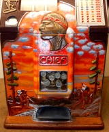 1937 Jennings "4 star Hunting Scene" Chief, 5 cent. Very nice original number matching machine. Painted wrinkle brown with a hand painted hunting scene. Casting are polished not plated. Very nice original oak cabinet, new award card, original cash box, original back doors, original reel stripes. Play and pays as it should.i