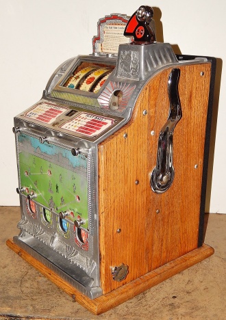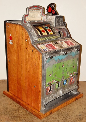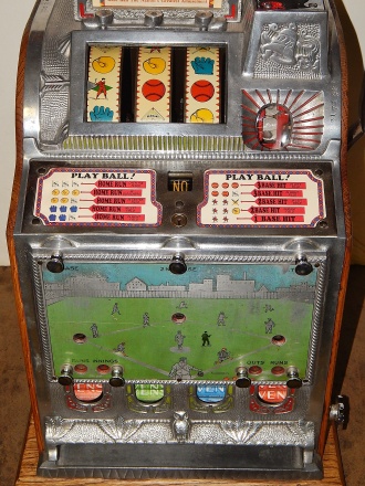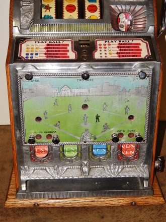 1929 Mills FOK Baseball 5 cent, previously restored. Polished not plated, original play field. This machine has a lot of things going for it. You can play the game of baseball and keep score as you play. Mint vender, which give you a roll of mints every play. This was Mills way to make the machine more appealing to the player and get around the gambling laws back in the day as a game of Skill. Plays great and pays as it should.