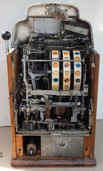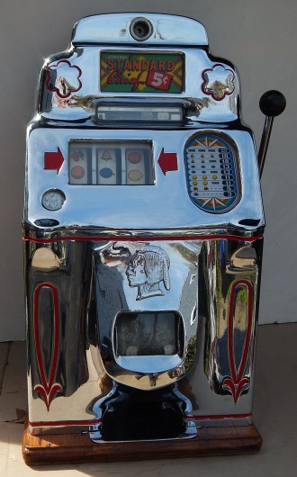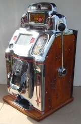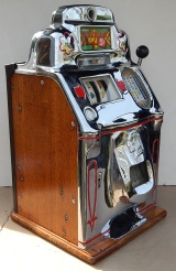 1947 Jennings "Chrome" Standard Chief 5 cent, a very sweet machine. The chrome plating on this machine is triple plated, a 9.9 out of 10, just beautiful. Everything on this machine is original but, the new chrome plating. Very nice solid all oak cabinet. Original cash box, original back door. Plays very nice and easy. 3-5 payout