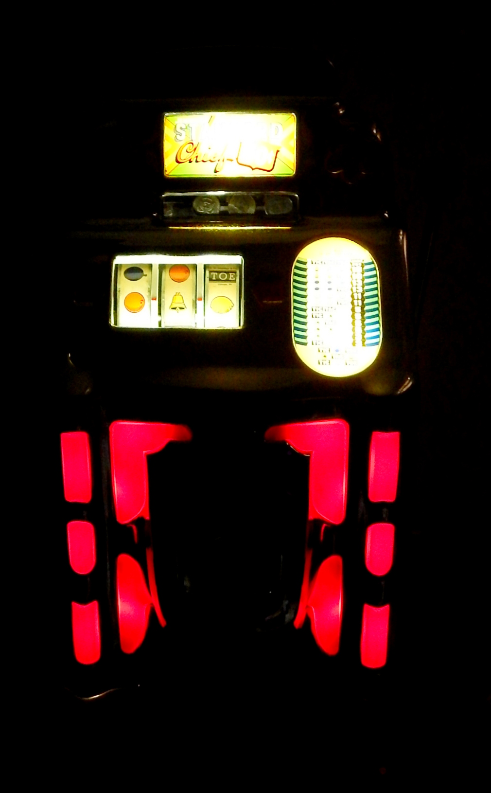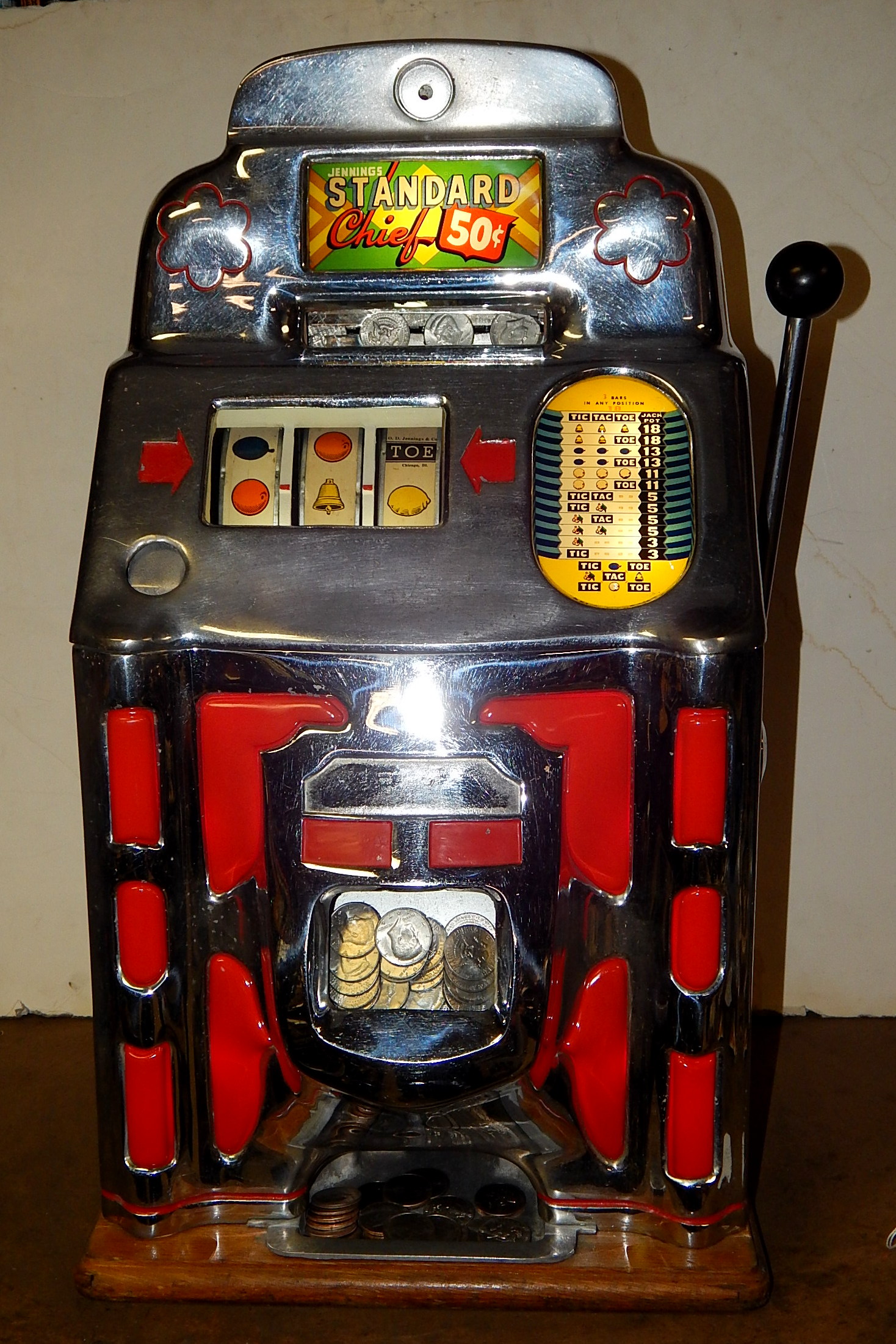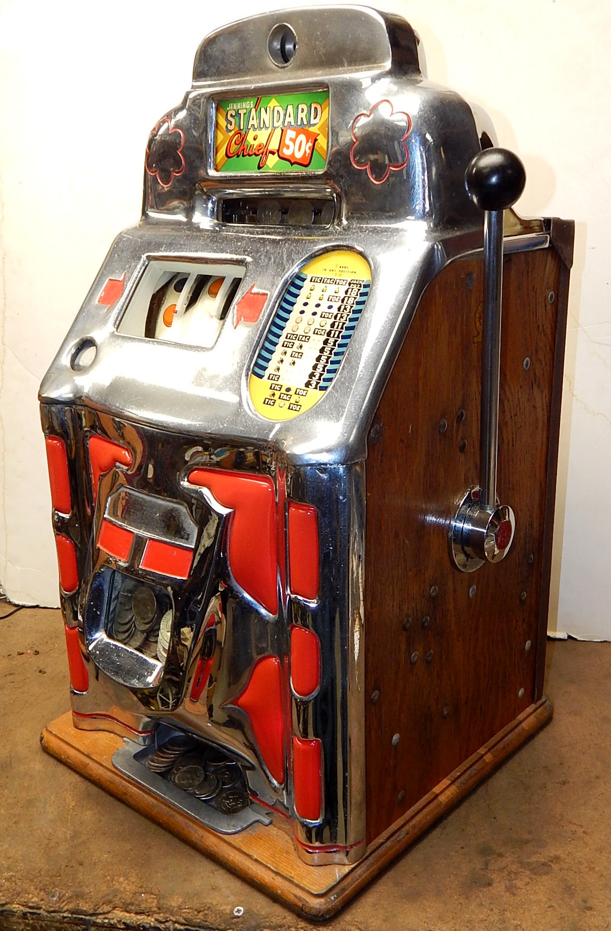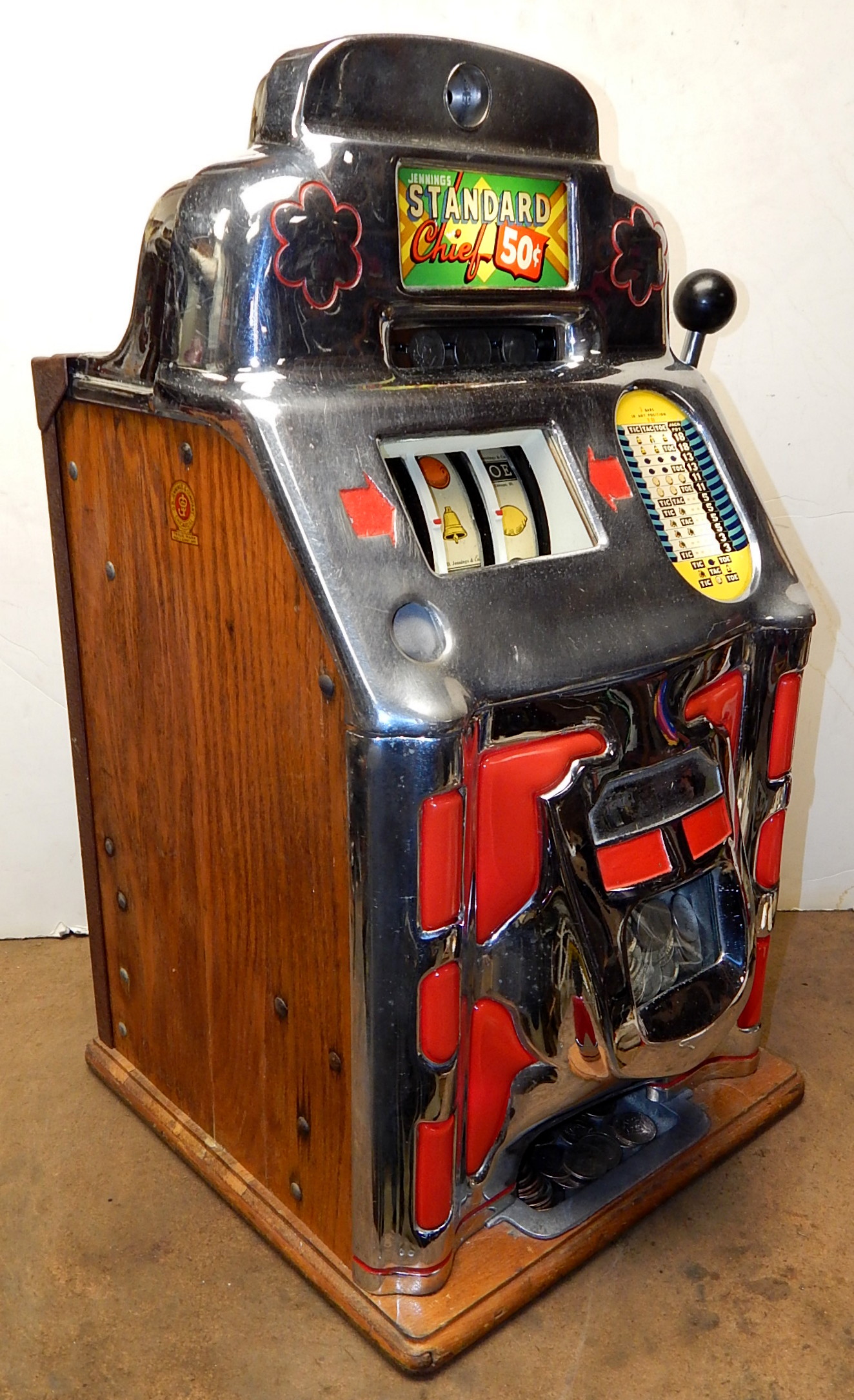 Jennings Super Due Luxe Club Chief 50 cent, another large coin machine. Chrome on the casting are a 7.5 out of a 10 not bad for a 75 years old machine. Has full funtion self feed Jack-Pot, original reel strips. original back door with ODJ lock and key, original cash box Original top marquee and award card. This machine has lite-up castings. Plays very nice. If you are looking for a nice all original lite-up machine that has not been restored, here it is.