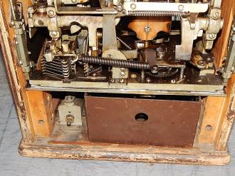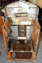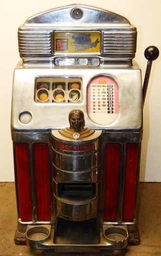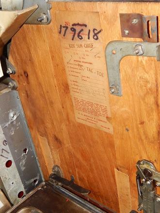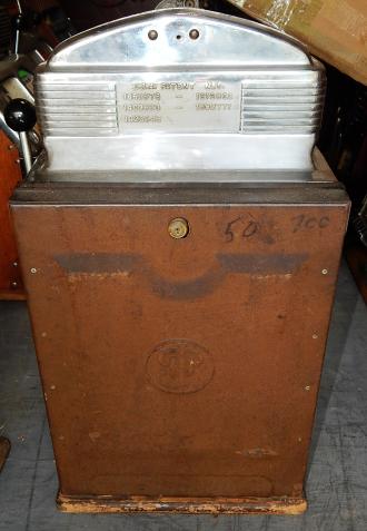1950 Jennings Super Deluxe Sun Chief 50 cent. original cash box, original back door with Ace lock and two keys, Mint original reel stripes. Cabinet on this machine is in great condition. No lights or wires for lights in this machine, also the Jackpot has been removed by the operator for larger Jackpot pay outs.
