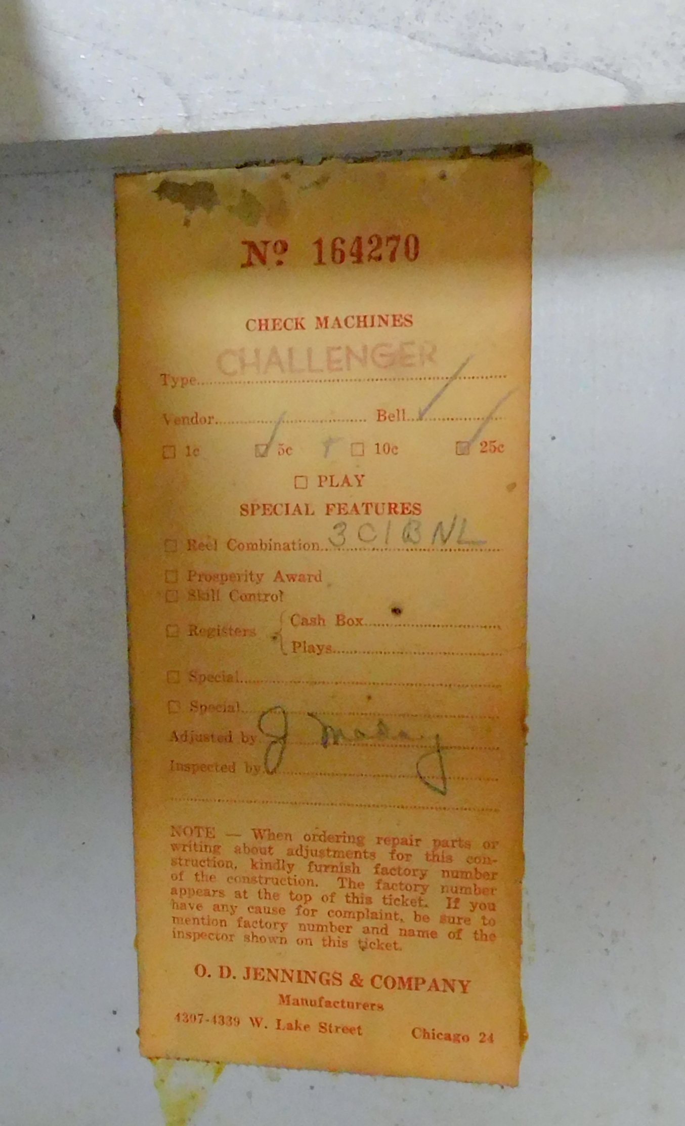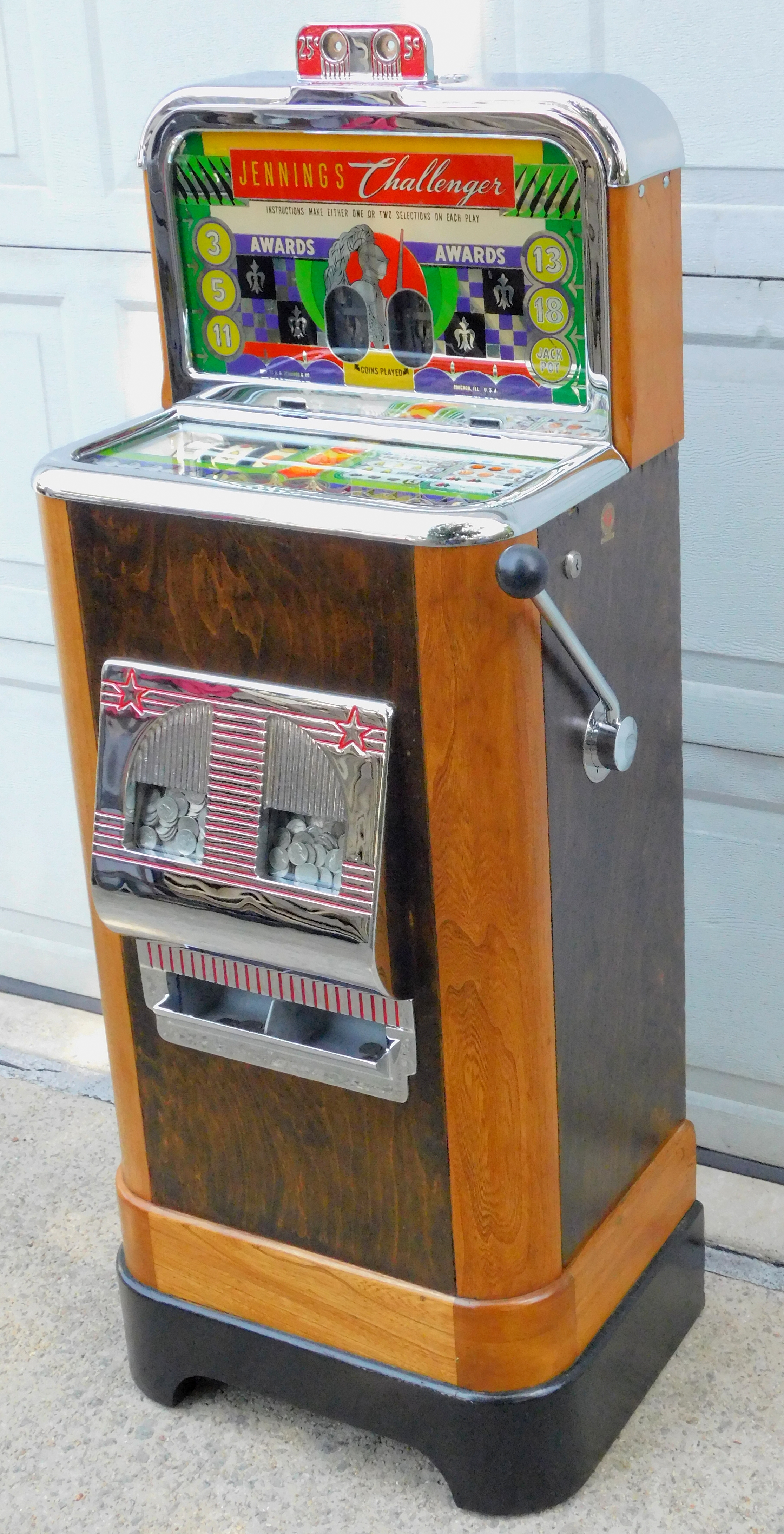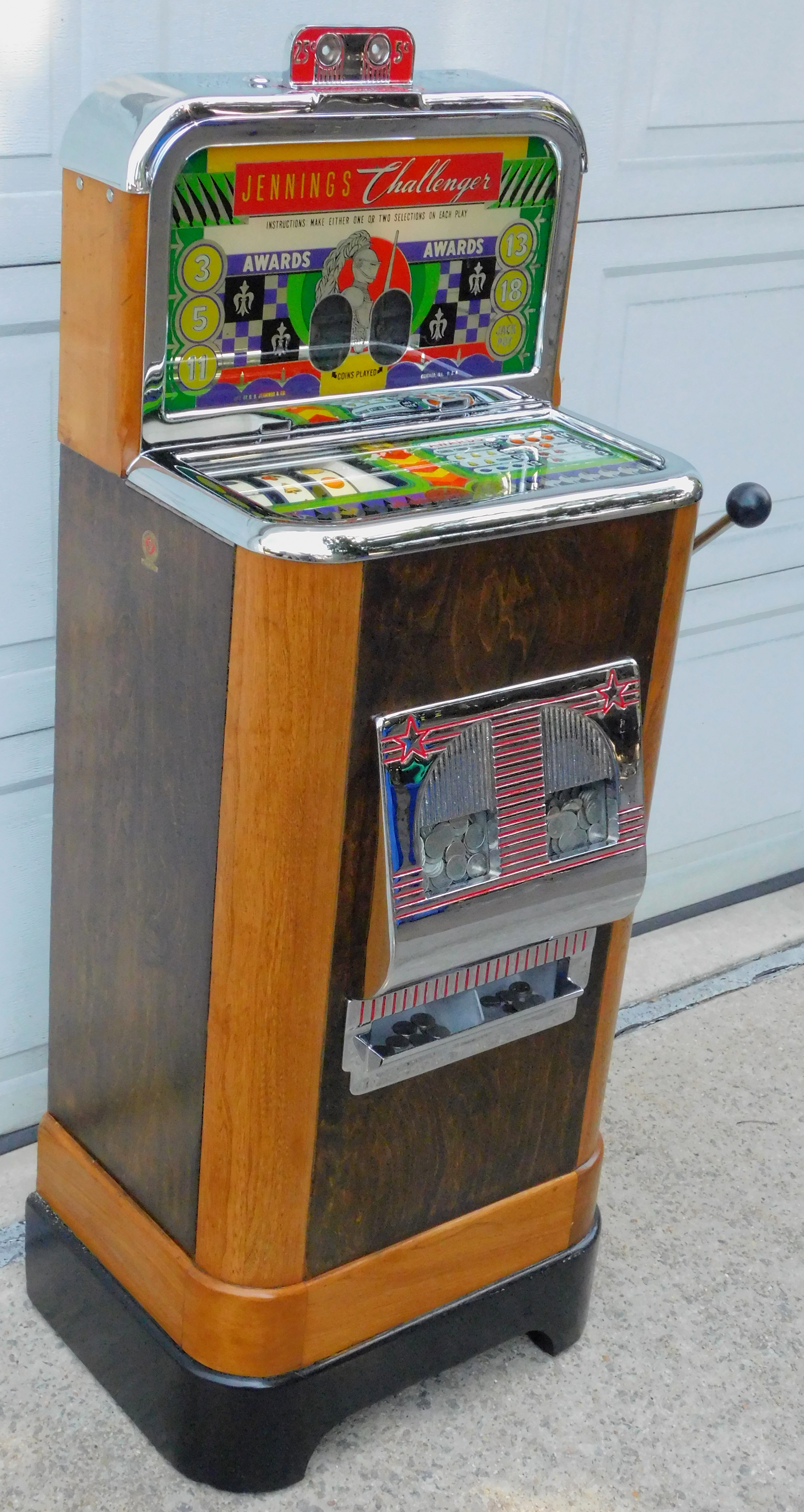 Jennings idea when making the Challenger was to make a machine that would bring more money in for the operator, by taking up to two coins in one machine under one license. These machines were a big hit in Nevada and the state of Maryland 1950s and 60s . Jennings made these in 5c-5c, 5c-10c, with the most popular 5c-25c. also made in the Tic Tac Toe version and Monte Carlo with 500 coin Jackpot version.