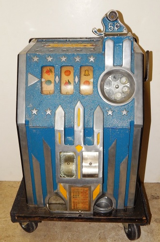 1936 Pace Comet 5 cent, Original condition with original colors Blue, trimed in red and yellow. Original reel strips and award card. Original back door with original Pace lock and key. Original cash box, functional twin jackpots. Plays and pays as it should. 3-5 pay out. More pictures coming soon.