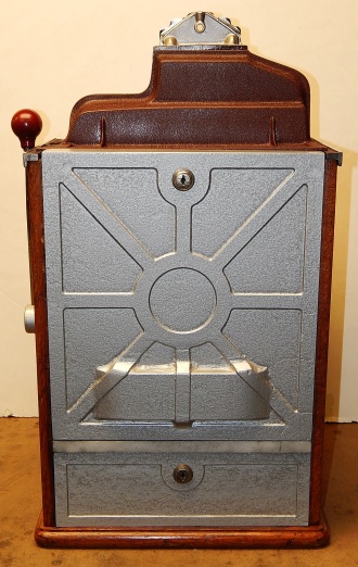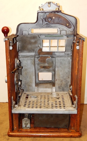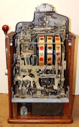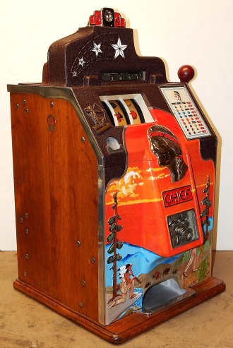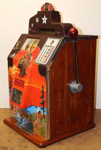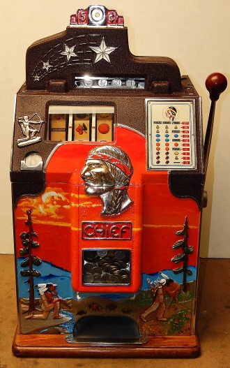 1937 Jennings "4 star Hunting Scene" Chief, 5 cent. Very nice original number matching machine. Painted wrinkle brown with a hand painted hunting scene. Casting are polished not plated. Very nice original oak cabinet, original award card, original cash box, original back doors, original reel stripes. Play and pays as it should.