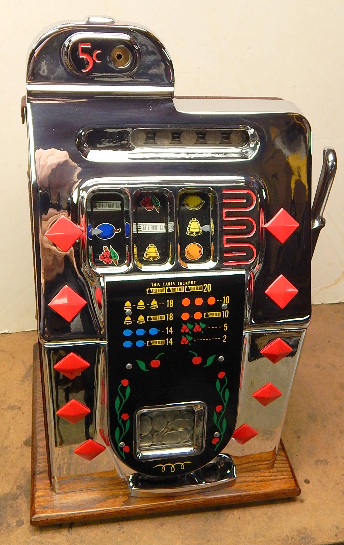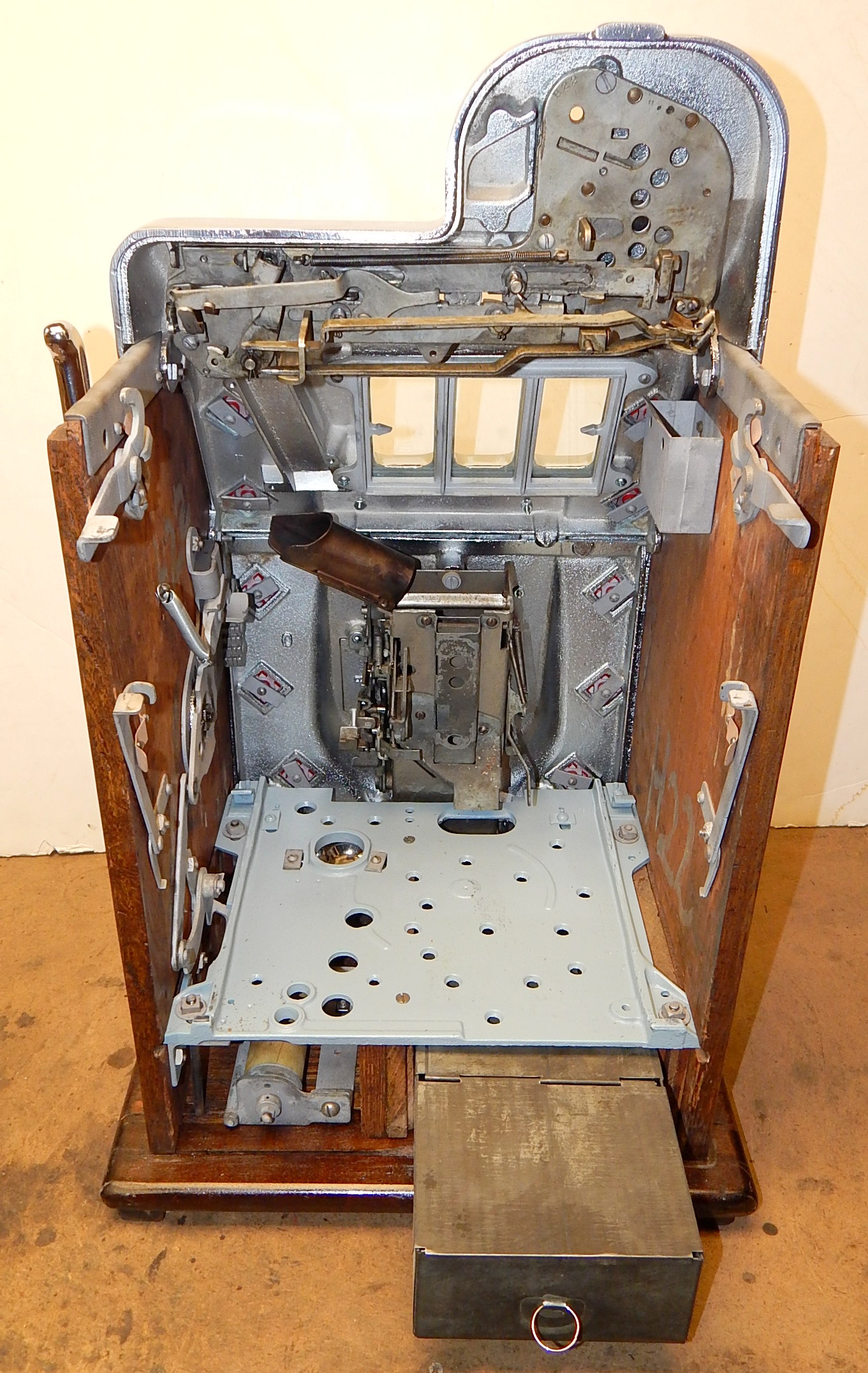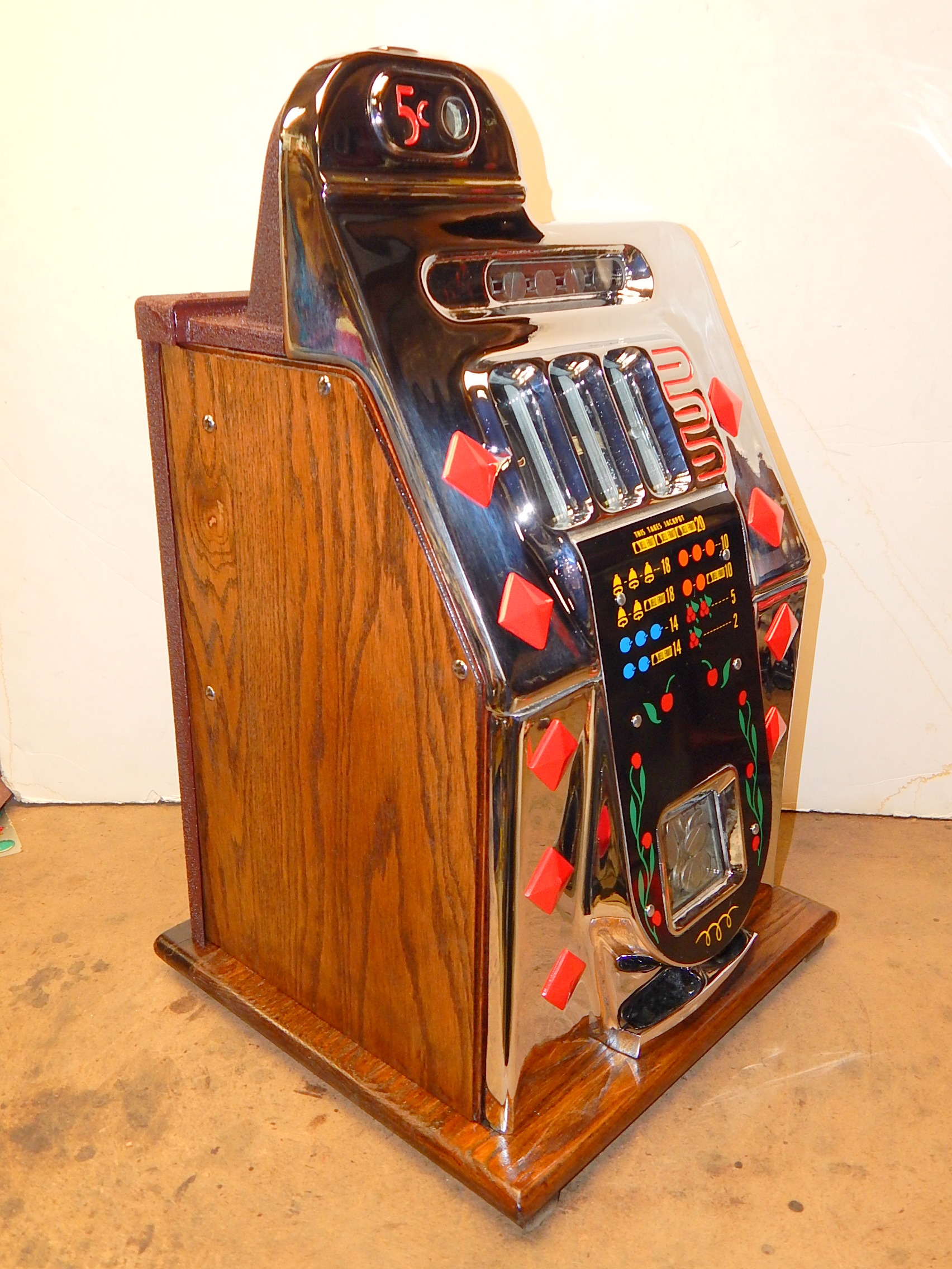 Mills 1939 Diamond Front 5 cent "Chrome". This is a very nice cast iron machine restored back to the original chrome finish. The cabinet on this machine was in such fine condition, we did not have the heart to hide this beautiful wood cabinet with paint, so its finished and stained instead of painted to bring out it's natural beauty. Mint condition award card, Jackpot, original back door and Mills lock with one key, original cash box. new reel strips. Plays very easy, 2-5 payout.