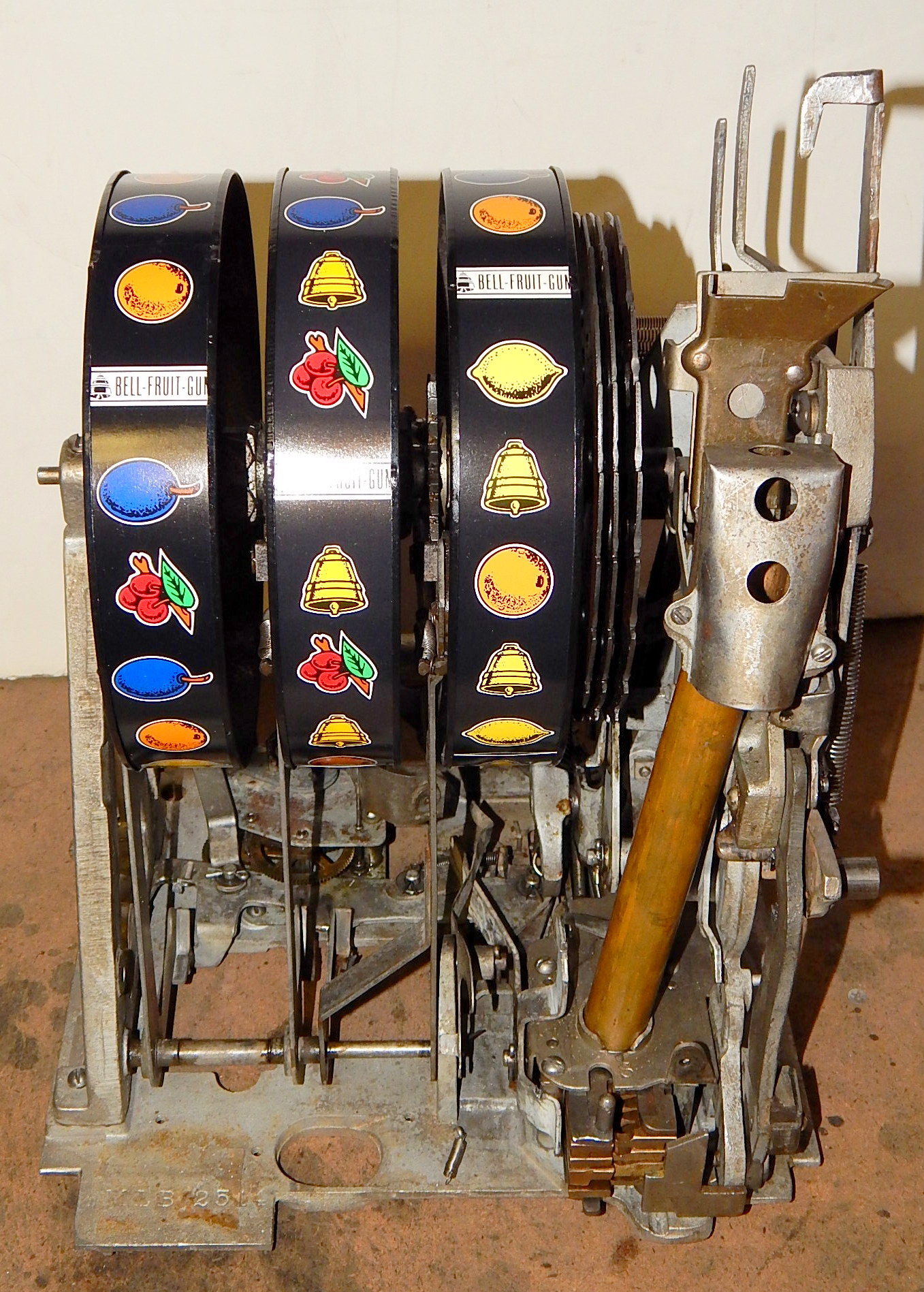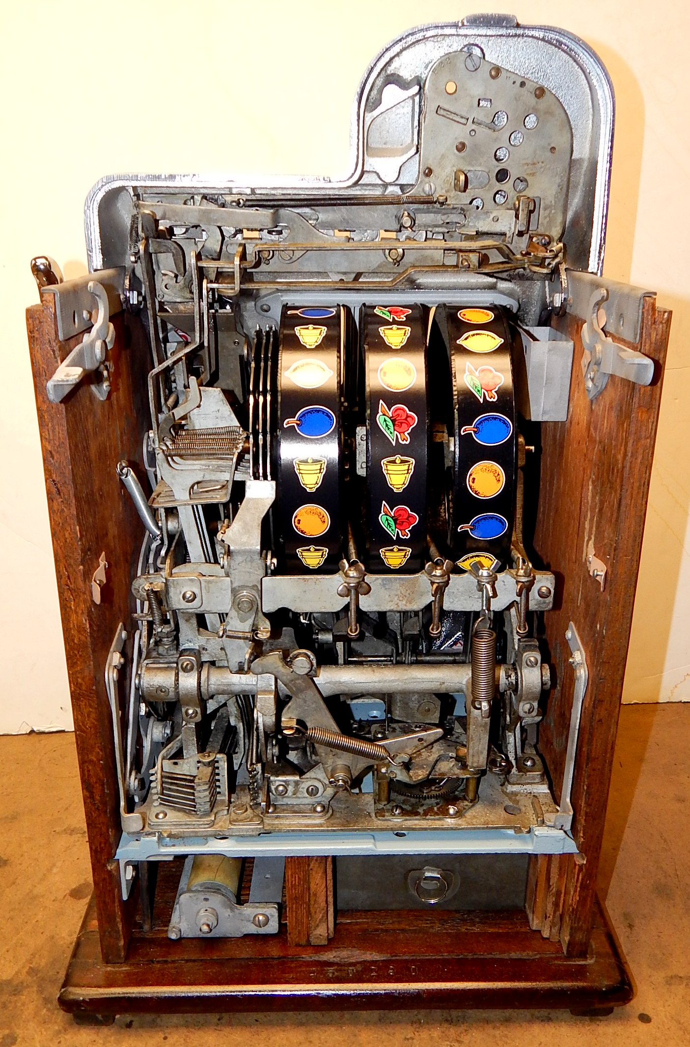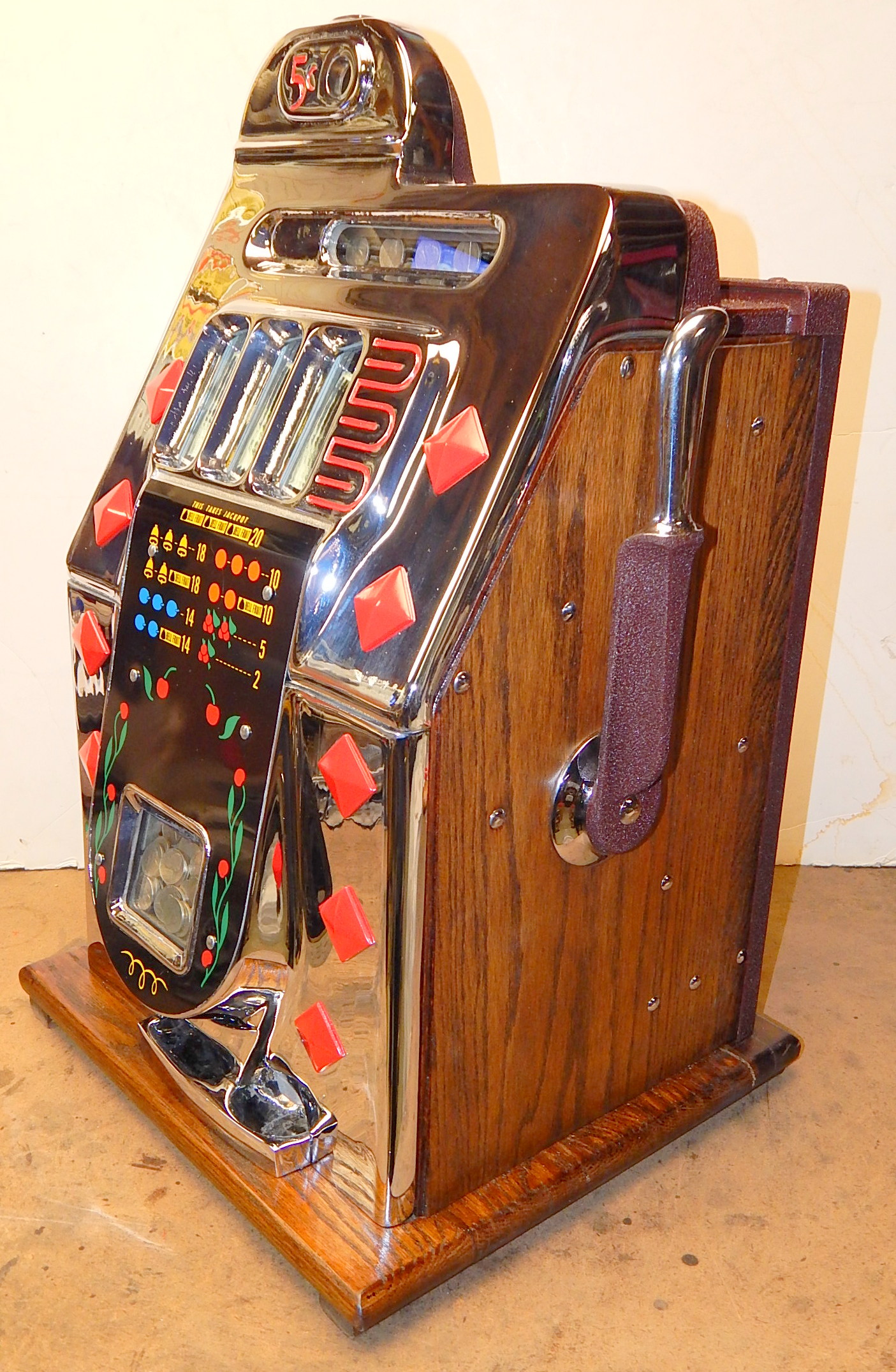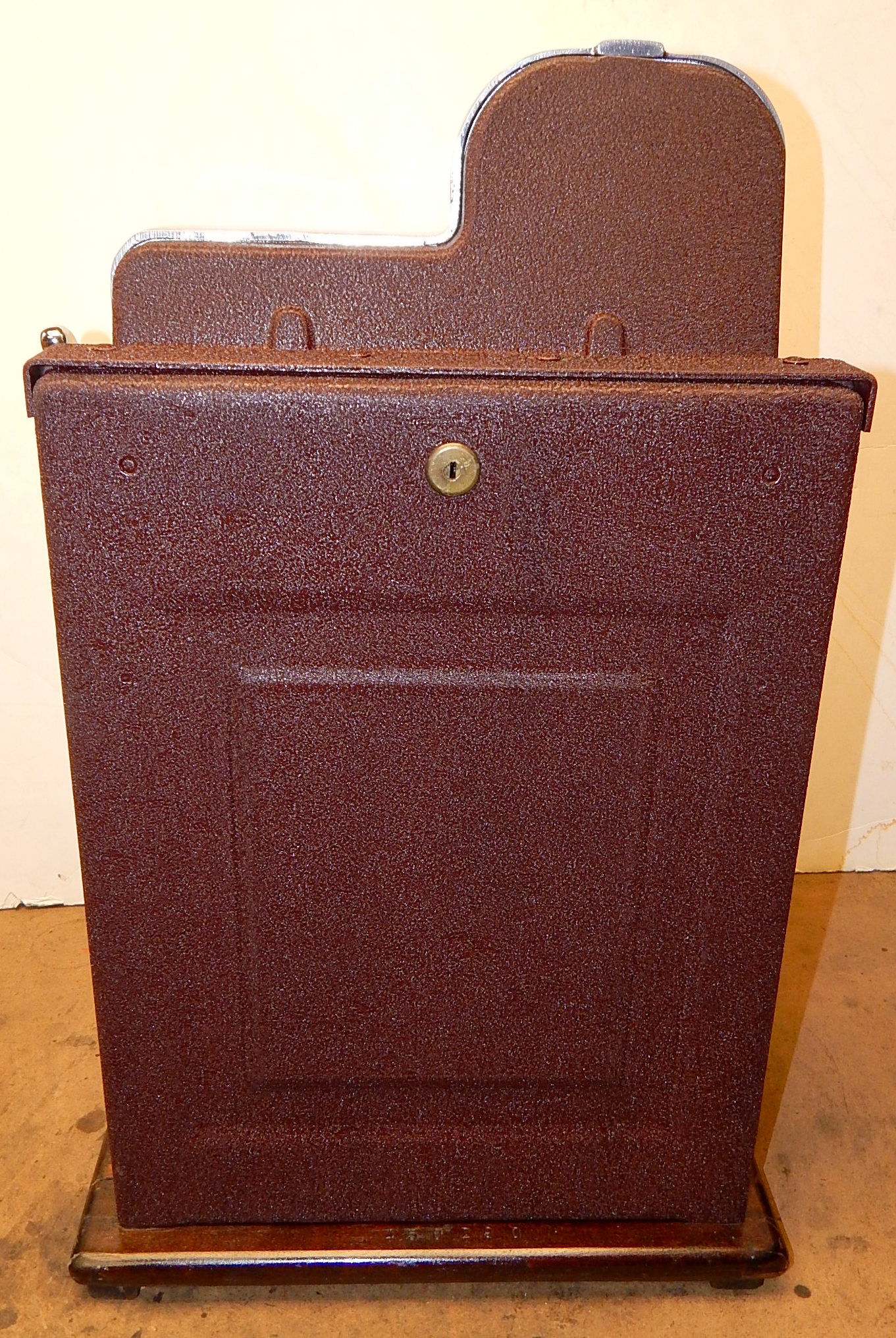 Mills 1939 Diamond Front 5 cent "Chrome". This is a very nice cast iron machine restored back to the original chrome finish. The cabinet on this machine was in such fine condition, we did not have the heart to hide this beautiful wood cabinet with paint, so its finished and stained instead of painted to bring out it's natural beauty. Mint condition award card, Jackpot, original back door and Mills lock with one key, original cash box. new reel strips. Plays very easy, 2-5 payout.
