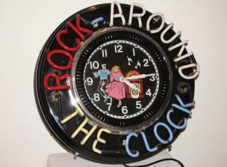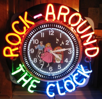 "Rock-Around the Clock" Neon Clock, 21 inches in diameter with a 12 inch diameter clock.