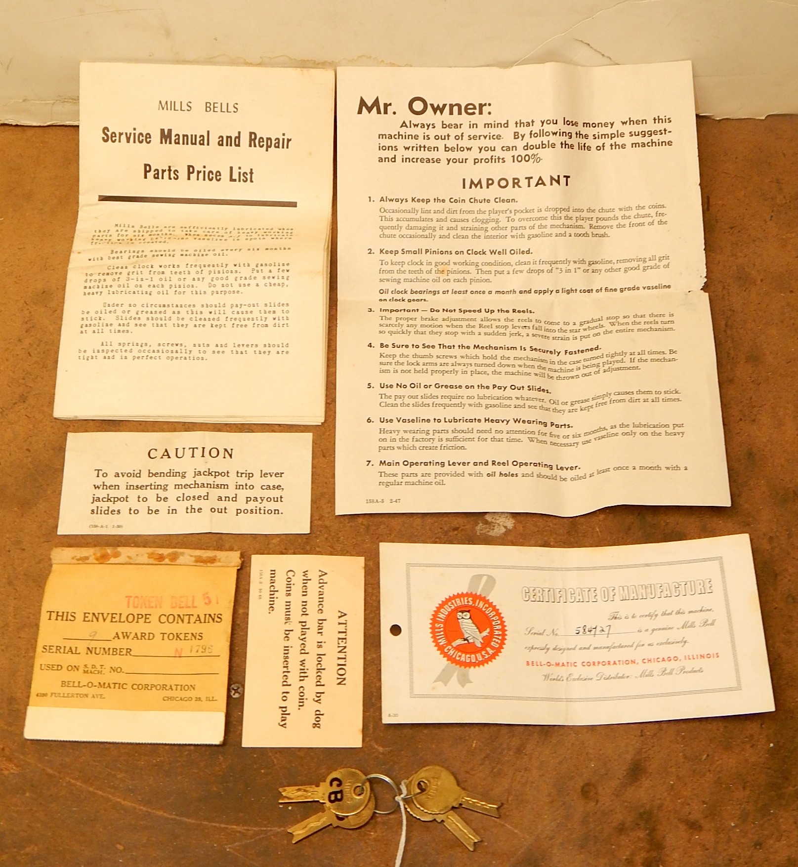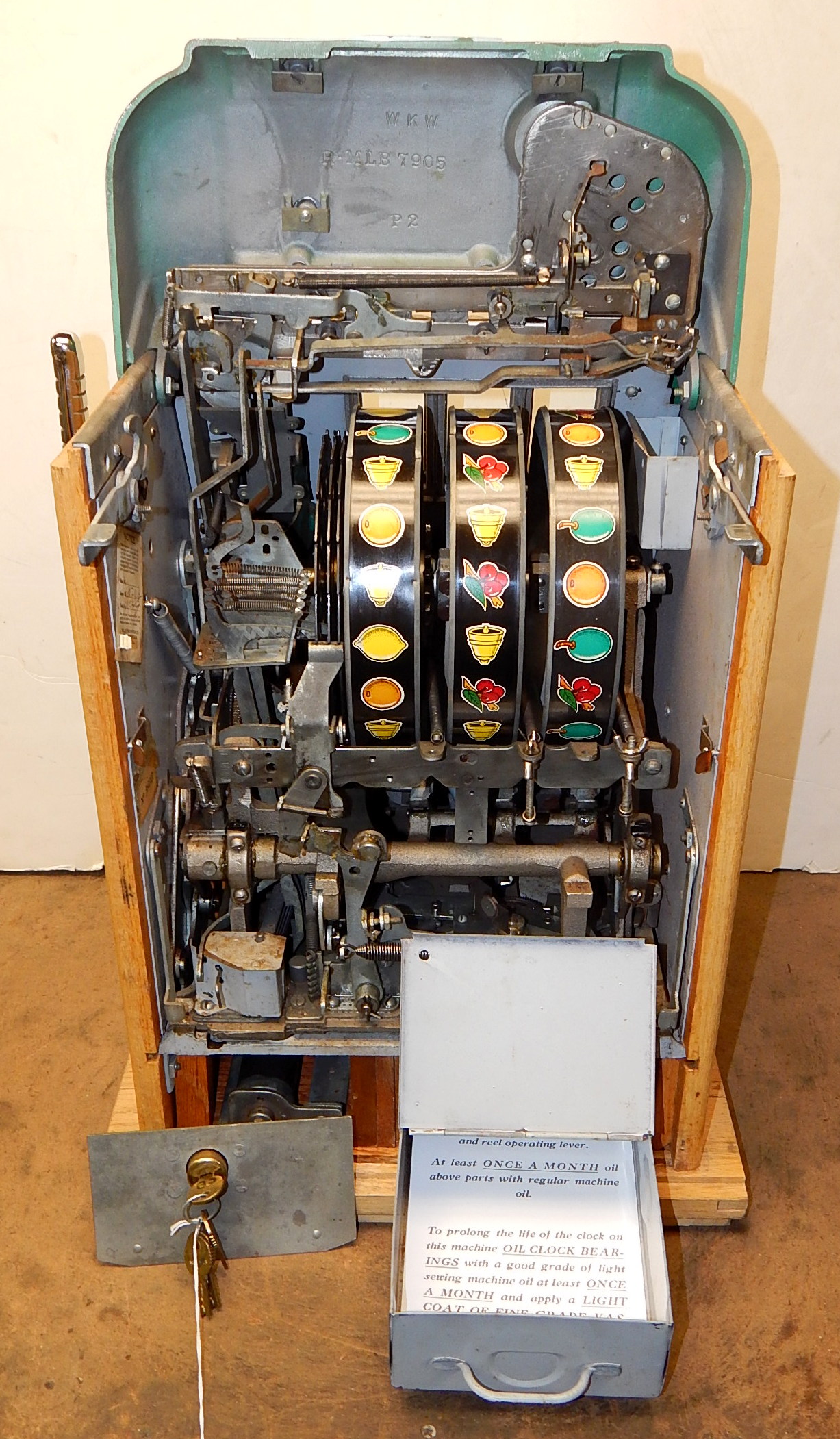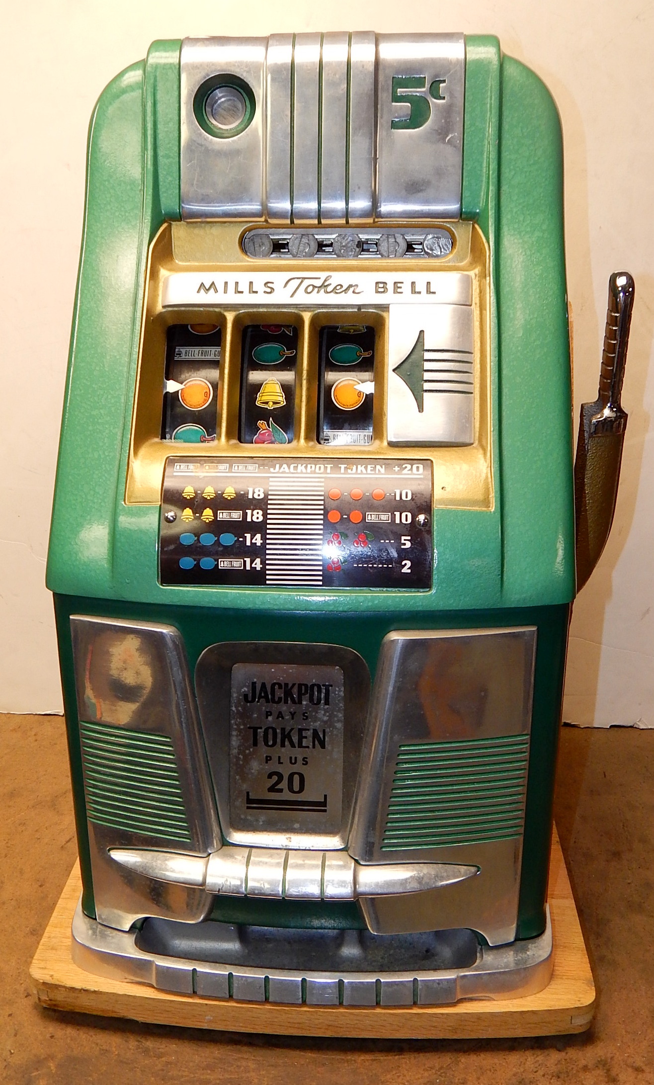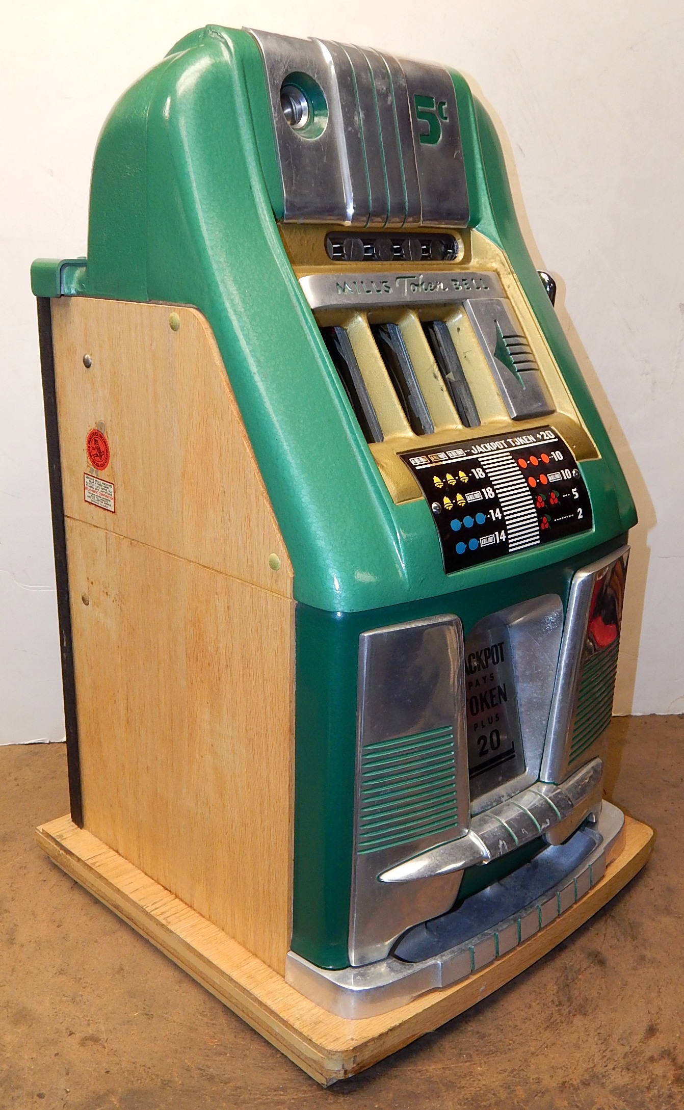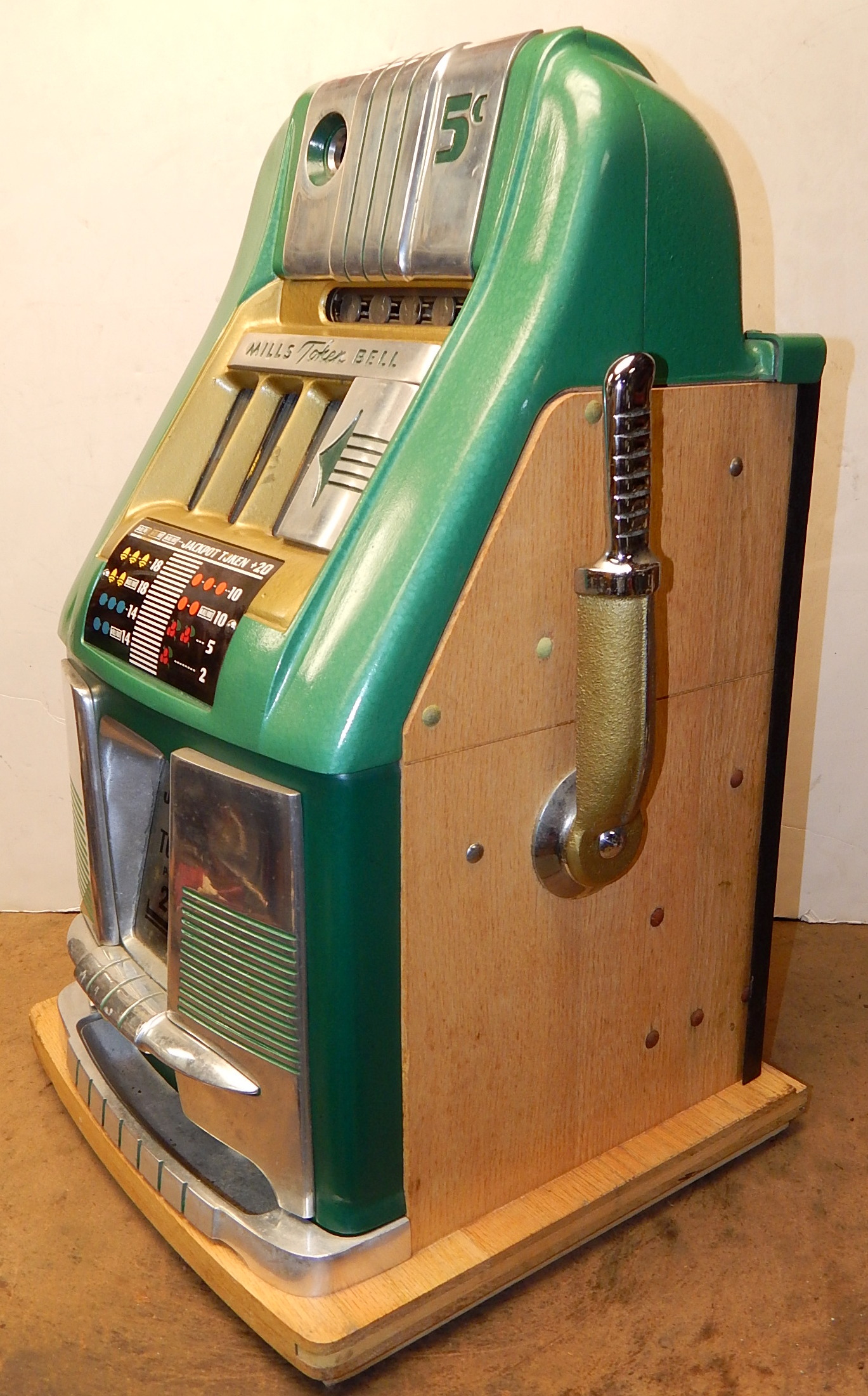 1948 Mills Jackpot Token Bell 5 cent, in original condition, not restored. Original reel strips in mint condition. Original back door with original Mills lock with two matching number keys. Original cash box and cash box door with two matching number keys. Machine comes with nine original Jackpot tokens and envelope. Plays very easy, pays as it should. Cleaned, lube and adjusted. Ready for many years of trouble free play.