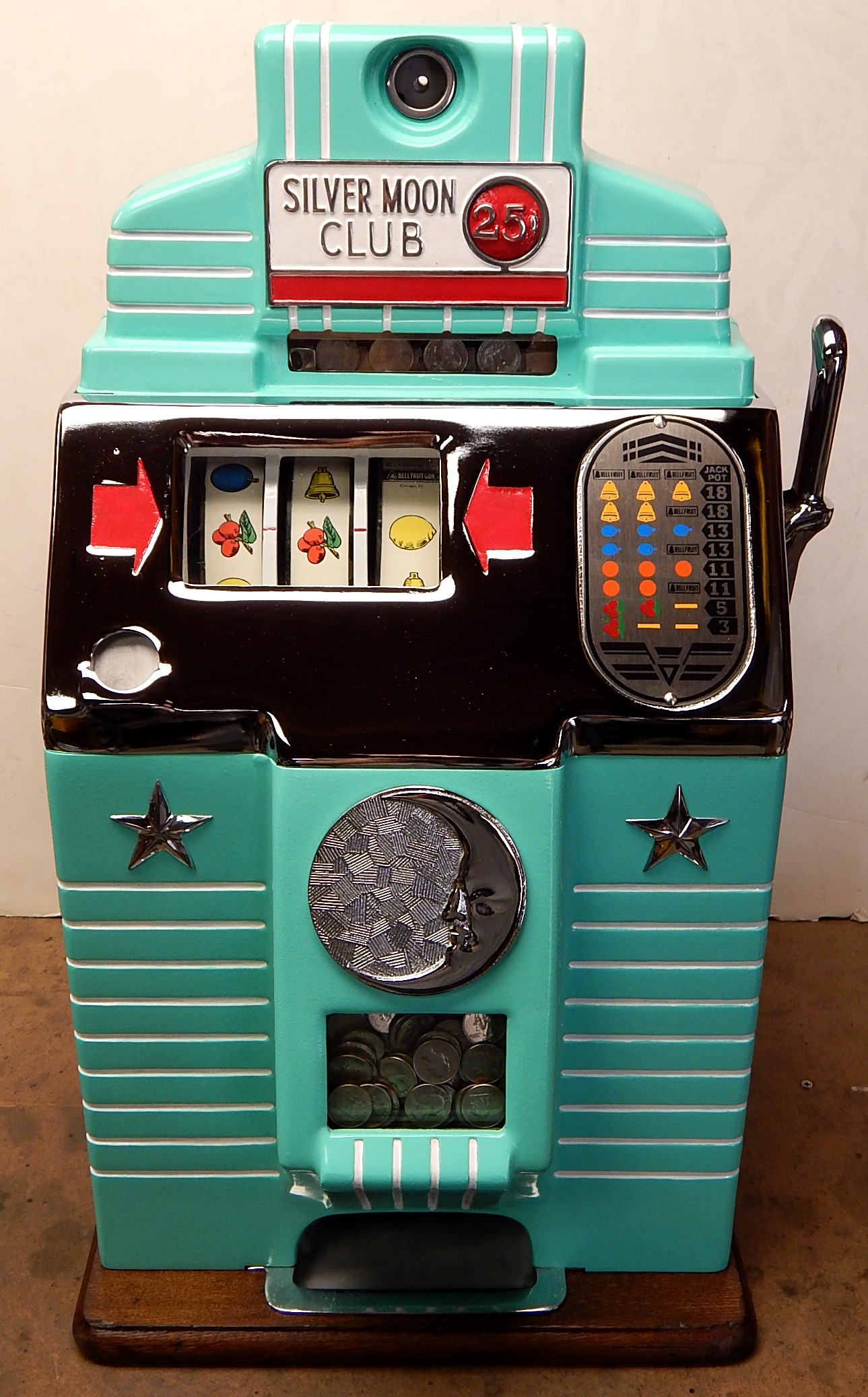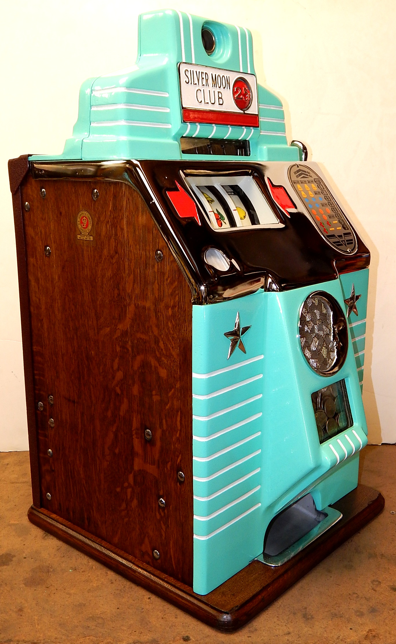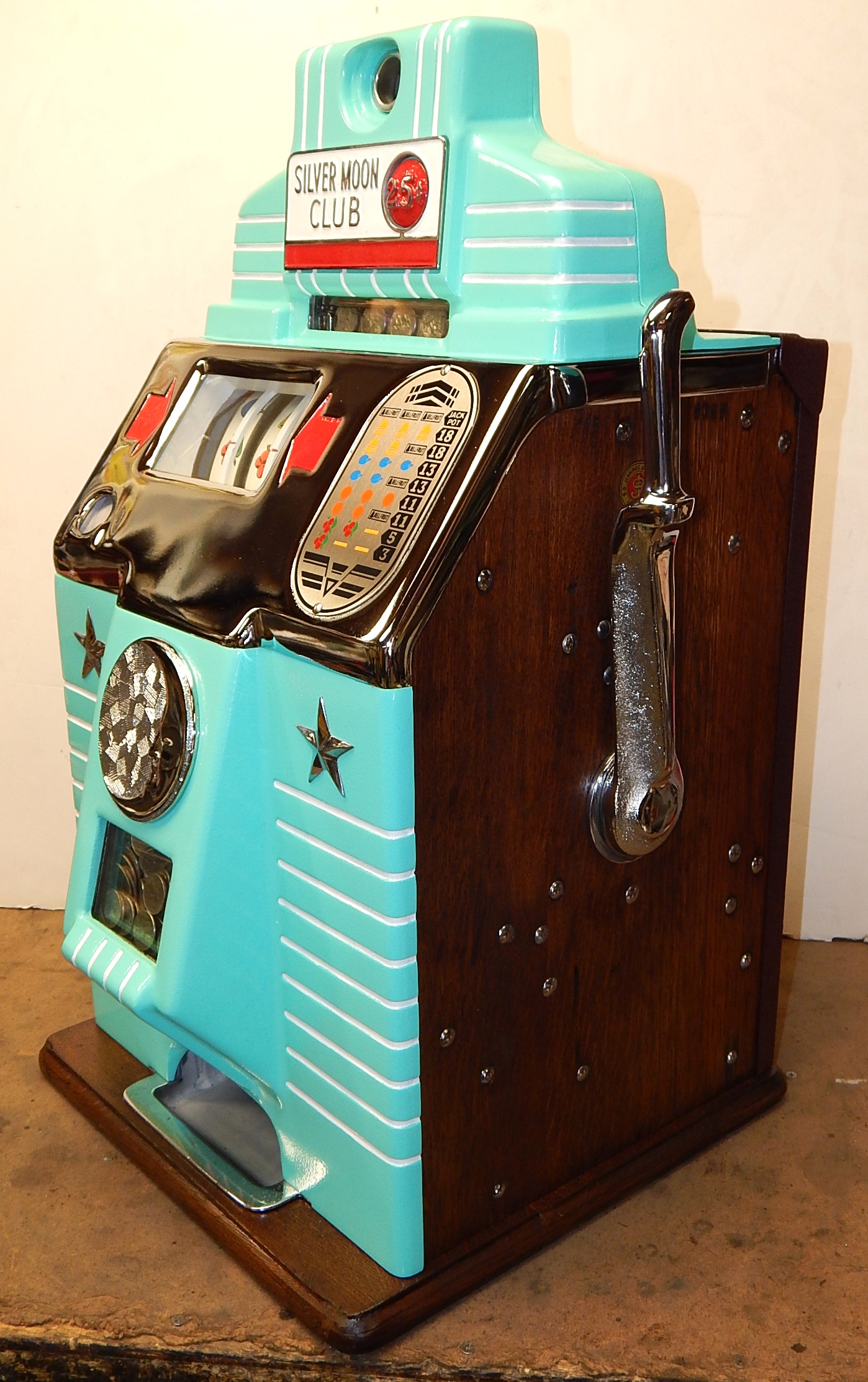 1941 Jennings Silver Moon Club Chief, 25 cent. restored back to the original colors with new triple chrome plating. The chrome is 9.9 out of a 10. on this machine. Plays nice. Original cash box, All oak cabinet. new award card, original back door with original ODJ lock and key. Reel strips are replacement. 3-5 pay out. If you are looking for a super nice quarter machine, here you are.