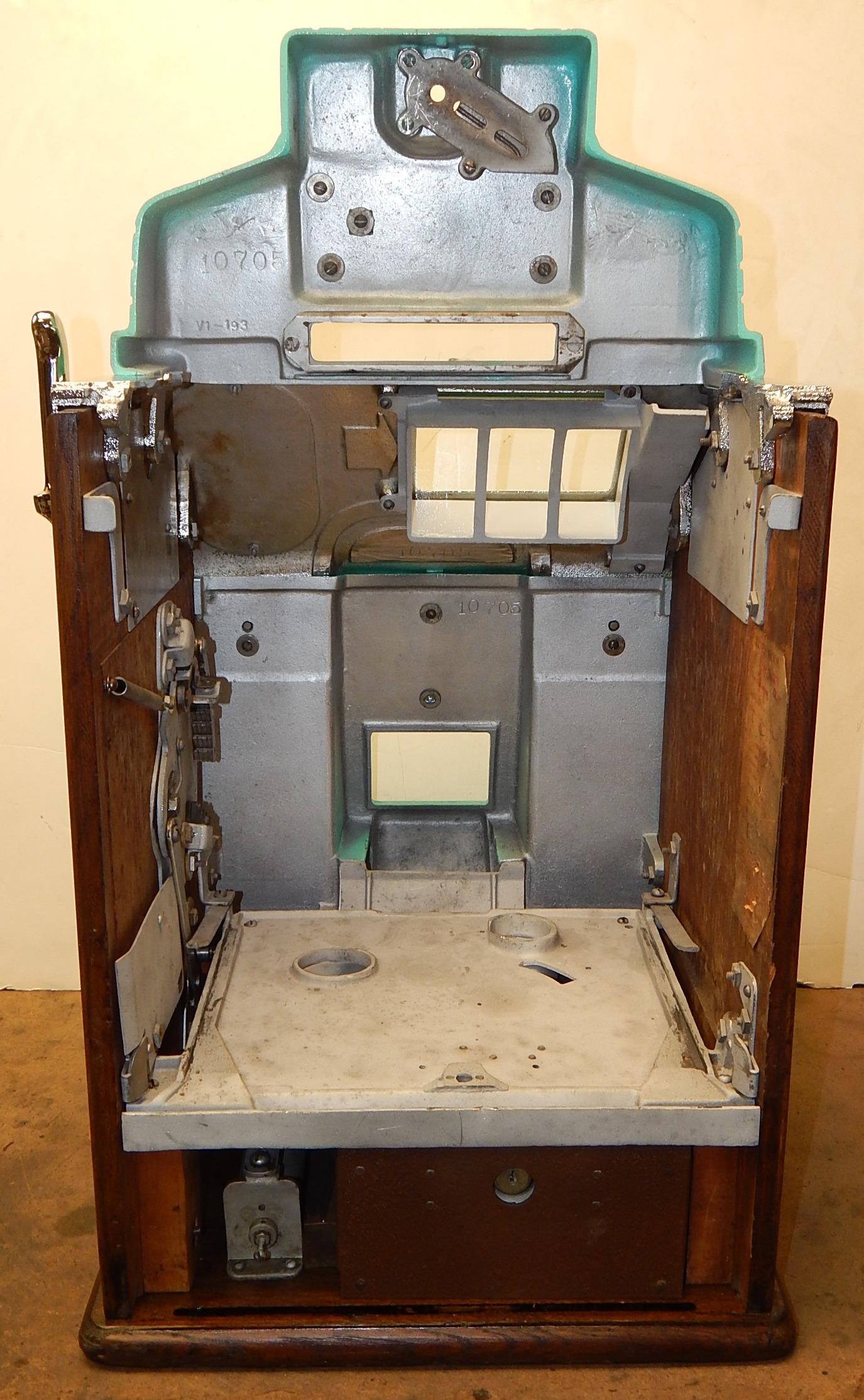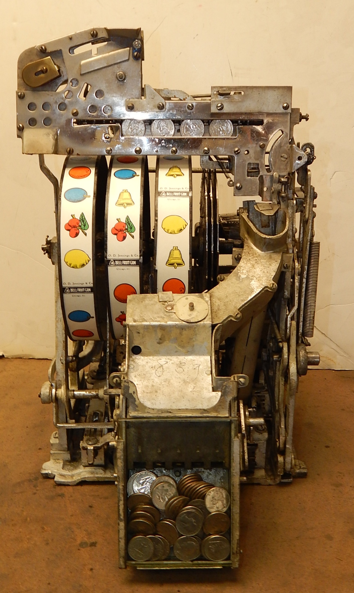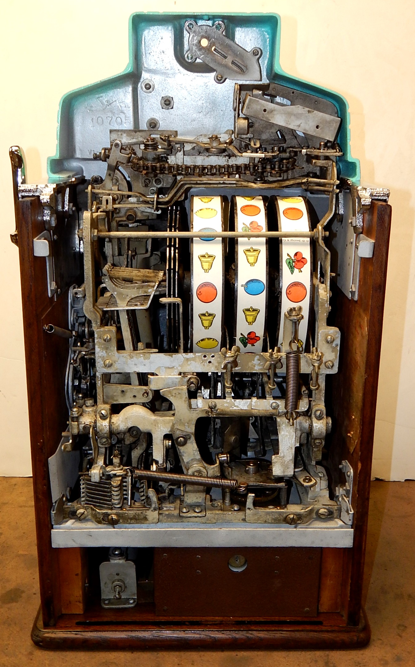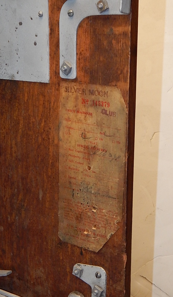 1941 Jennings Silver Moon Club Chief, 25 cent. restored back to the original colors with new triple chrome plating. The chrome is 9.9 out of a 10. on this machine. Plays nice. Original cash box, All oak cabinet. new award card, original back door with original ODJ lock and key. Reel strips are replacement. 3-5 pay out. If you are looking for a super nice quarter machine, here you are.