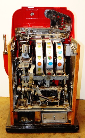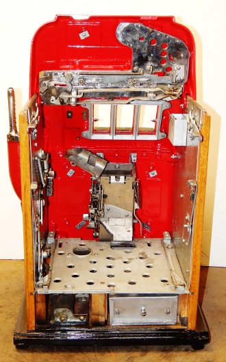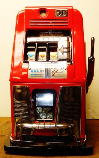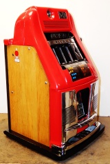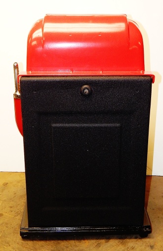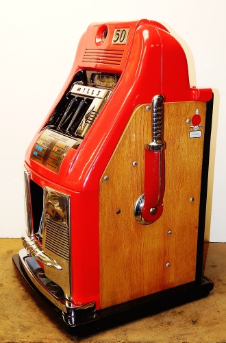 Mills 1959 Hi-Top 50 cent, another large coin machine. Powder coated Gloss Red trimmed in black. All the trim on this machine has been polished. Original back door with new lock two keys, cashbox, new reel strips, new award card, very nice oak cabinet. Plays very easy.