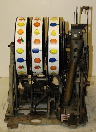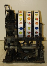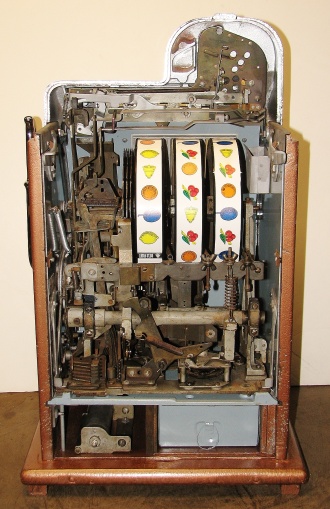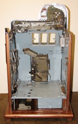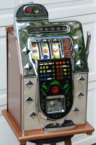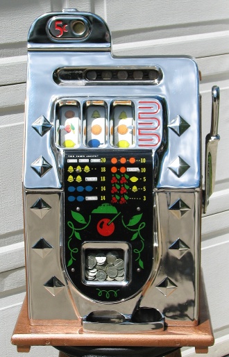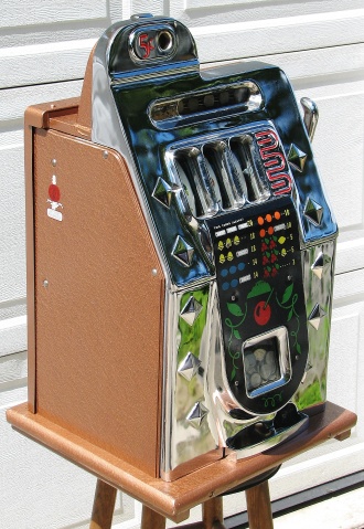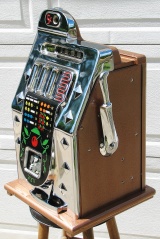 Mills 1946 Diamond Front 5 cent "Chrome". This is a very nice machine restored back to the original chrome finish. Cabinet painted back to the original copper tone hammer. Jack pot with reserve, original back door. lock with one key, original cash box. Plays very easy, 3-5 payout.