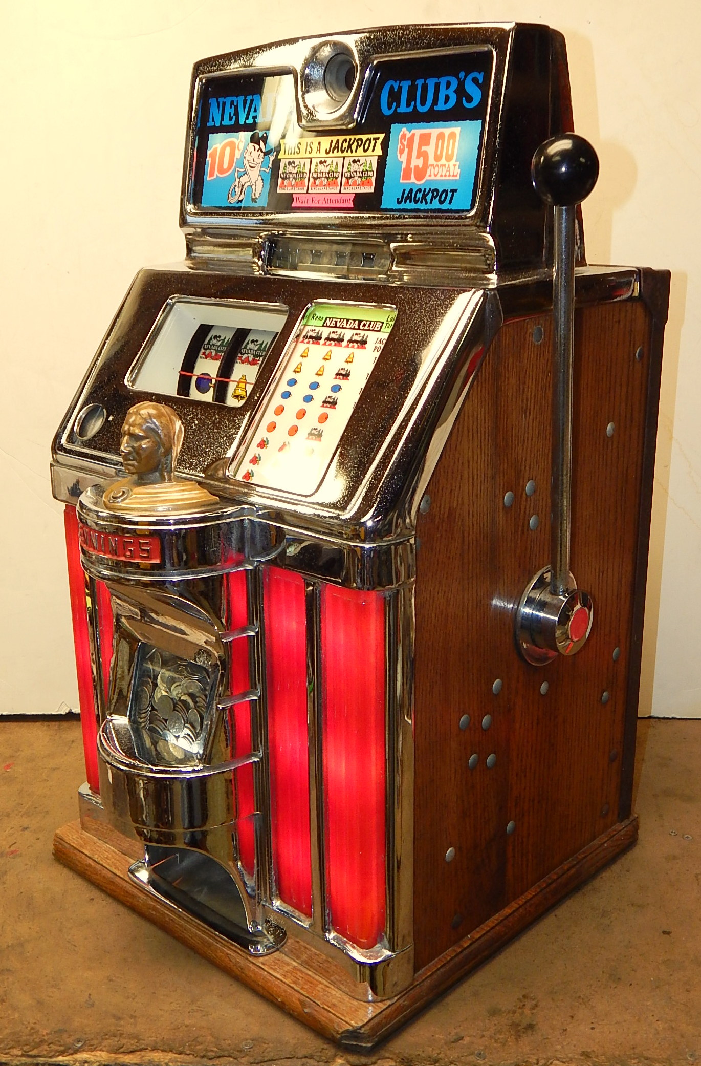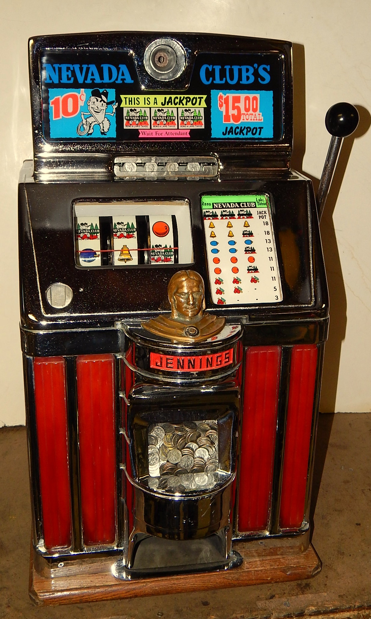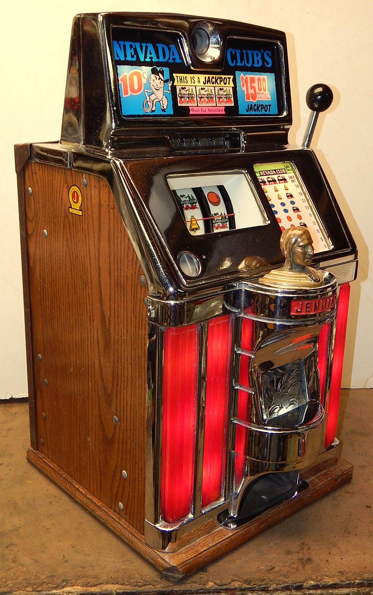 1959 Jennings (lite-up) Nevada Club 10 cent, with front-load functioning jackpot, original back door with Ace lock. Has red plastic at the bottom. This machine is in original condition other then the top casting being chrome plating 9 out of an 10. The cabinet is made oak, new cash box, original reel strips, original back door, ace lock. The machine plays very easy and pays as it should.