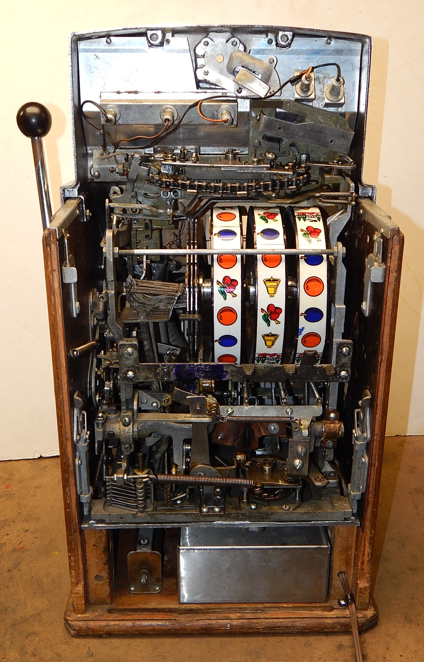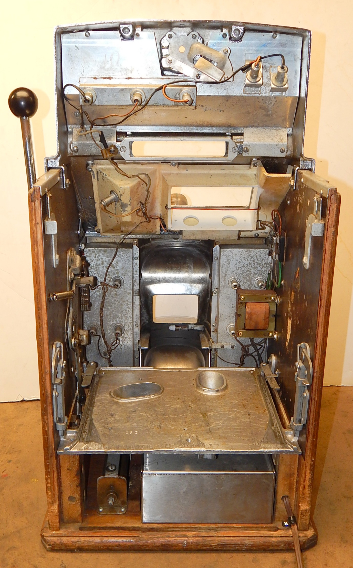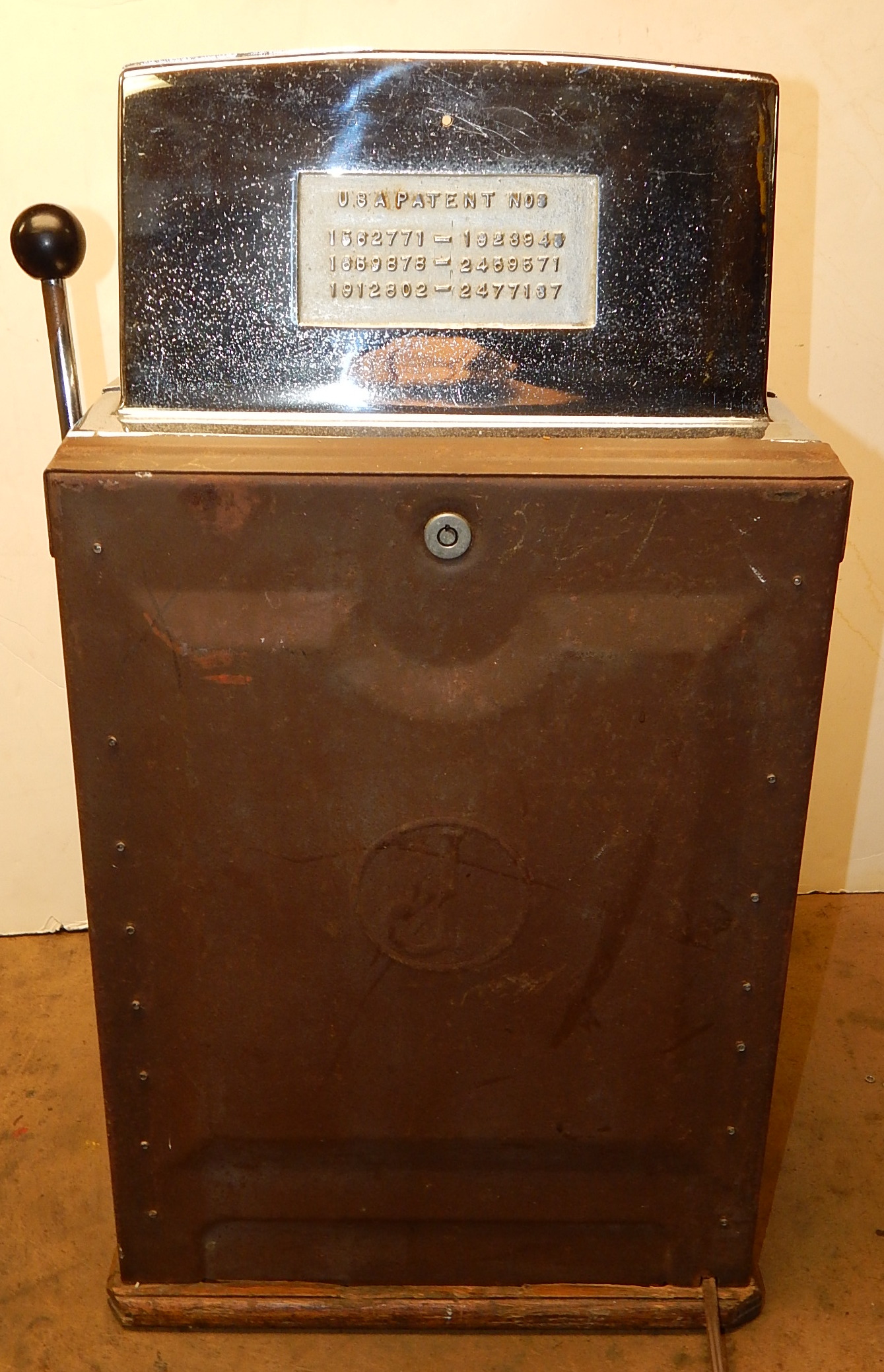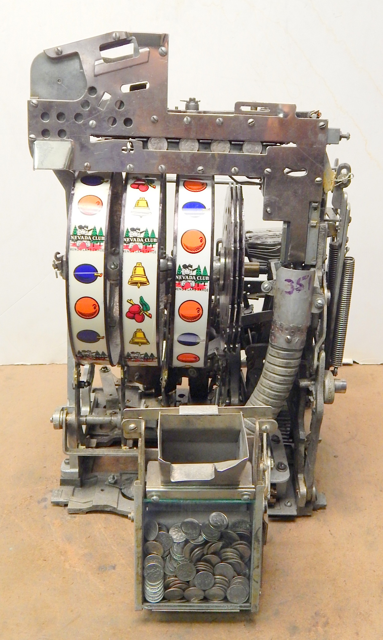 1959 Jennings (lite-up) Nevada Club 10 cent, with front-load functioning jackpot, original back door with Ace lock. Has red plastic at the bottom. This machine is in original condition other then the top casting being chrome plating 9 out of an 10. The cabinet is made oak, new cash box, original reel strips, original back door, ace lock. The machine plays very easy and pays as it should.