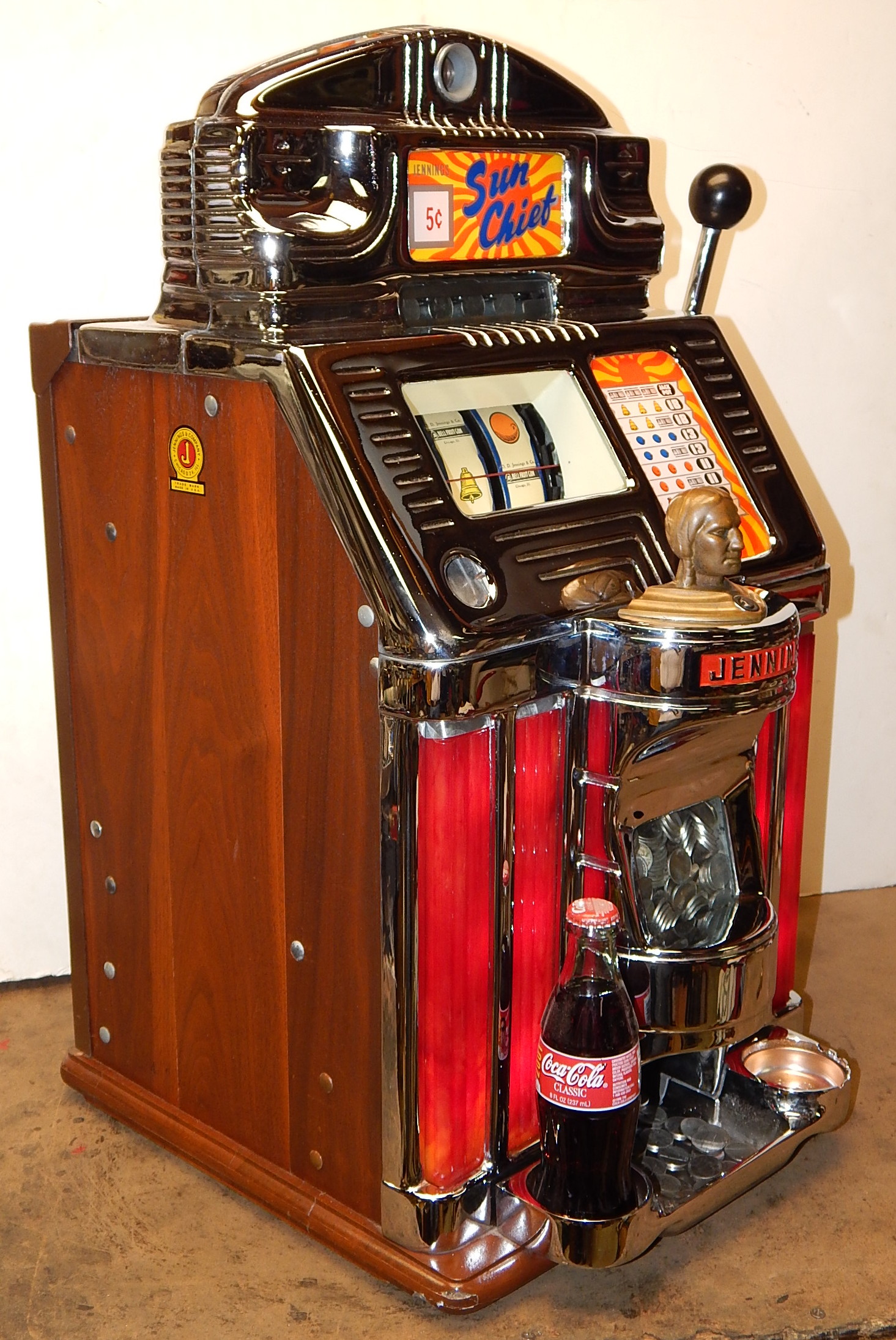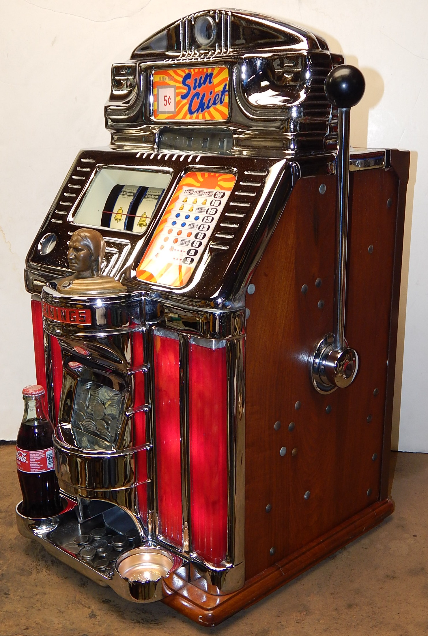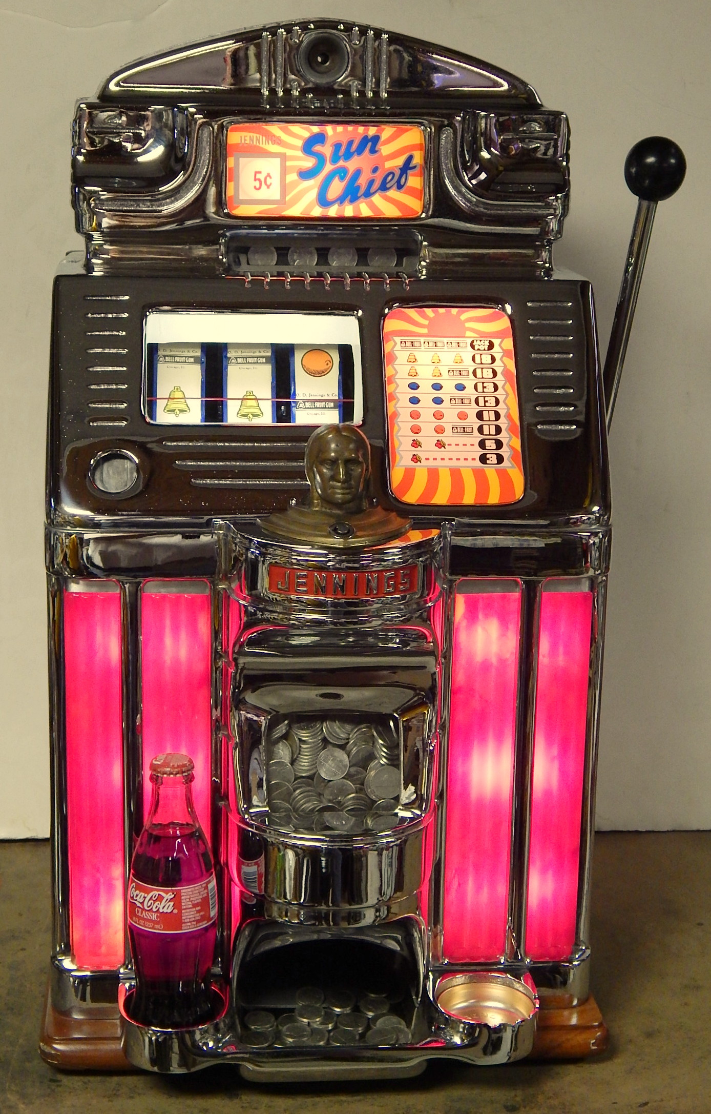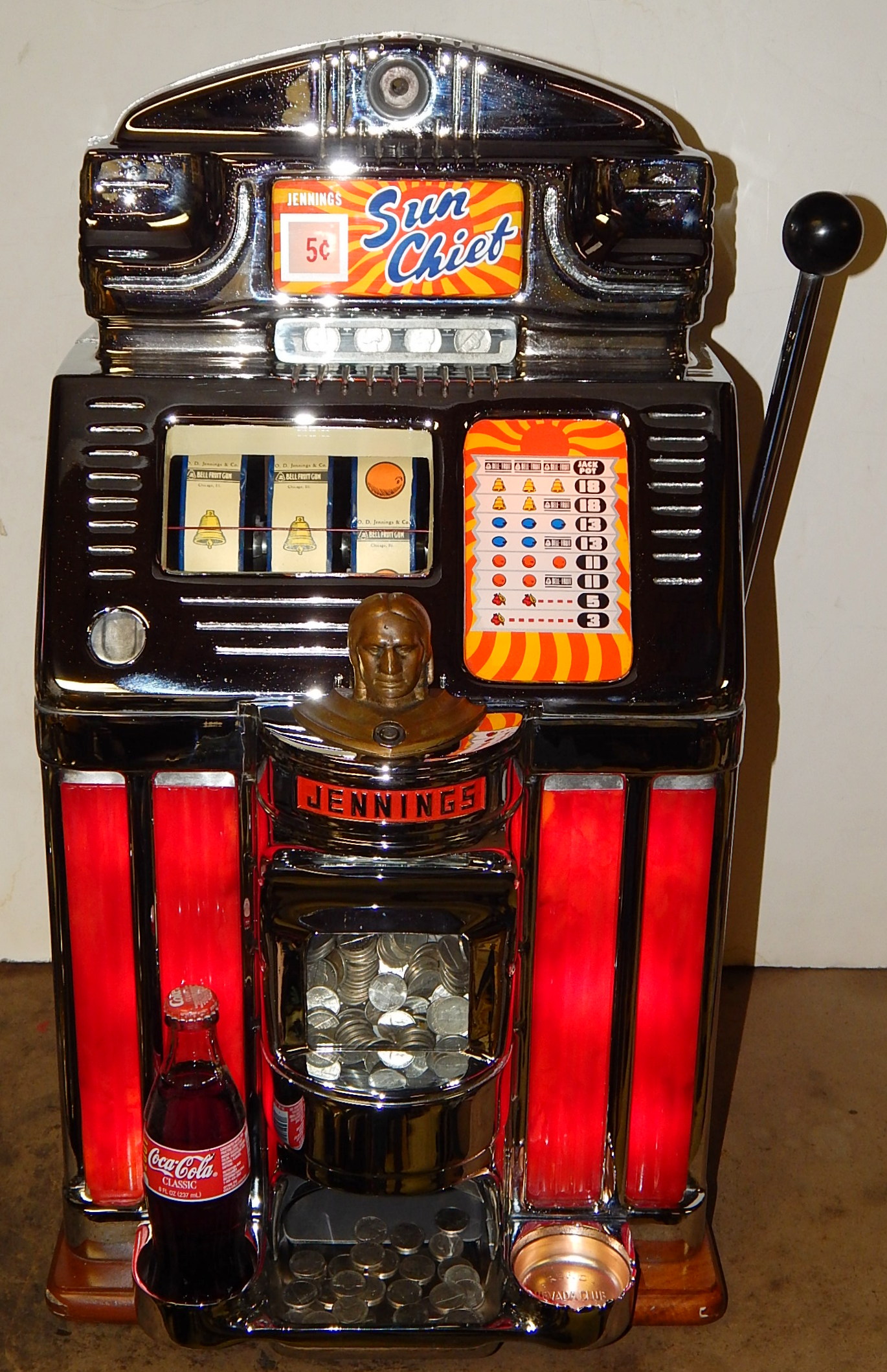1948 Jennings Sun Chief "Light-Up" 5 cent. Restored machine, with RED plastic, new chrome on this machine is 9 out of 10. Original cash box, original back door with Ace lock and two keys, new reel stripes. Cabinet on this machine is also in mint condition. If you are looking for a nice restored light up machine here it is.