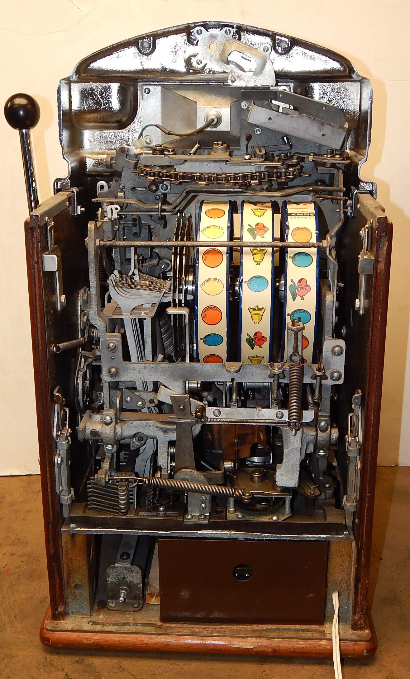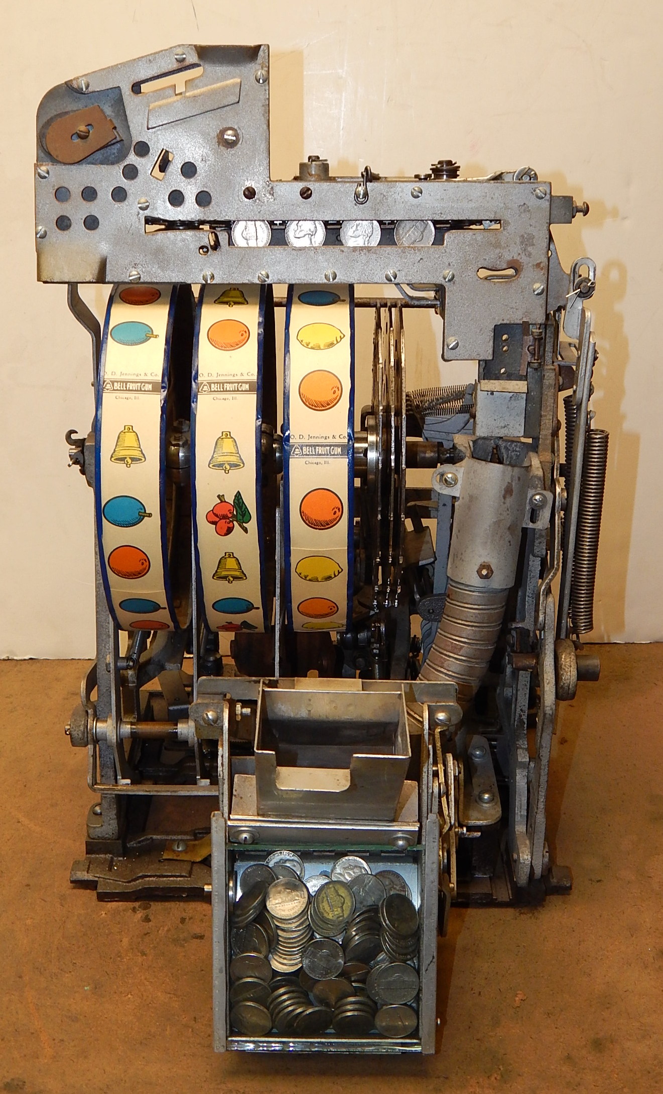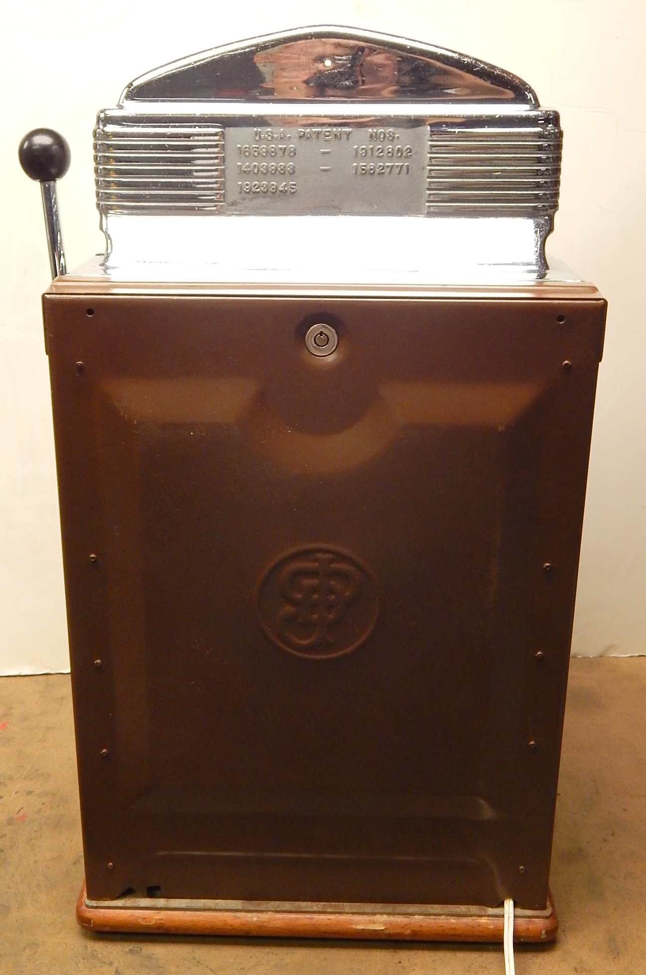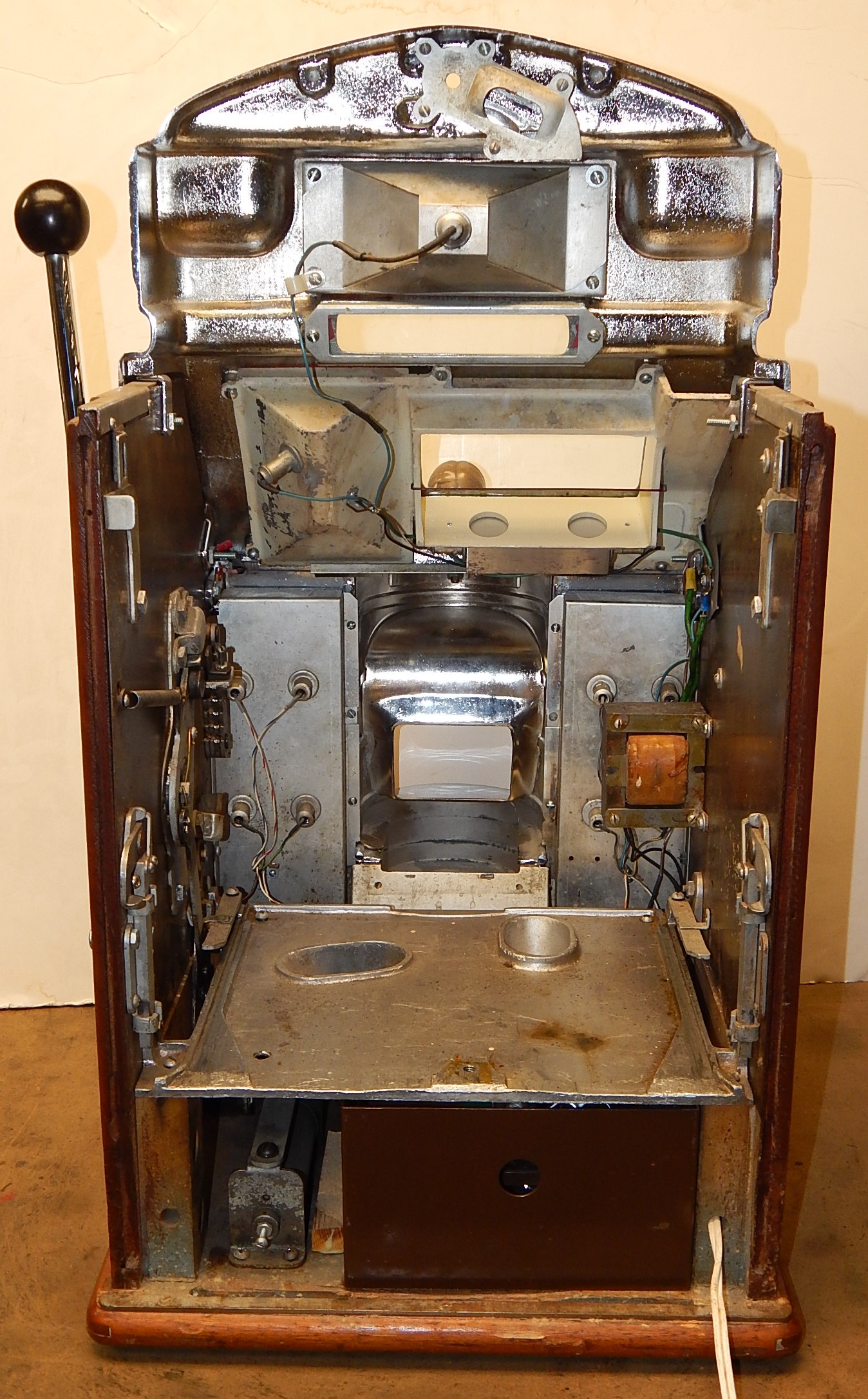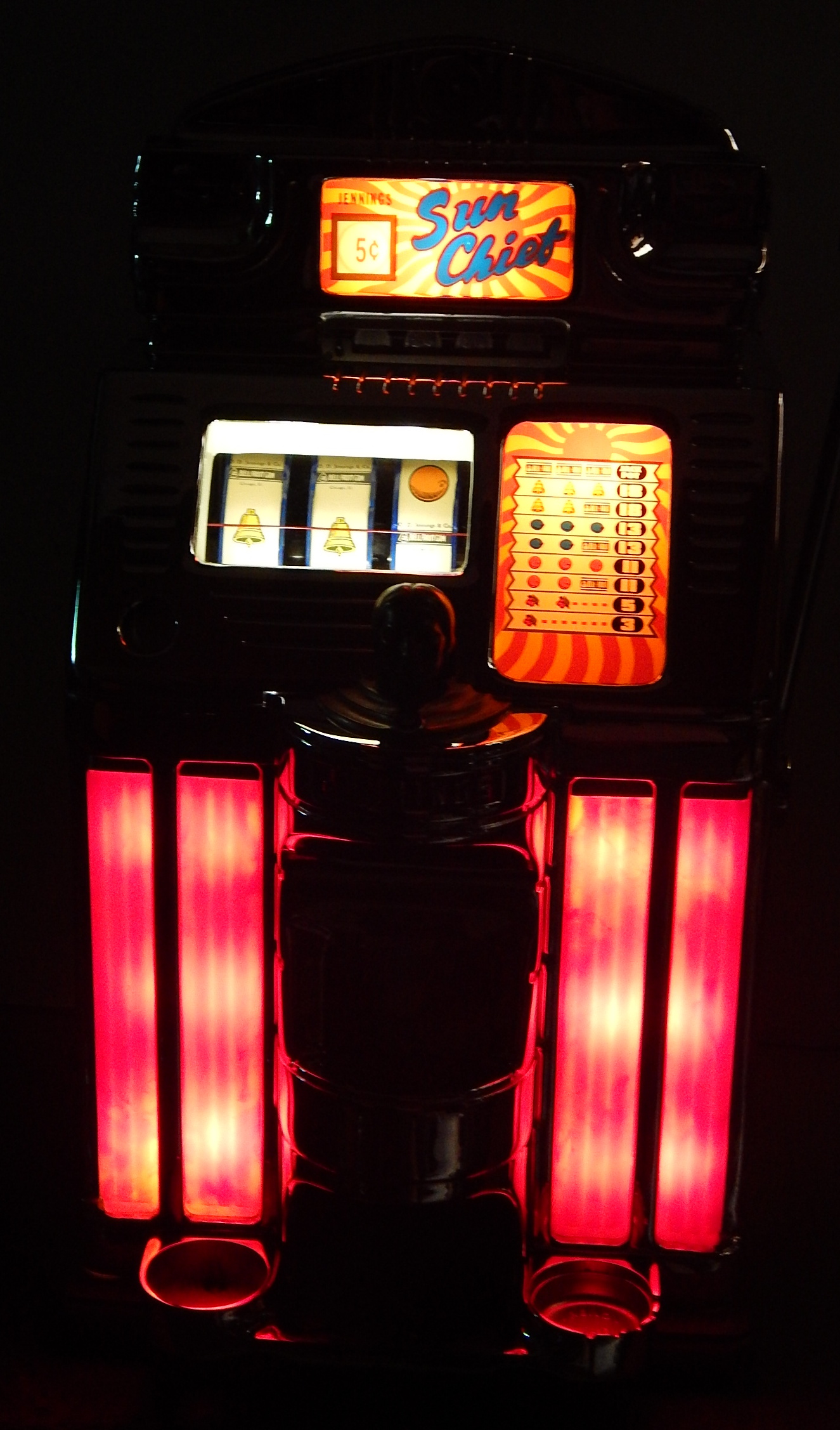 1948 Jennings Sun Chief "Light-Up" 5 cent. Restored machine, with RED plastic, new chrome on this machine is 9 out of 10. Original cash box, original back door with Ace lock and two keys, new reel stripes. Cabinet on this machine is also in mint condition. If you are looking for a nice restored light up machine here it is.