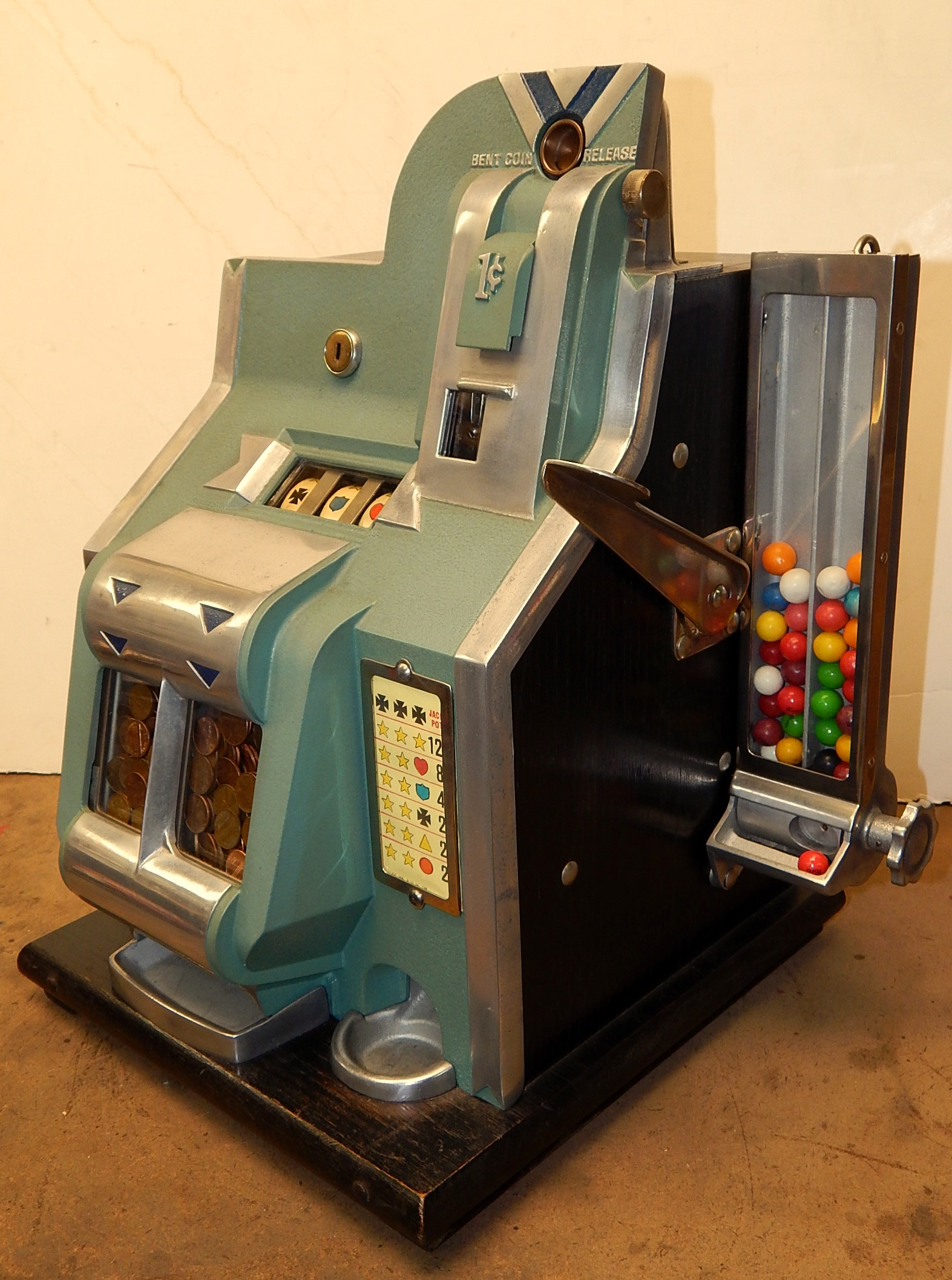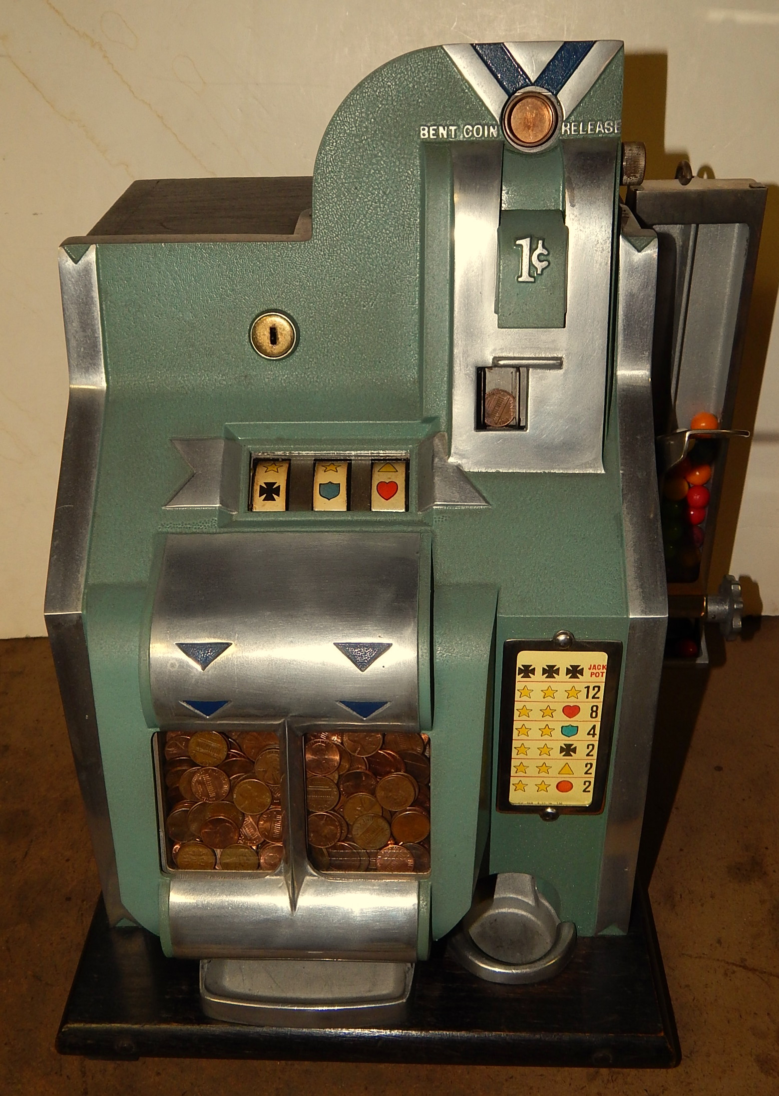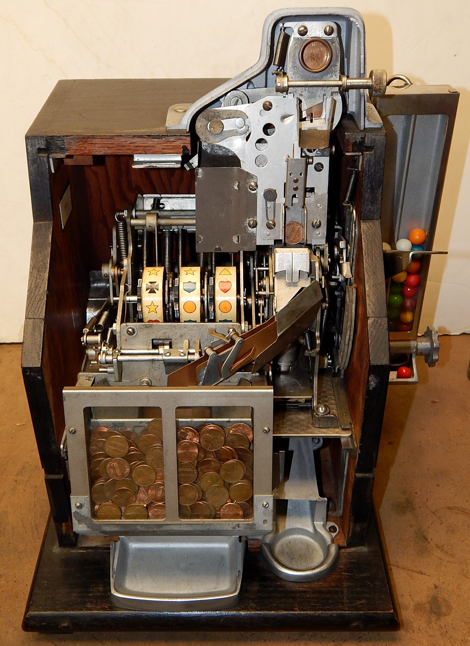1935 Mills QT "Chevron" Penny with side Gumball vendor. This is a very nice machine. Twin Jackpots, original back door, original cash box, original award card,original reel strips, original Mills front and back door locks with two Mills keys each, very nice original oak cabinet. Also has the hard to find side Gumball Vendor. Plays very easy.