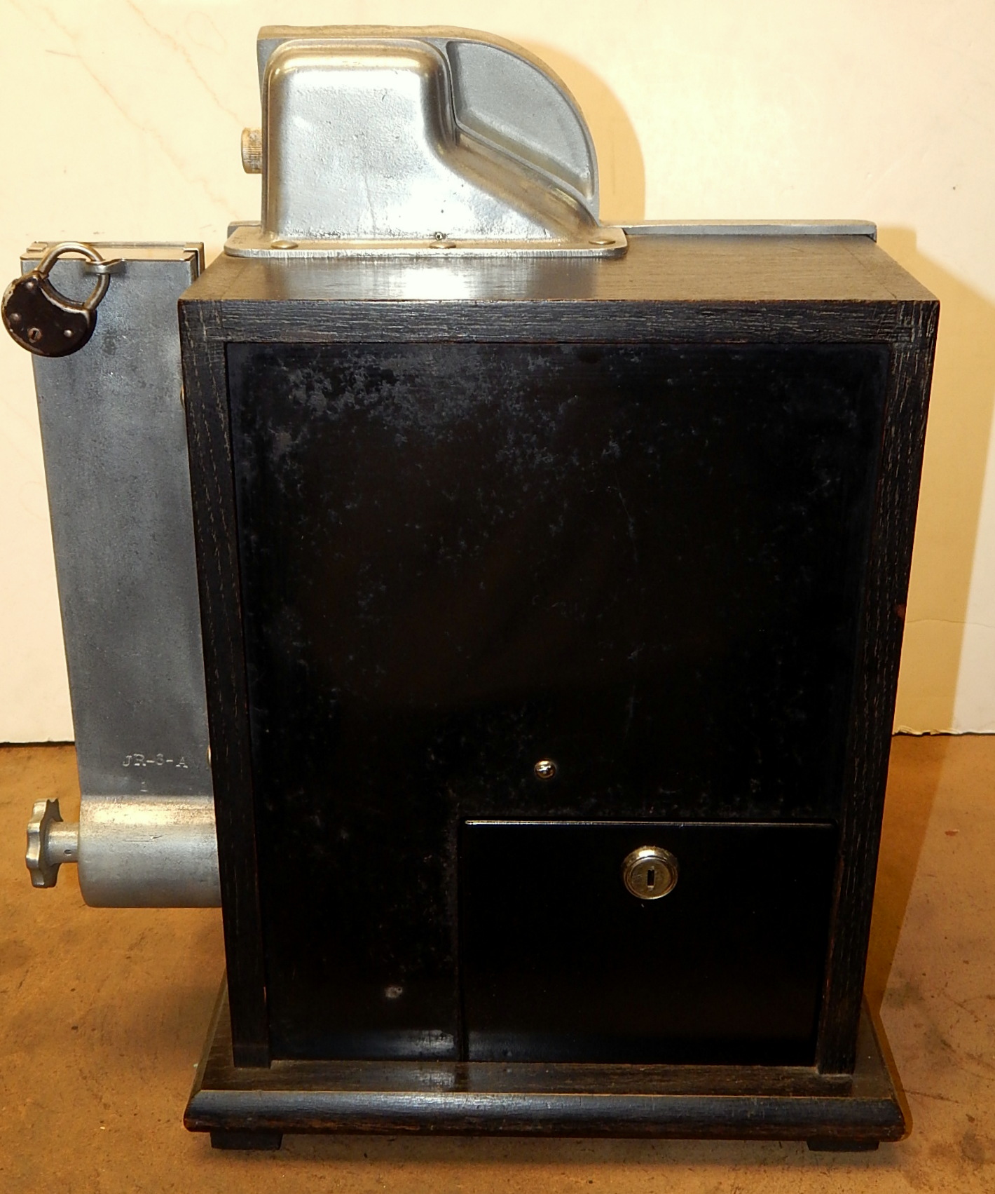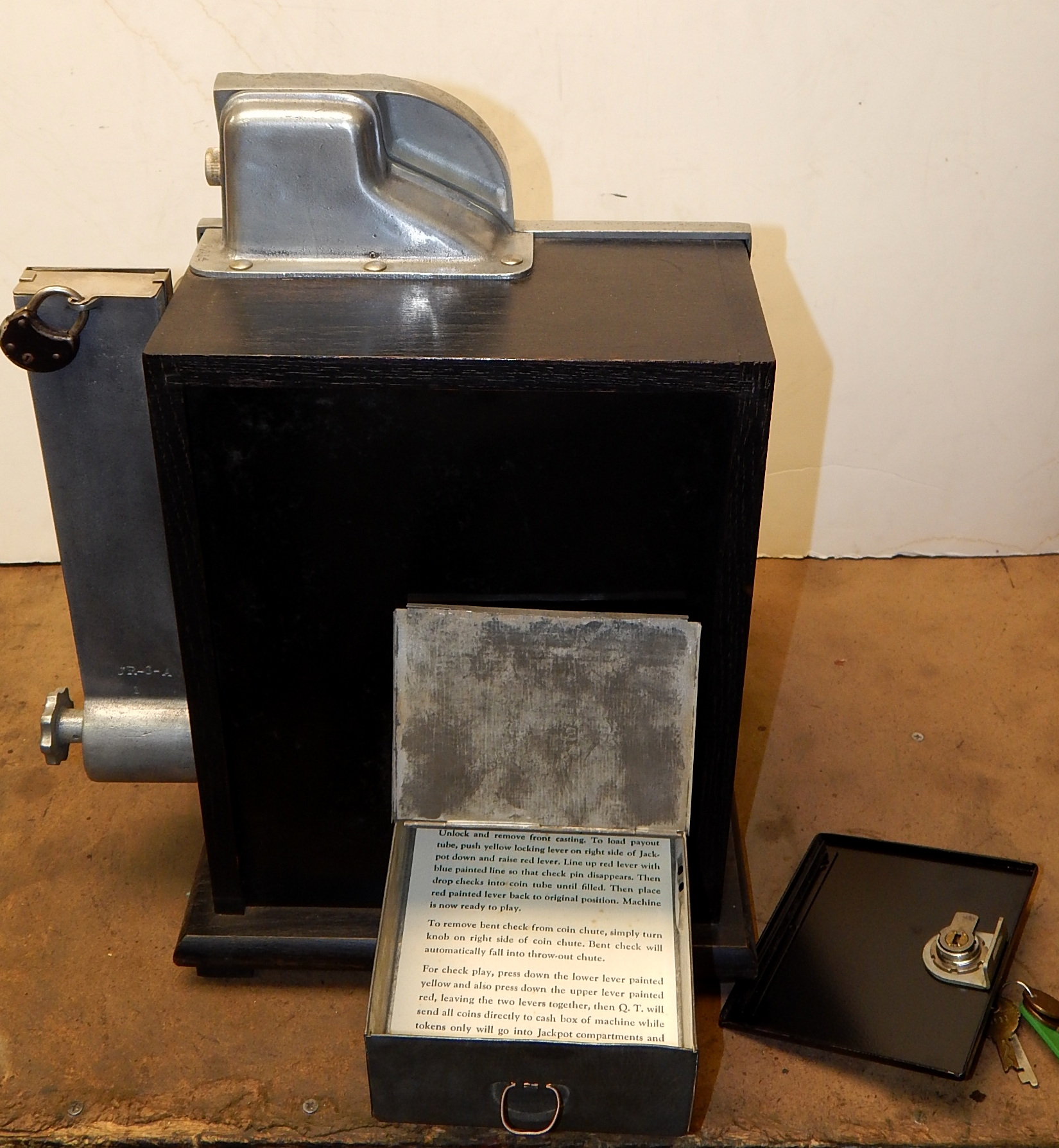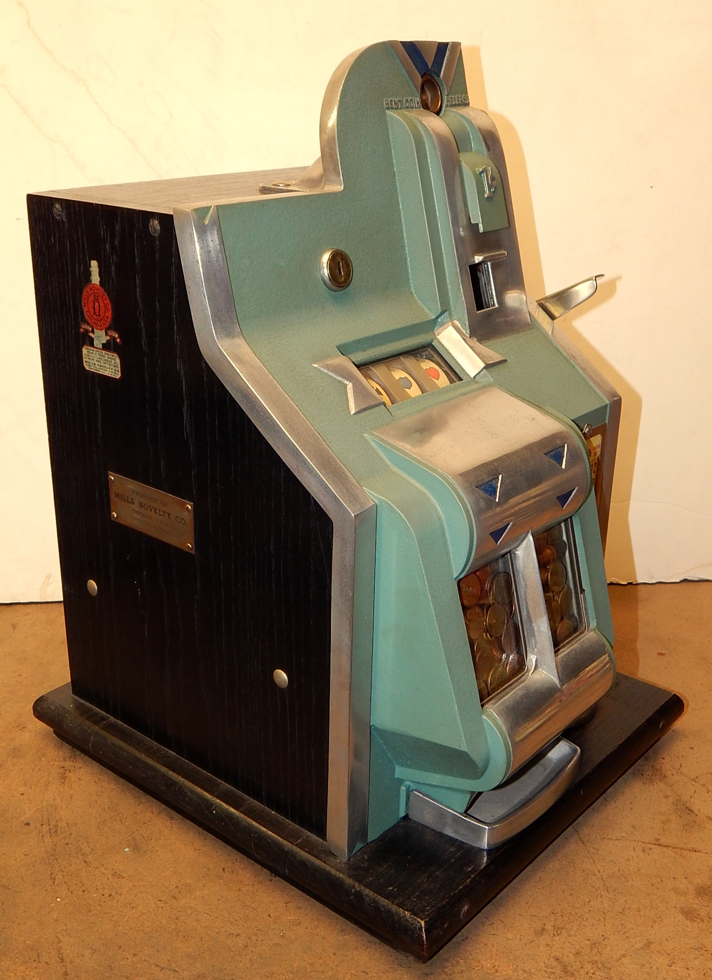 1935 Mills QT "Chevron" Penny with side Gumball vendor. This is a very nice machine. Twin Jackpots, original back door, original cash box, original award card,original reel strips, original Mills front and back door locks with two Mills keys each, very nice original oak cabinet. Also has the hard to find side Gumball Vendor. Plays very easy.