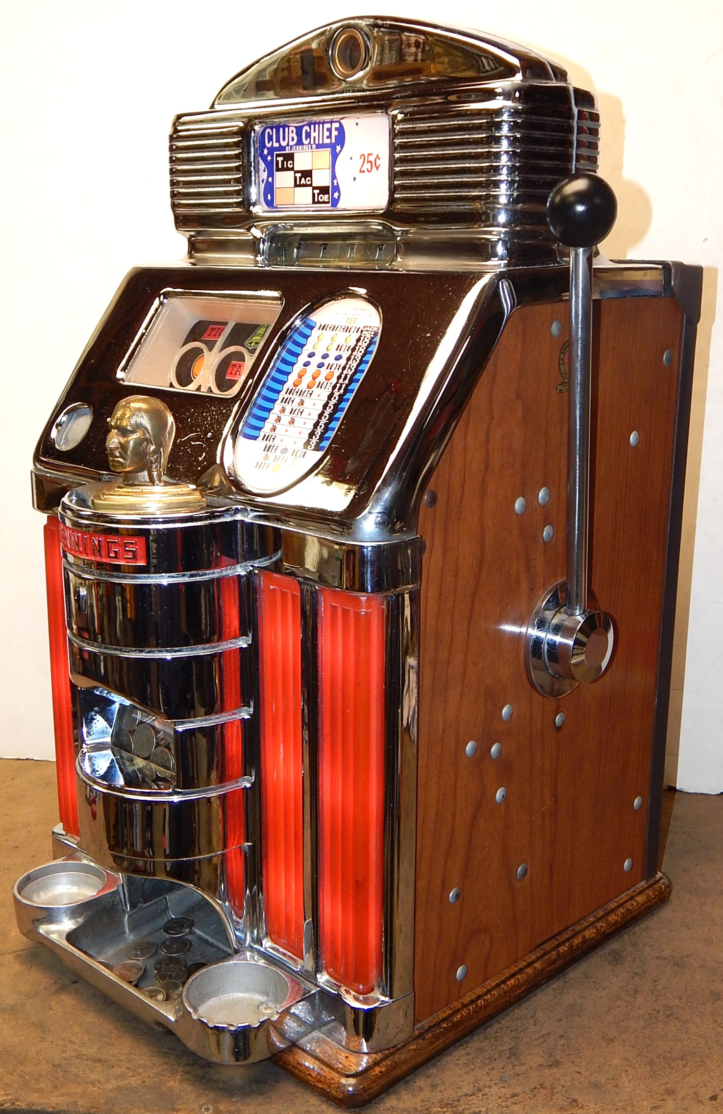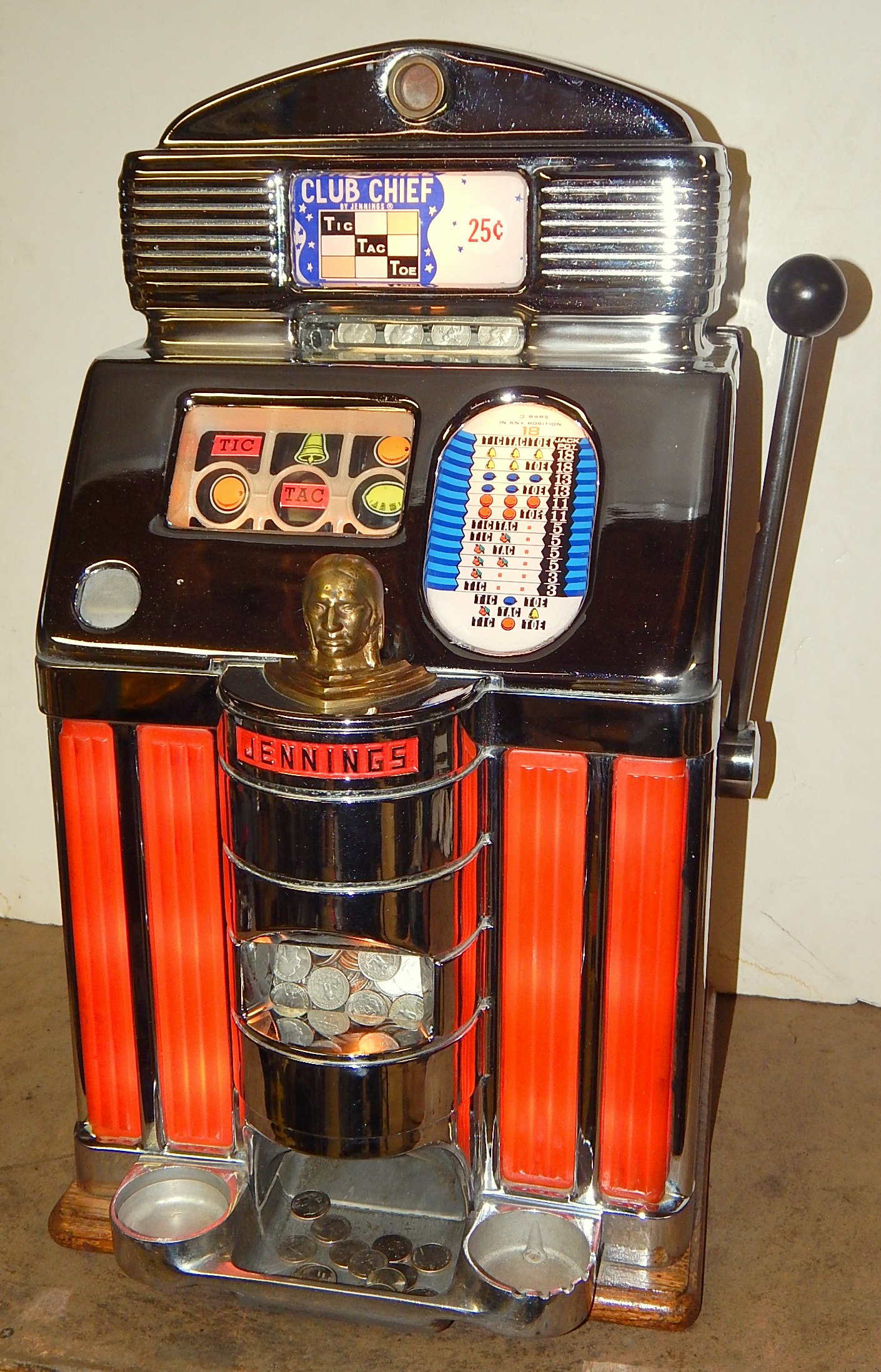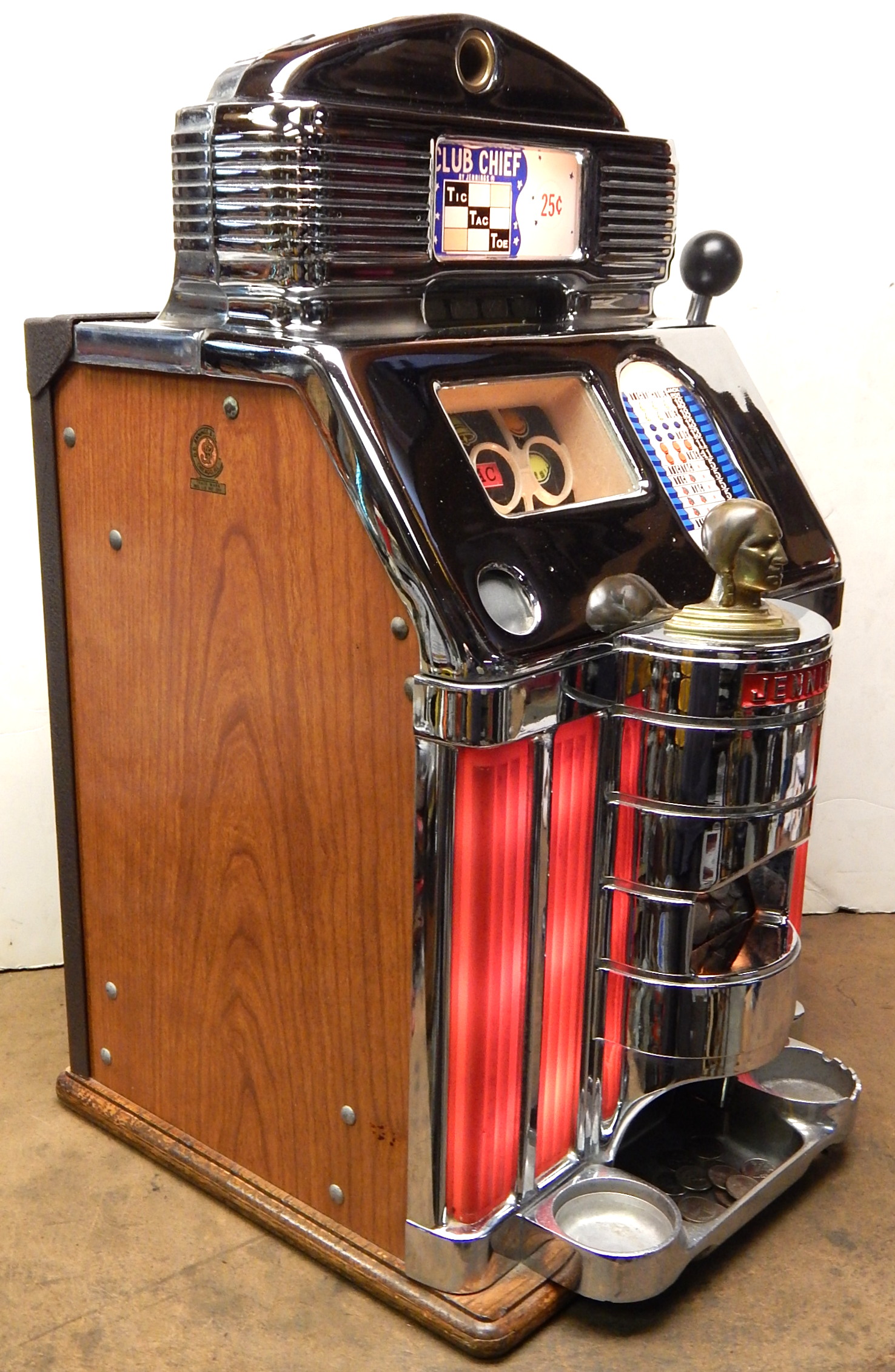 1964 Jennings Club Chief (lite-up) 25 cent, with the hard to find Glass and Ash tray money bowl. Functioning jackpot, original back door with lock and key. Has red plastic at the bottom. The chrome plating on this machine is 9 out of an 10. The machine plays very easy and pays as it should.