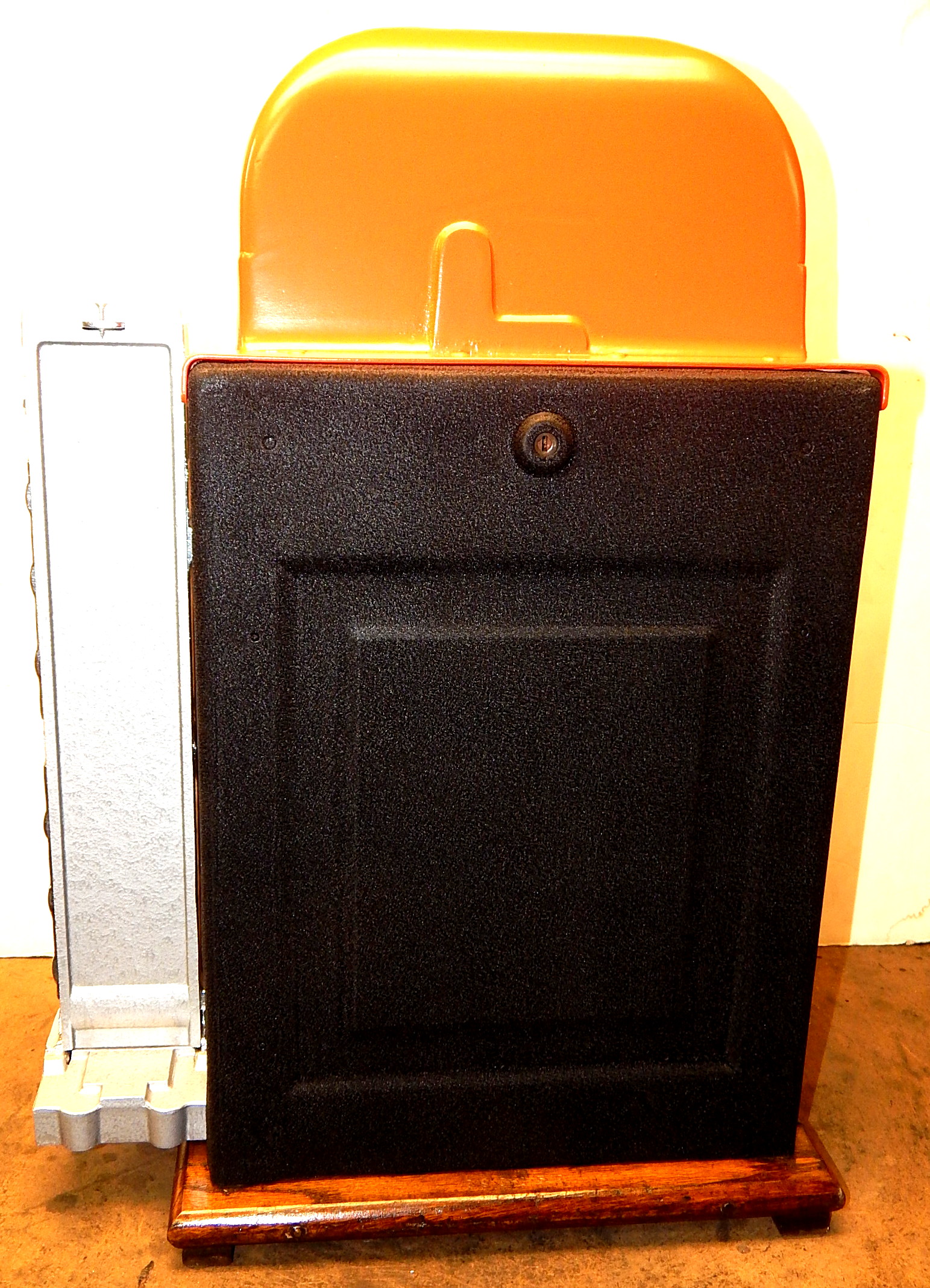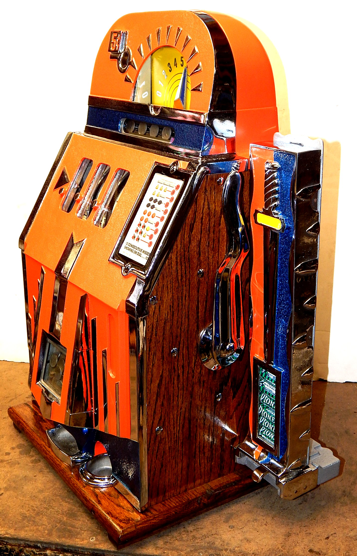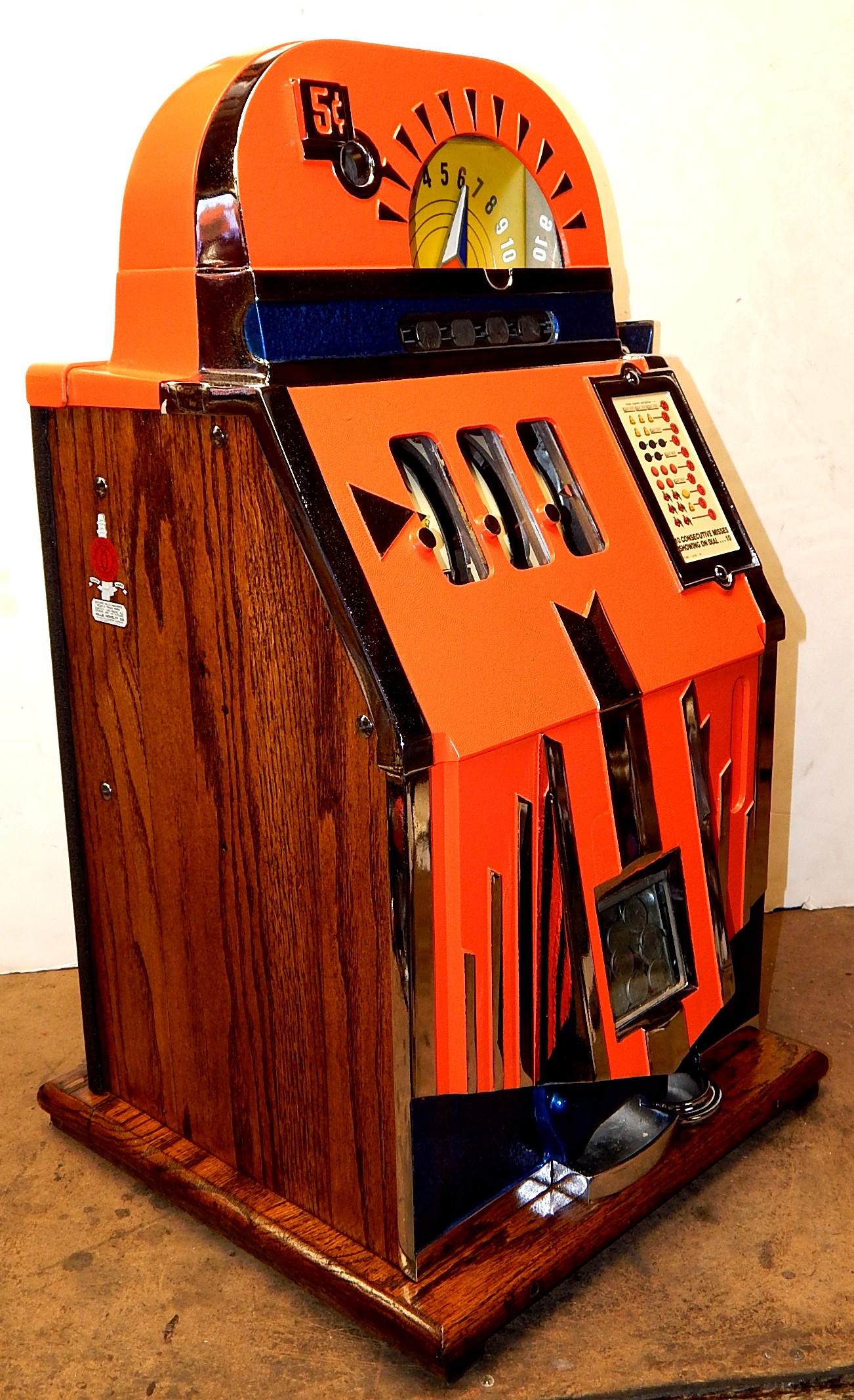 Mills 1936 Futurity 5 cent. With side vendor. Restored, casting were painted original colors orange, blue. New reel strips, original cash box with cashbox door Mills lock and key, original back door with original Mills lock and key. Nice original oak cabinet in excellent condition, plays and pays as it should. 3-5 pay out.