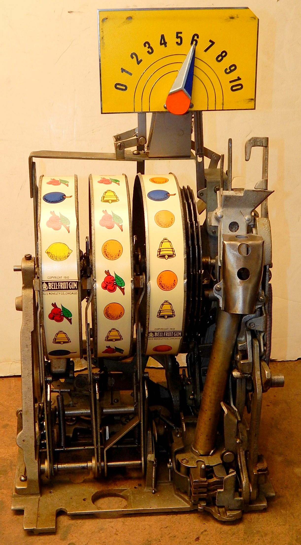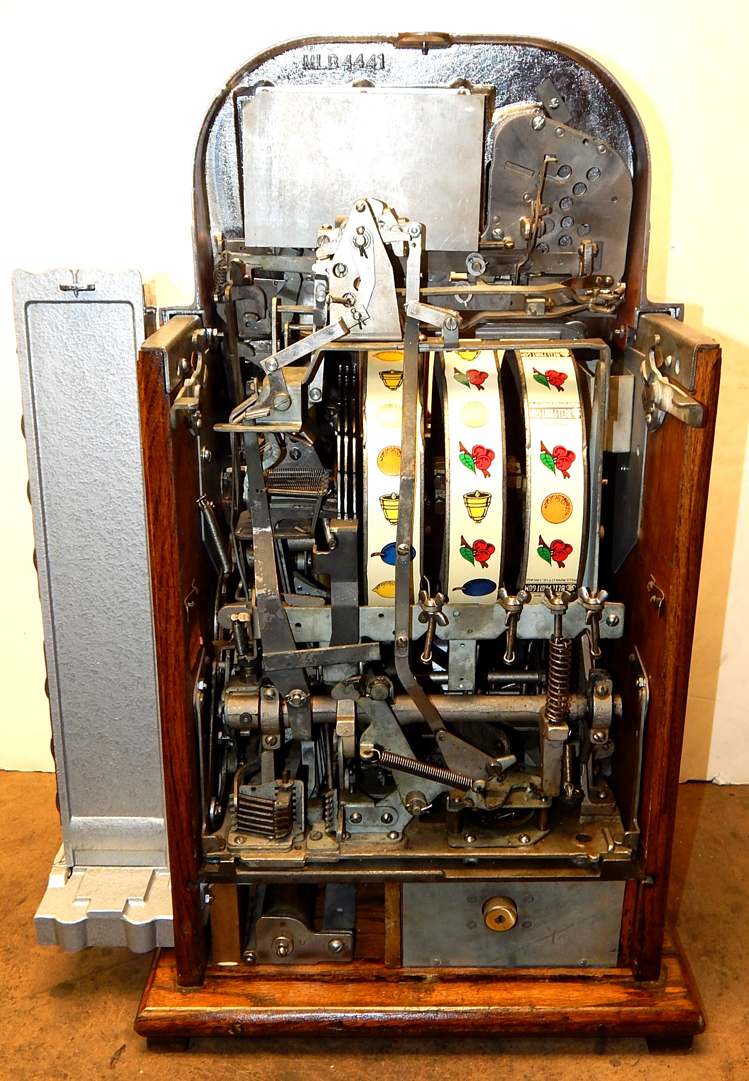 What players didn't realize the mechanism contained one of the most unique and innovative designs... it cheated! Even before the days of electronics the engineers at Mills worked out a way to almost guarantee you never reached 10 consecutive plays without a win. The mechanism could alter the reels to give cherry wins before the dial got to 10. The Mills Futurity was rumored to have been banned in many States including Vegas because of the cheat feature.
