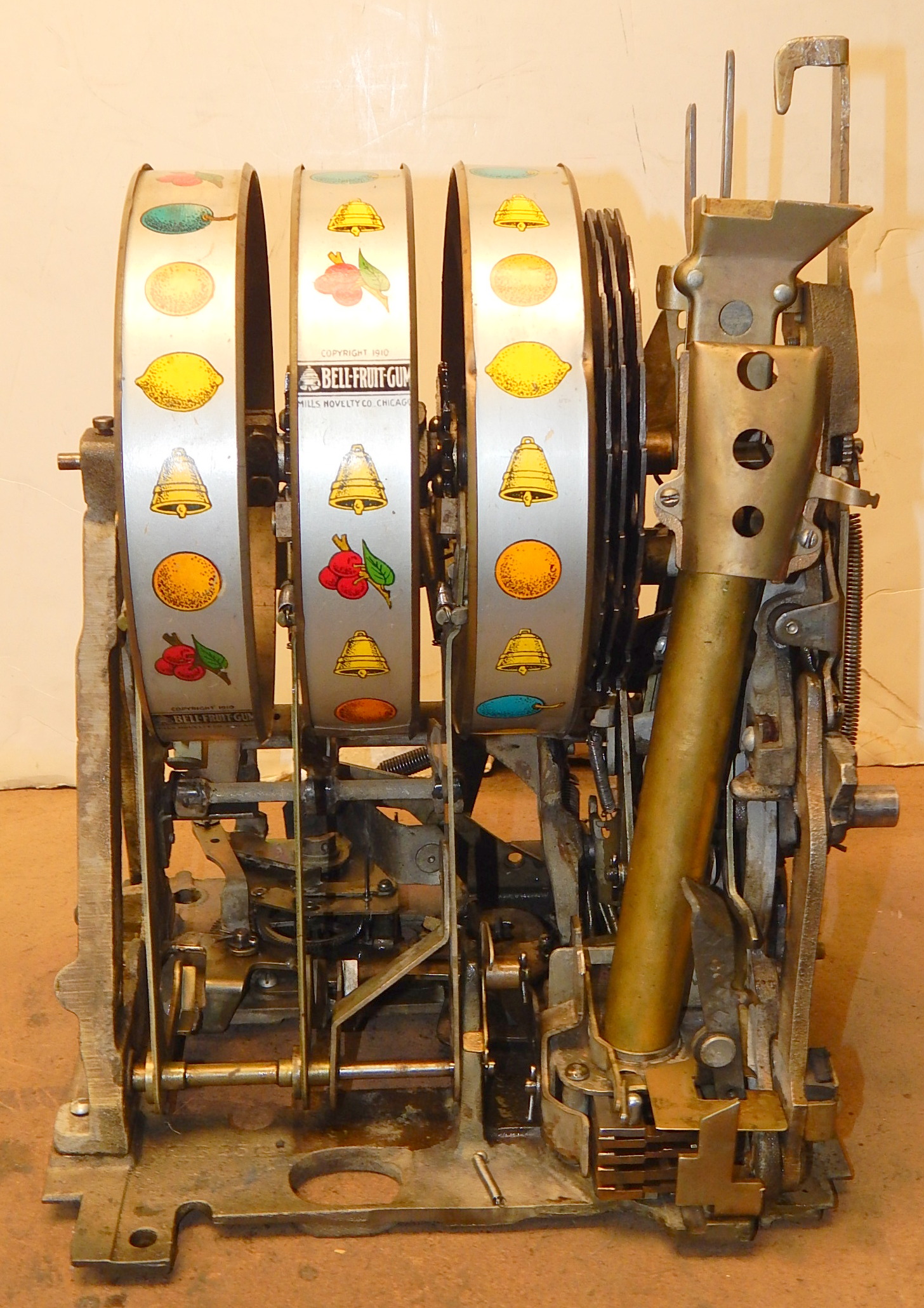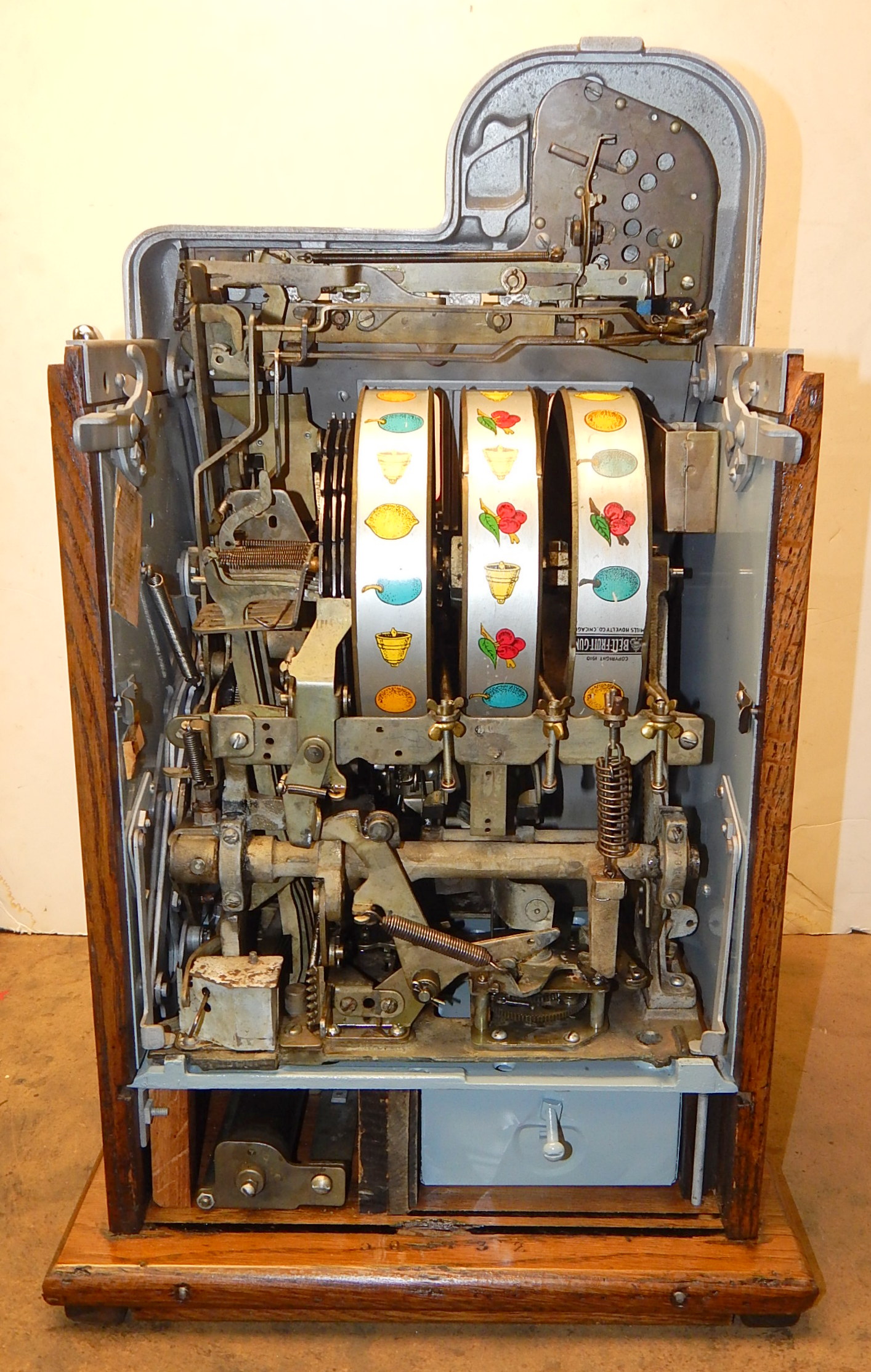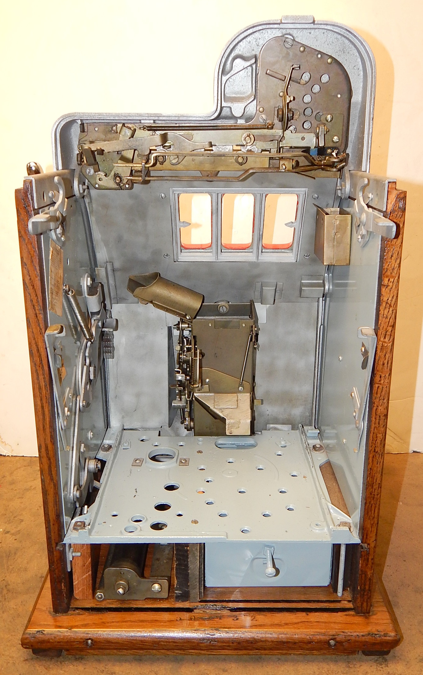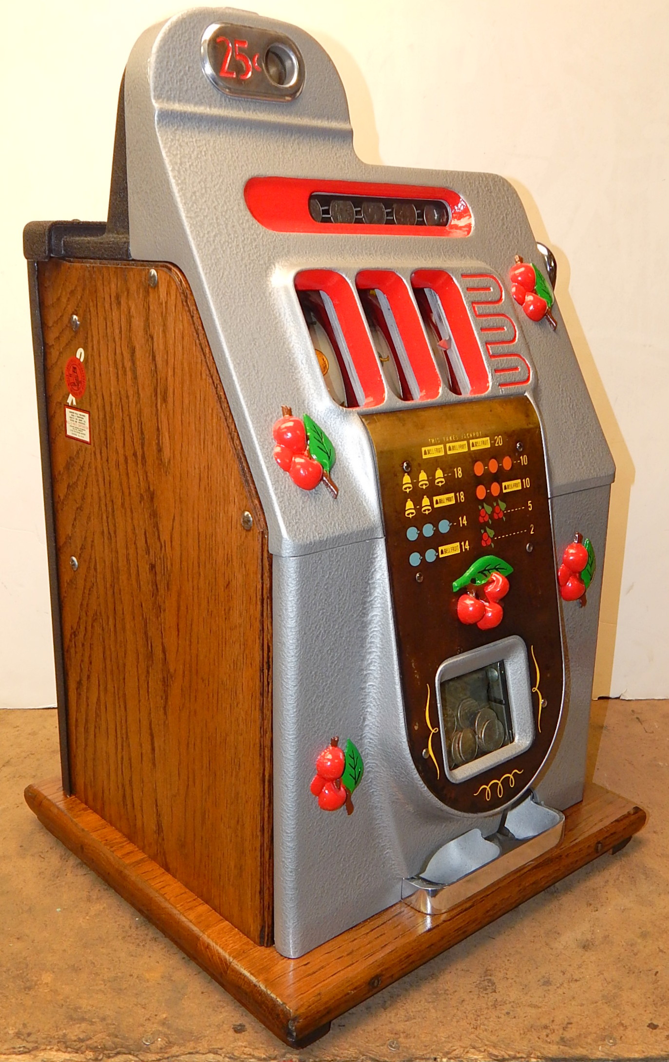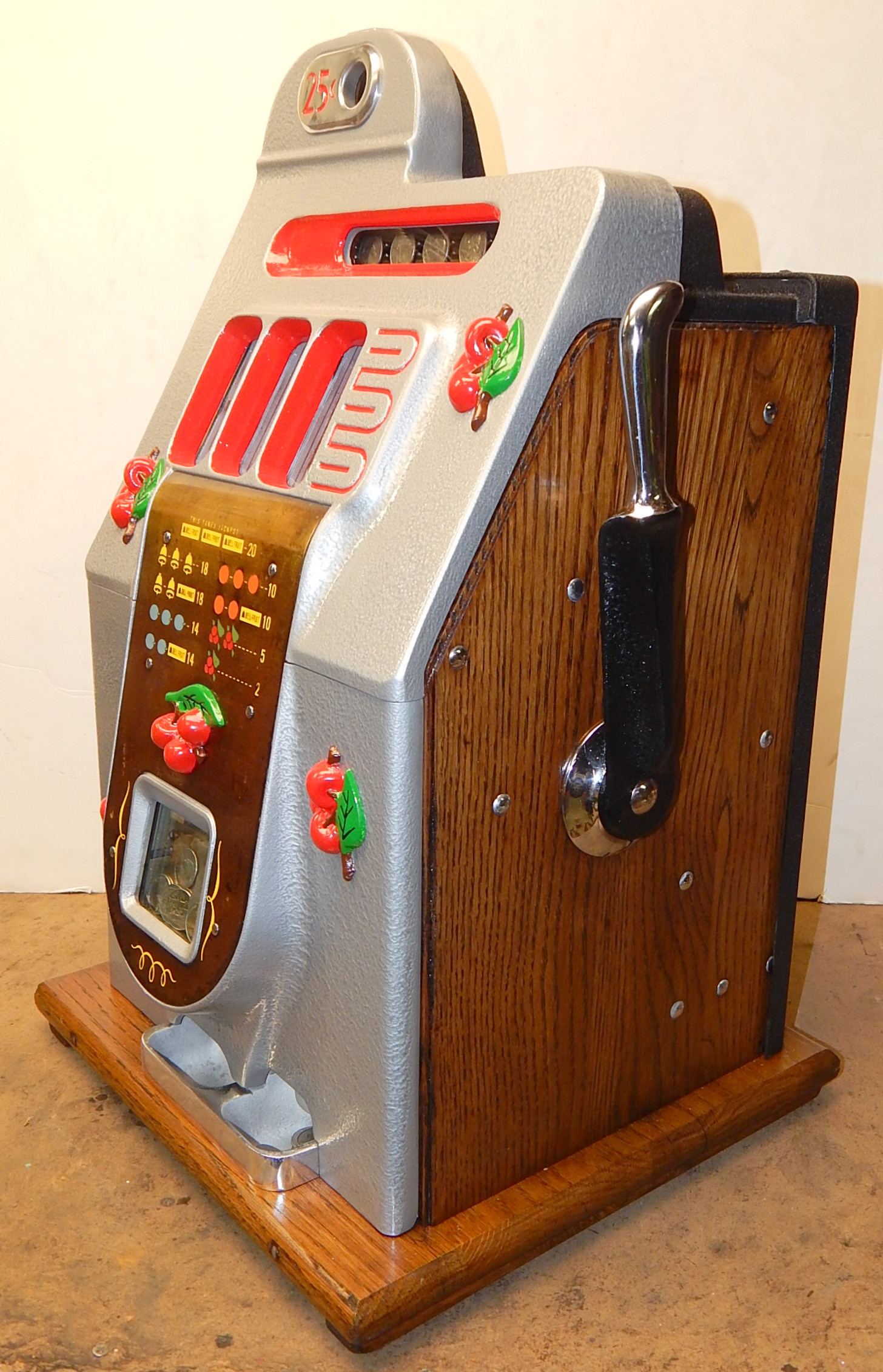 Mills 1946 Black Cherry 25 cent, restored. Hammer tone Silver, trimmed in red with black wrinkle finish back door. This is a very nice machine restored back to the original colors. Original award card, Original reel strips. Jackpot with reserve, Original back door with original Mills lock with one key, original cash box. Plays very easy.