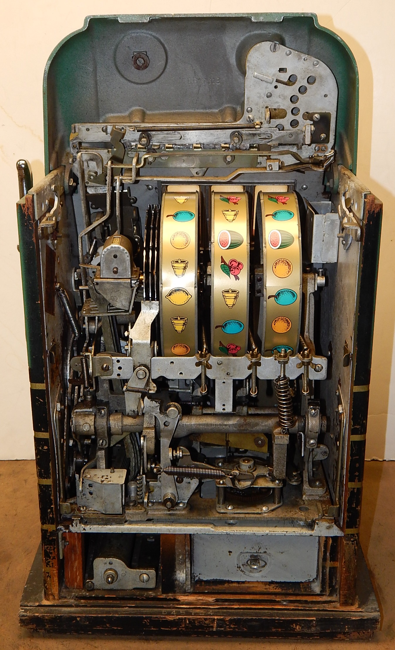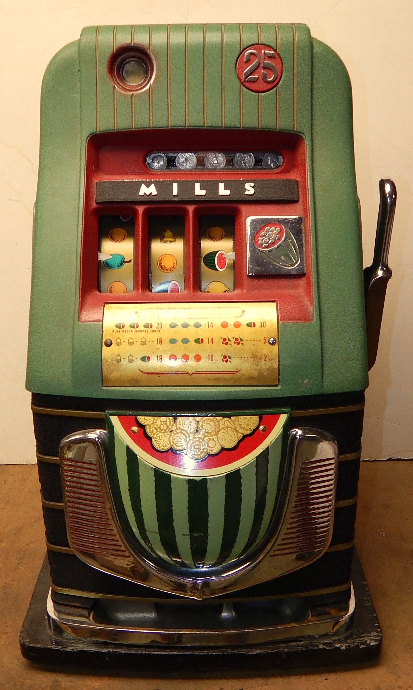 1947 Mills Melon Bell 25 cent ,in original condition, original cash box, award card, back door with Mills lock and key. Service and ready to go. Plays very easy.