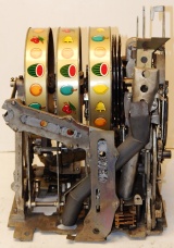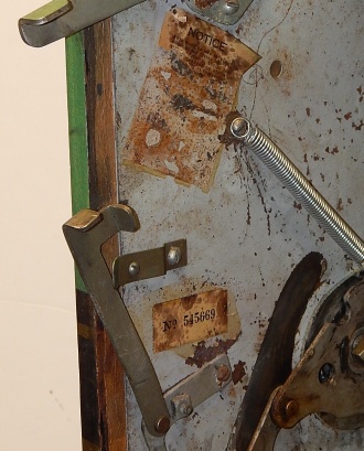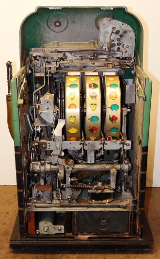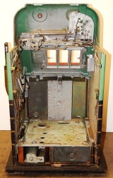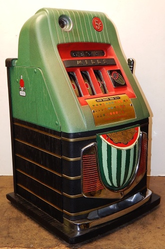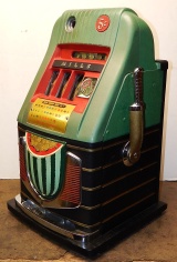 1948 Mills Melon Bell 5 cent, previously painted, original cash box, original award card, mint condition original reel strips, original back door with Mills lock and key. 3 original tokens. Plays very easy and pays as is should.