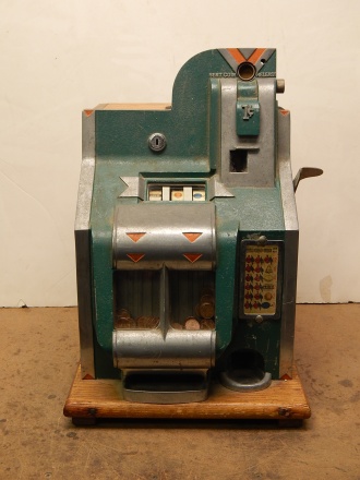 1935 Mills QT "Chevron" 5 cent. This is a very nice machine. Twin Jackpots, original back door, original cash box, original award card, original Mills front and back door locks with Mills keys. Plays very easy.