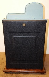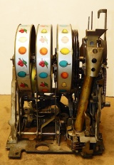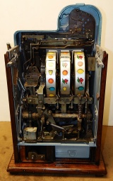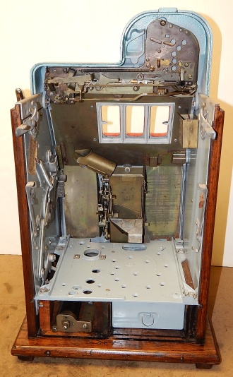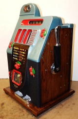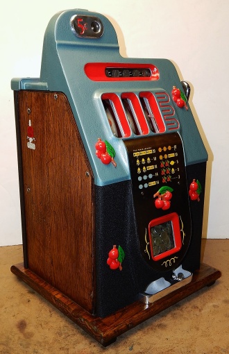 1947 Mills Black Cherry 5 cent, restorted, hammer tone blue, wrinkle black trimmed in red. This is a very nice machine. Original award card, original reel strips. Jackpot with reserve. Original back door with Mills lock with one key, original cash box. The only this that is not original is the paint. Plays very easy. A great rec-room machine.