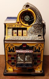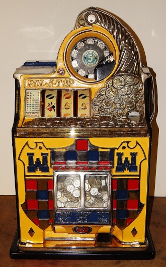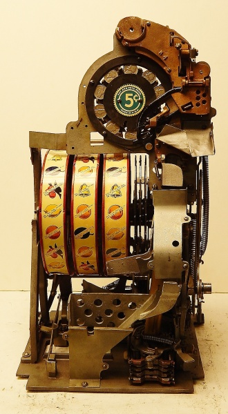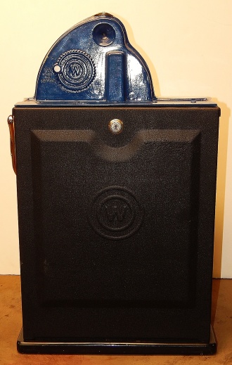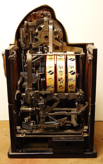 Watling 1941 "Checker Board" 5 cent, restored with original reel strips, original back door with lock and key, twin Jackpots. Original cash box. 3-5 pay out.