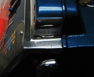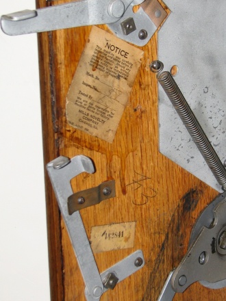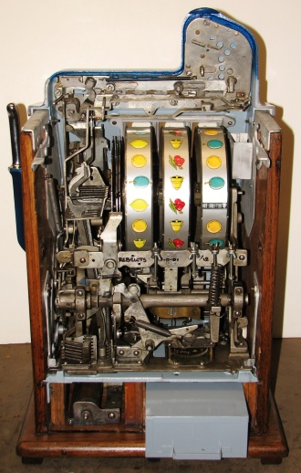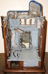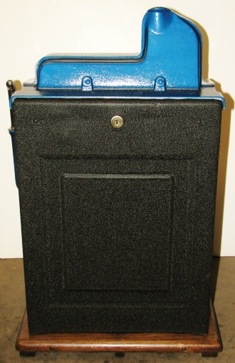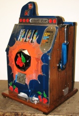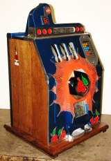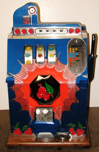 Mills 1938 Bursting Cherry, 5 cent . This is a very nice machine restored, Blue and Orange, with red and green trim colors. Mint condition award card, Jack pot with reserve, original back door and lock with one key, cash box. Still has the original paper inspection tag and serial number on the inside of the cabinet. Plays very easy, pays as it should. 2-5 payout.