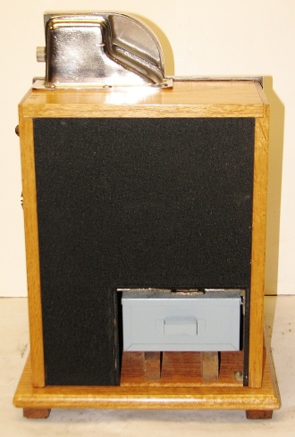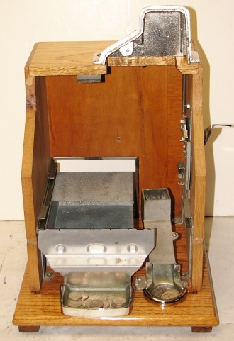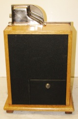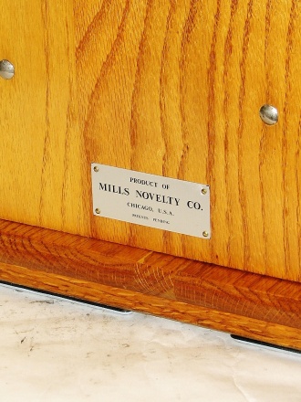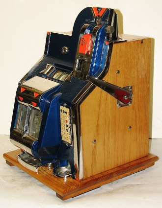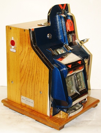 Mills 1935 QT "Hashmark" 5 cent. This is a very nice machine "older restoration" 9.5 out of a 10. Nickel plated. Blue and orange in color. Twin Jackpots, original front door lock , cash box, original award card. Plays very easy, 3-5 payout.