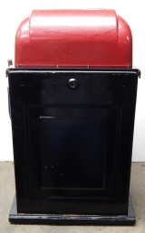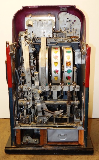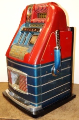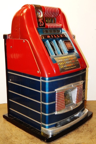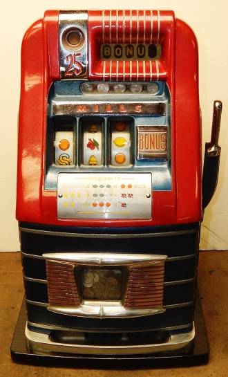 Mills 1948 Bonus Hi-Top 25 cent with the Hard to find Bonus feature. Previously restored, colors of Burgundy and blue. Very nice original oak cabinet, jackpot with reserve, original reel strips. original award card, original cash box, original back door, original Mills lock with one key. The only thing that is not original on this machine is the paint. When the BONUS letters on the first reel come up in order, corresponding letters will appear at the top right of the machine. Once the entire word BONUS is spelled out, you win 18 coins. This was another way Mills would try to keep people playing longer and if you had almost all the letters showing, it was hard to walk away.