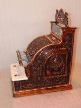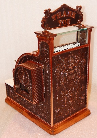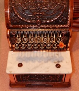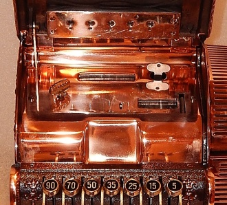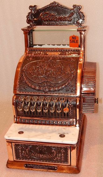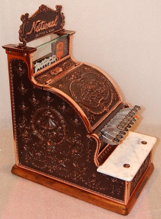 National #317 cash register restored, "Copper Plated". This is the smaller version which was produced for barber shops and candy stores. Approximately 17" tall, 11' wide, and 16" deep. About 70 pounds. All keys work great. Very desirable size. Easy to display. Serial Number 1084336. Wonderful piece in great working condition.