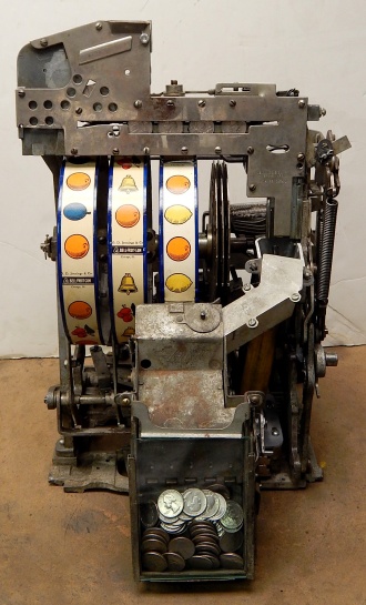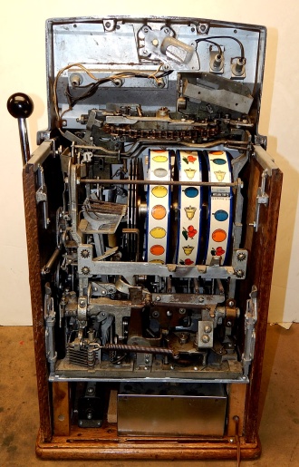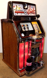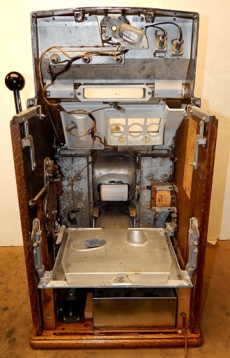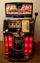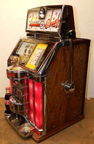 1960 Jennings Governor Chief (lite-up). Previously restored. The chrome plating on this machine is 9.5 out of a 10. The cabinet is made of solid Oak Wood, original reel strips, original award card, new cashbox, original back door. It plays and pays as it should.