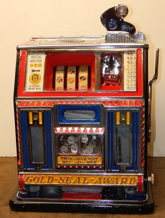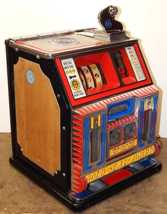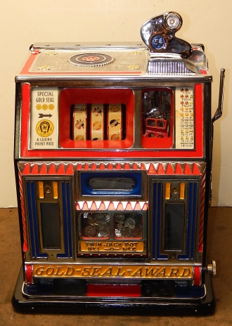 1932 Watling Baby Bell "Gold Seal-Award" 5 cent, restored back to original condition. Polished, not chrome plated. Twin jackpots, Mint Vendors, Gold Award, cash box, original back door. 2-4 pay out. Very nice original machine.