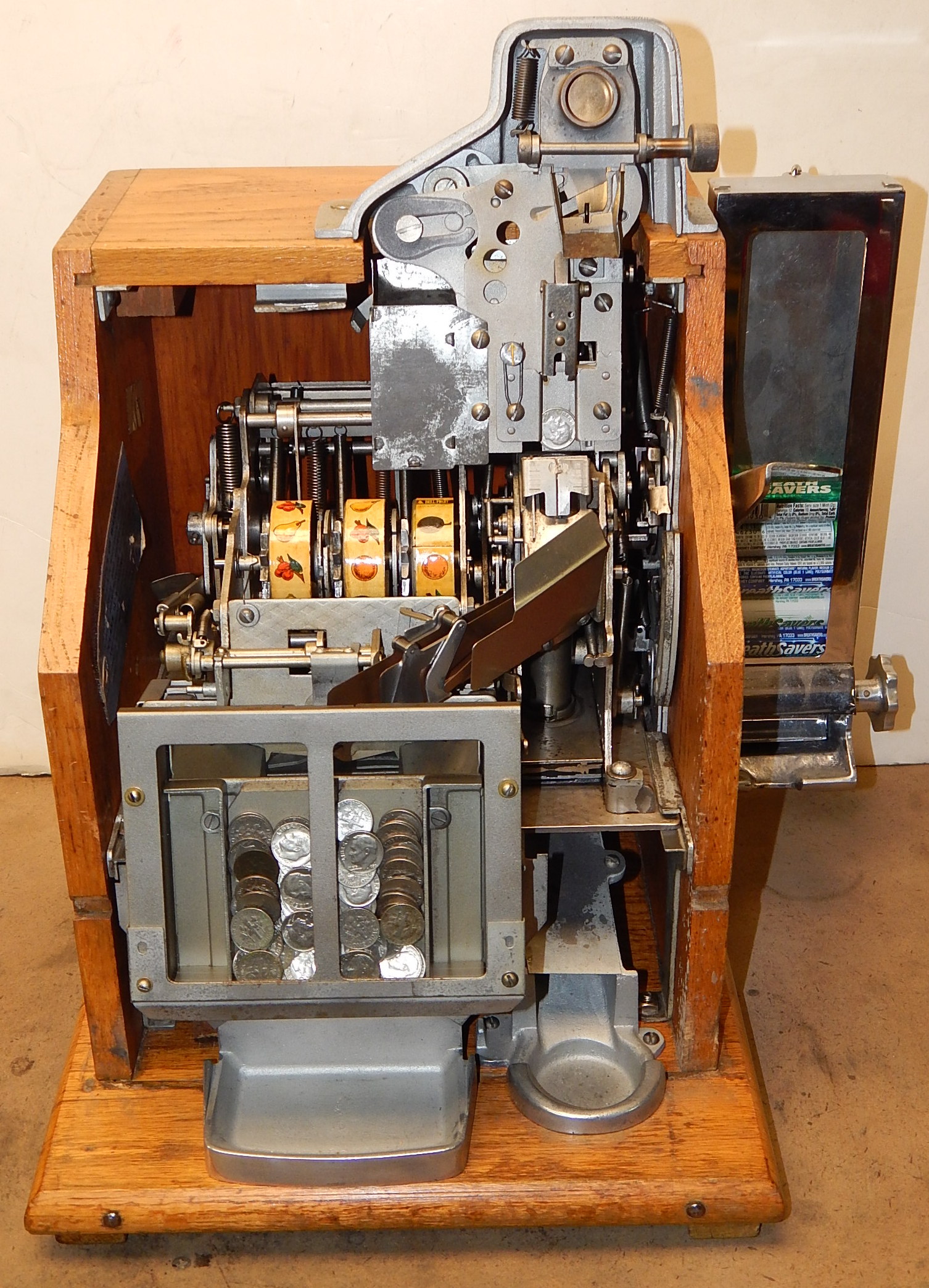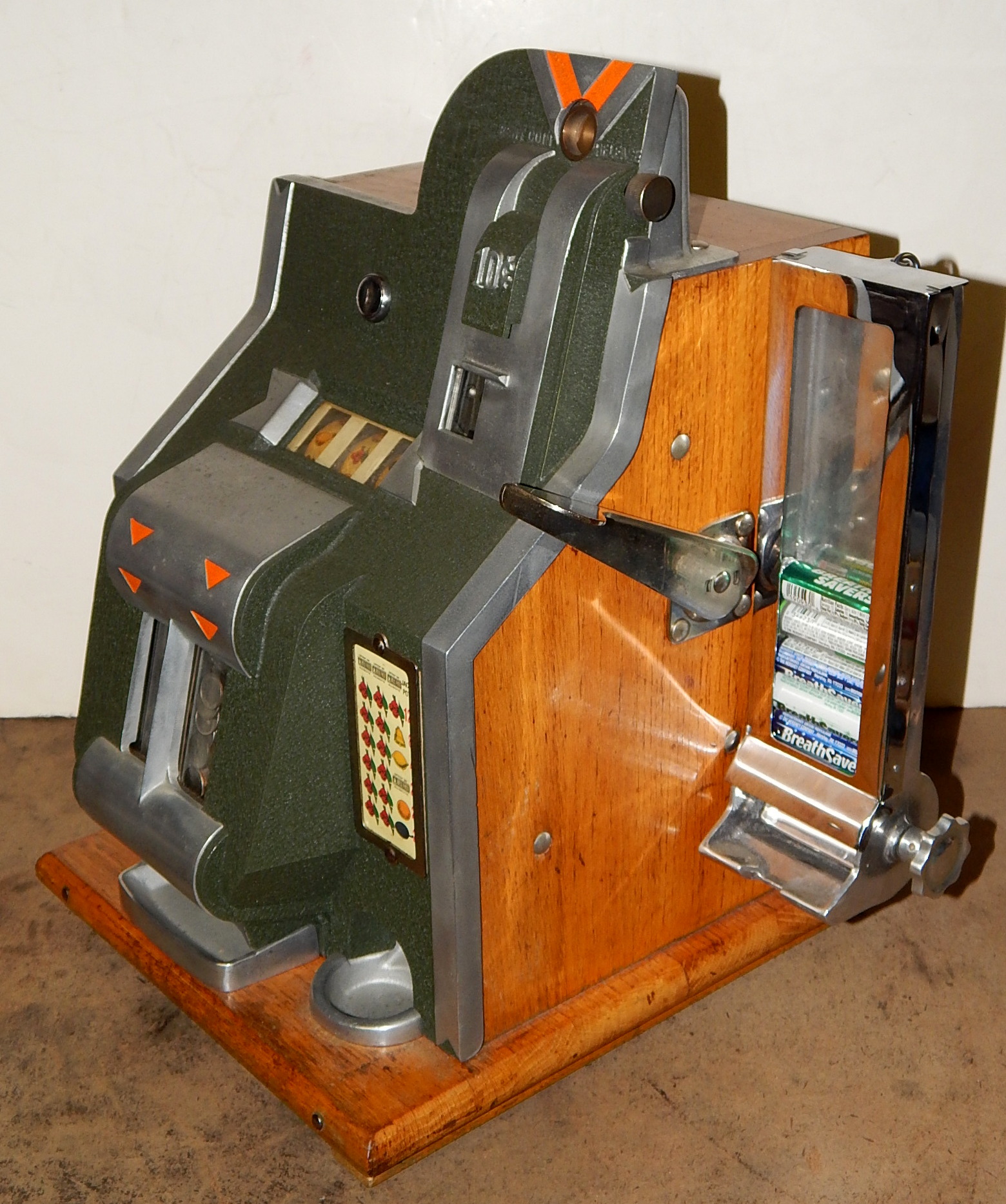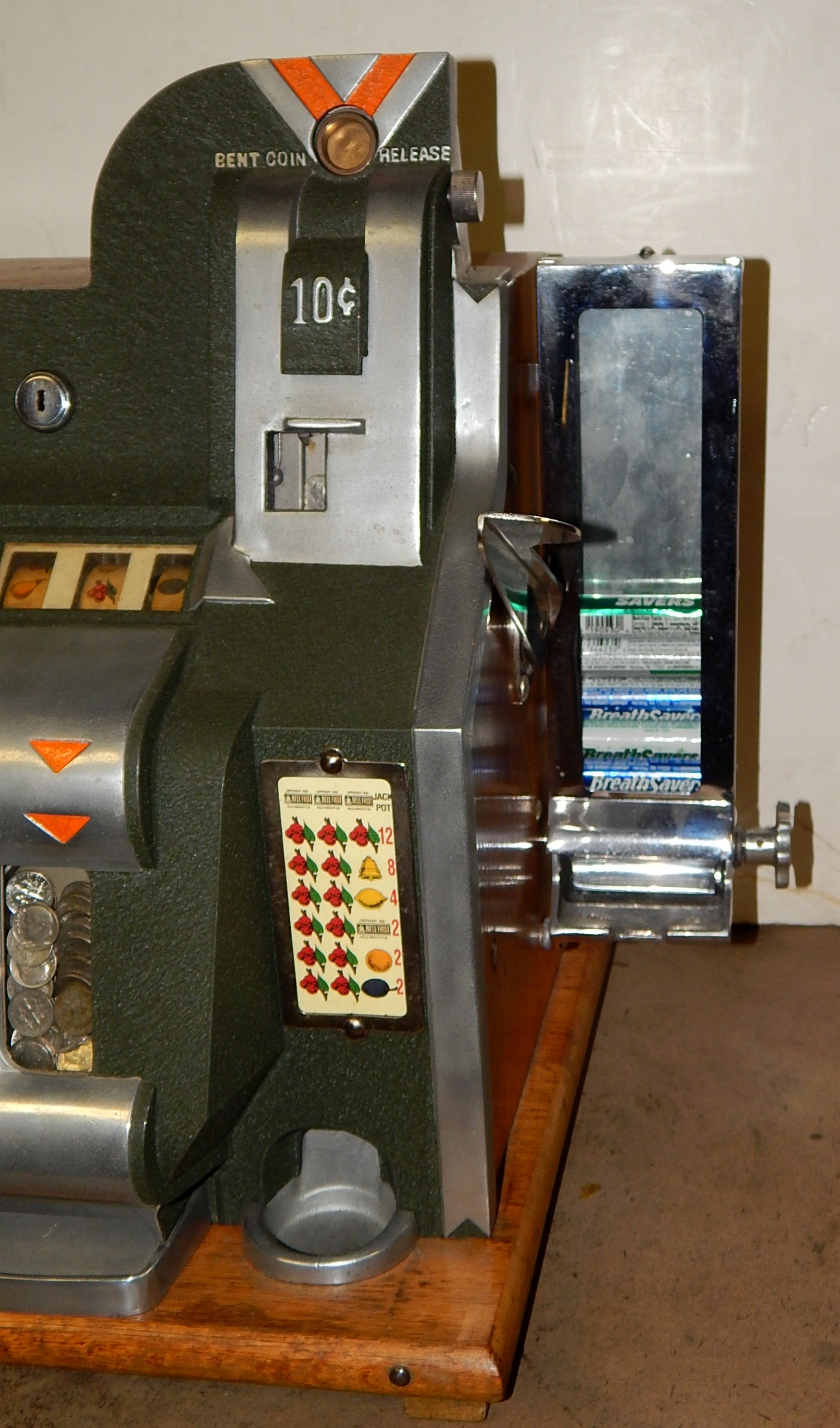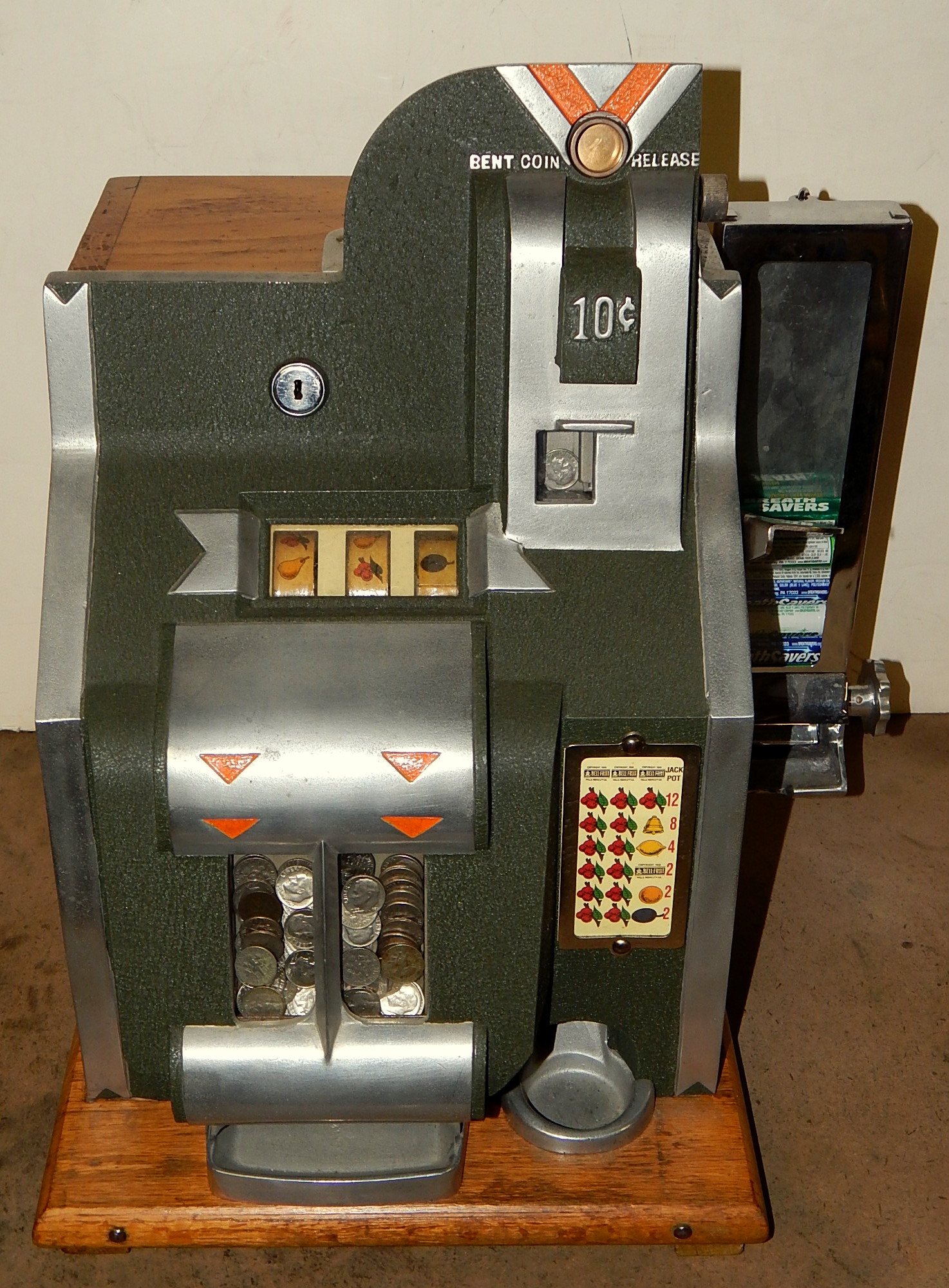 One of the most popular design models and manufactured from 1936 thru 1940. The 10c denomination was unique in that it had a specially designed front casting with narrow jackpot windows and twin jackpot with spacers to reduce the number of dimes the jackpot would hold. A little on the rare side