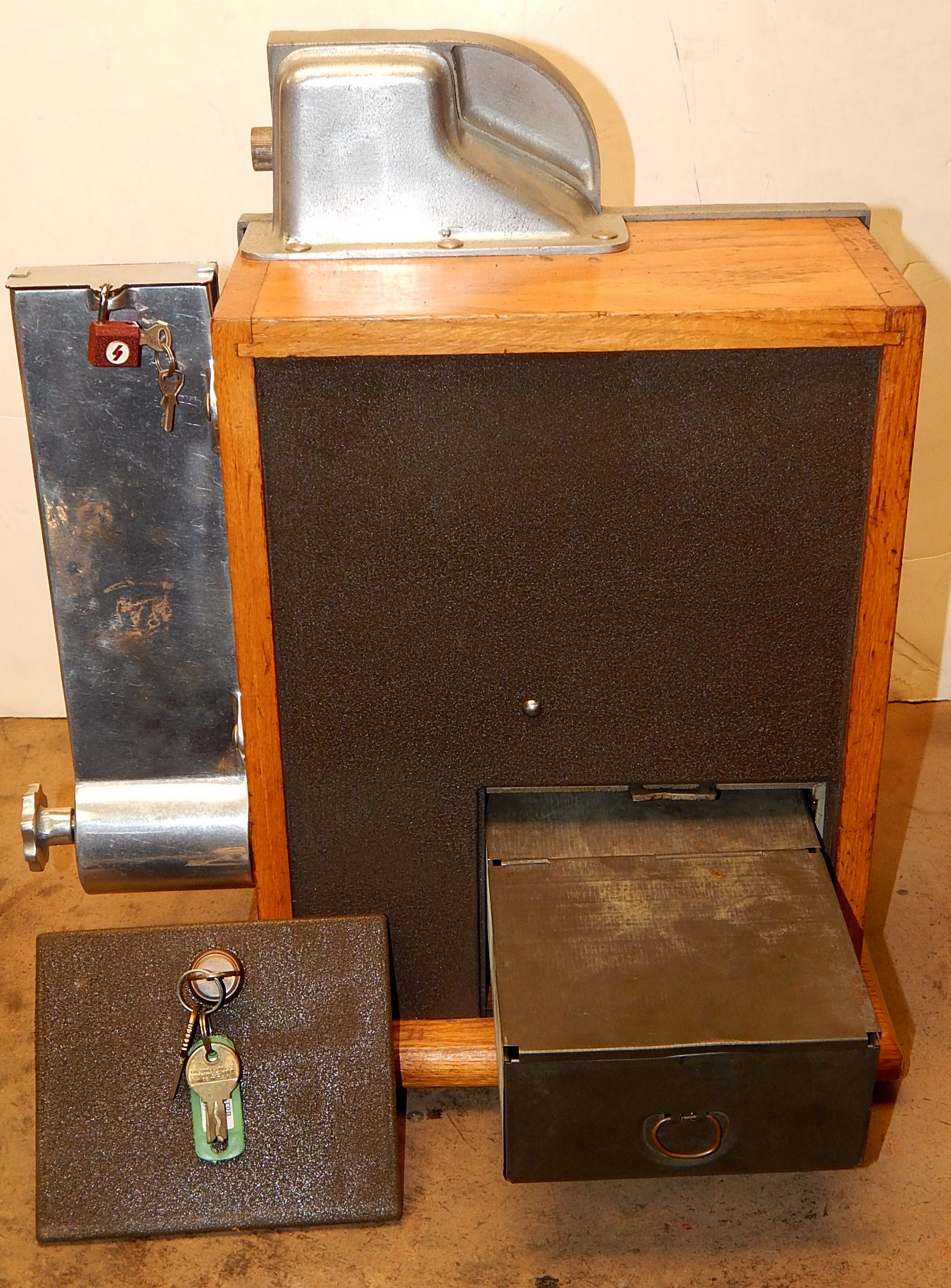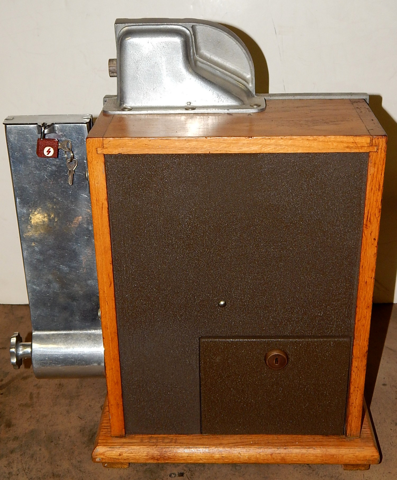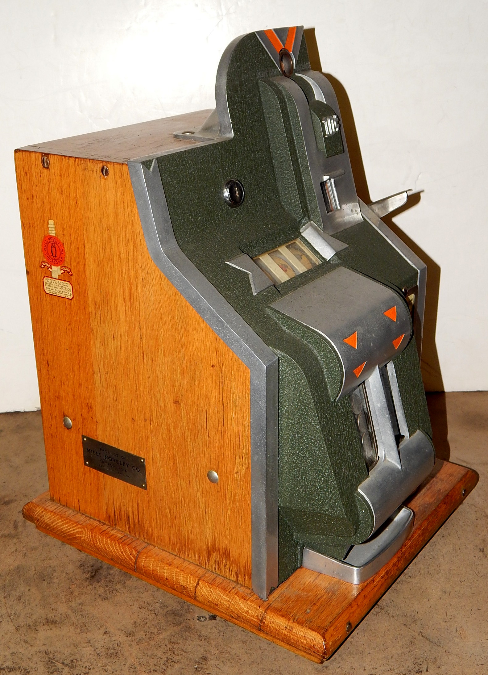 1935 Mills QT "Chevron" 10 cent with "SIDE VENDOR". This is a very nice machine. Twin Jackpots, original back door, original cash box, original award card, original Mills front and back door locks with Mills keys. This is an original dime QT, not a converted penny. Plays very easy, 3-5 payout.