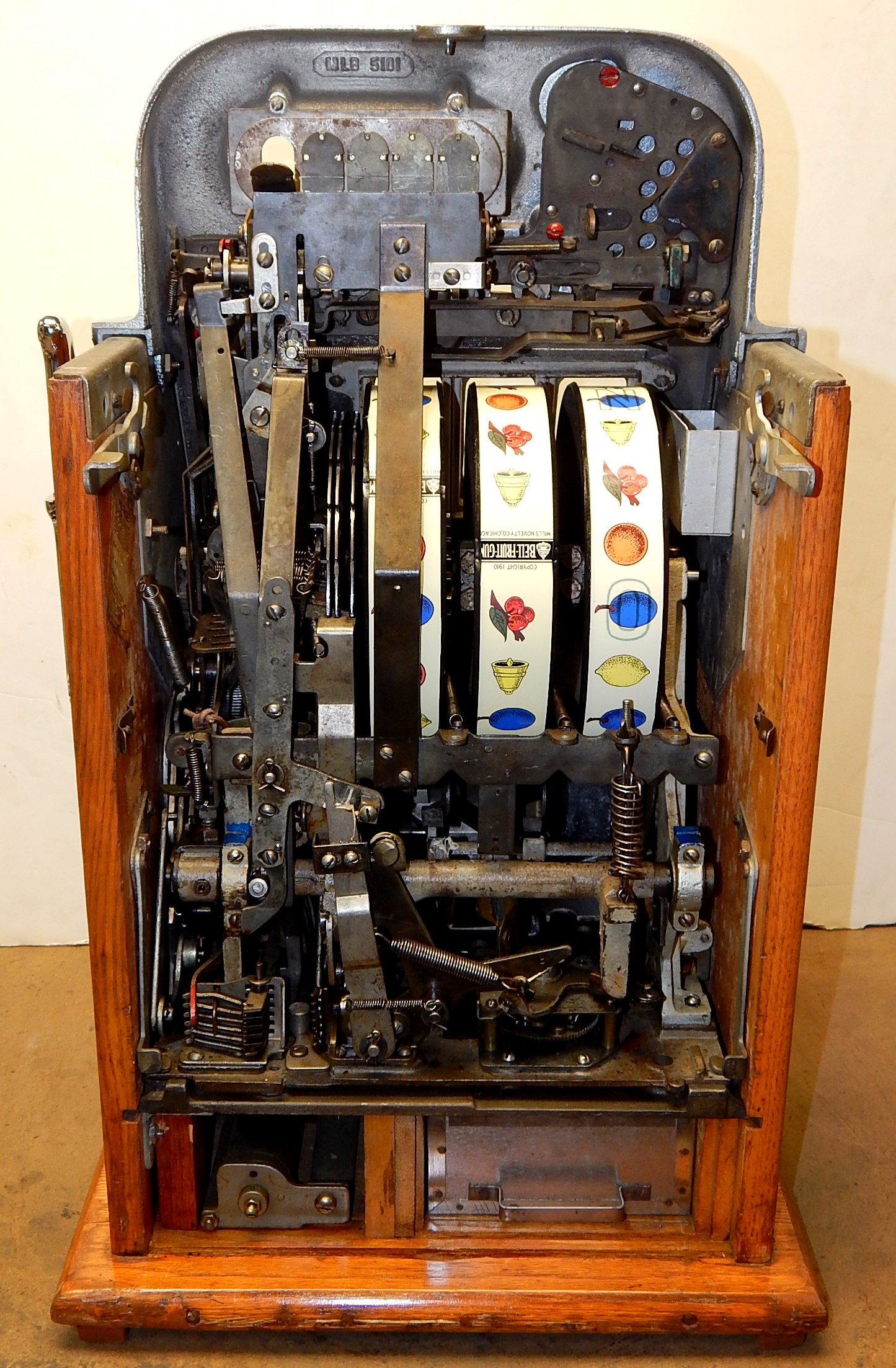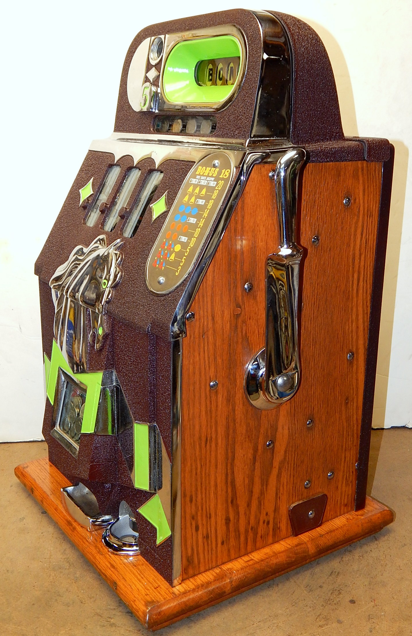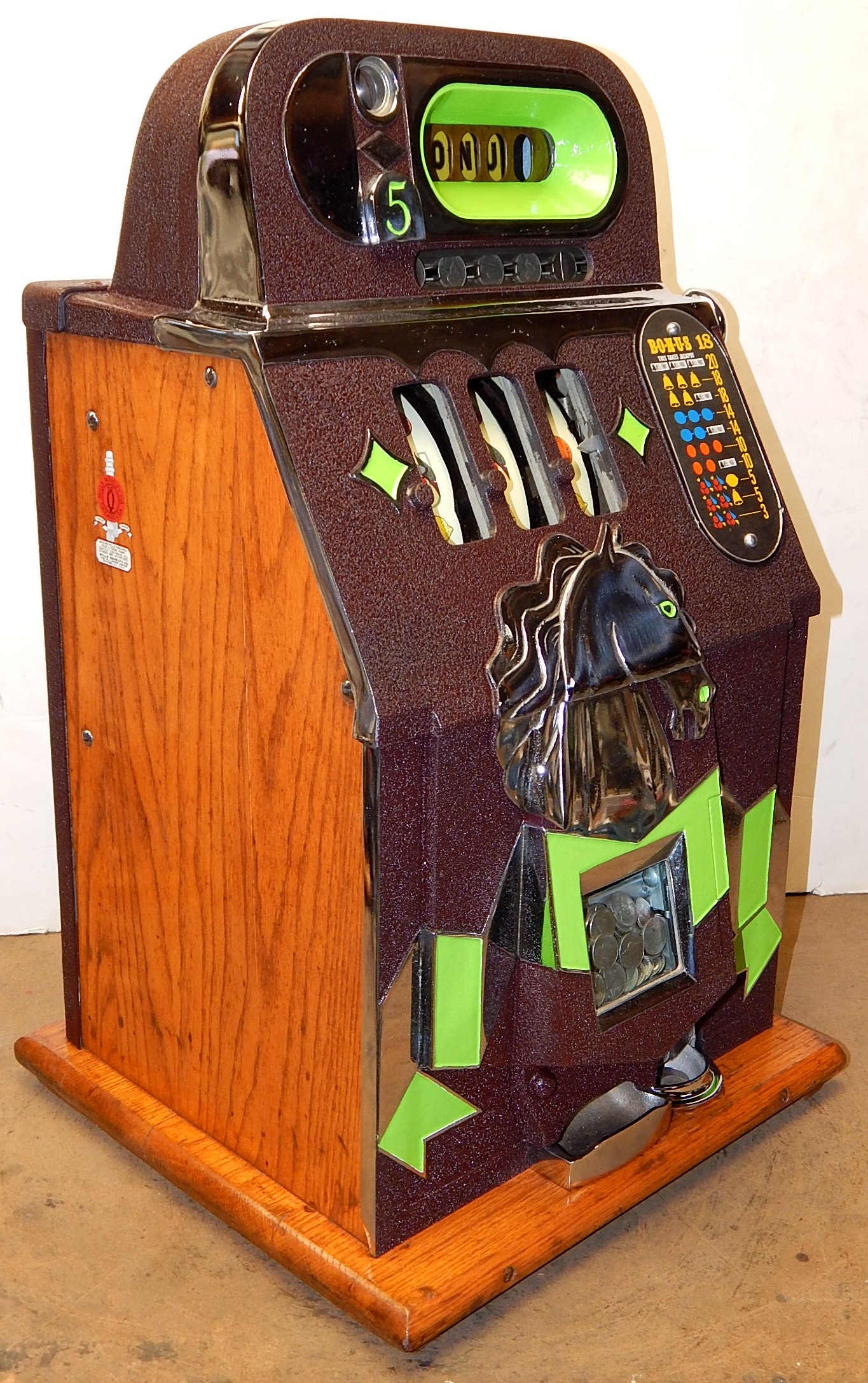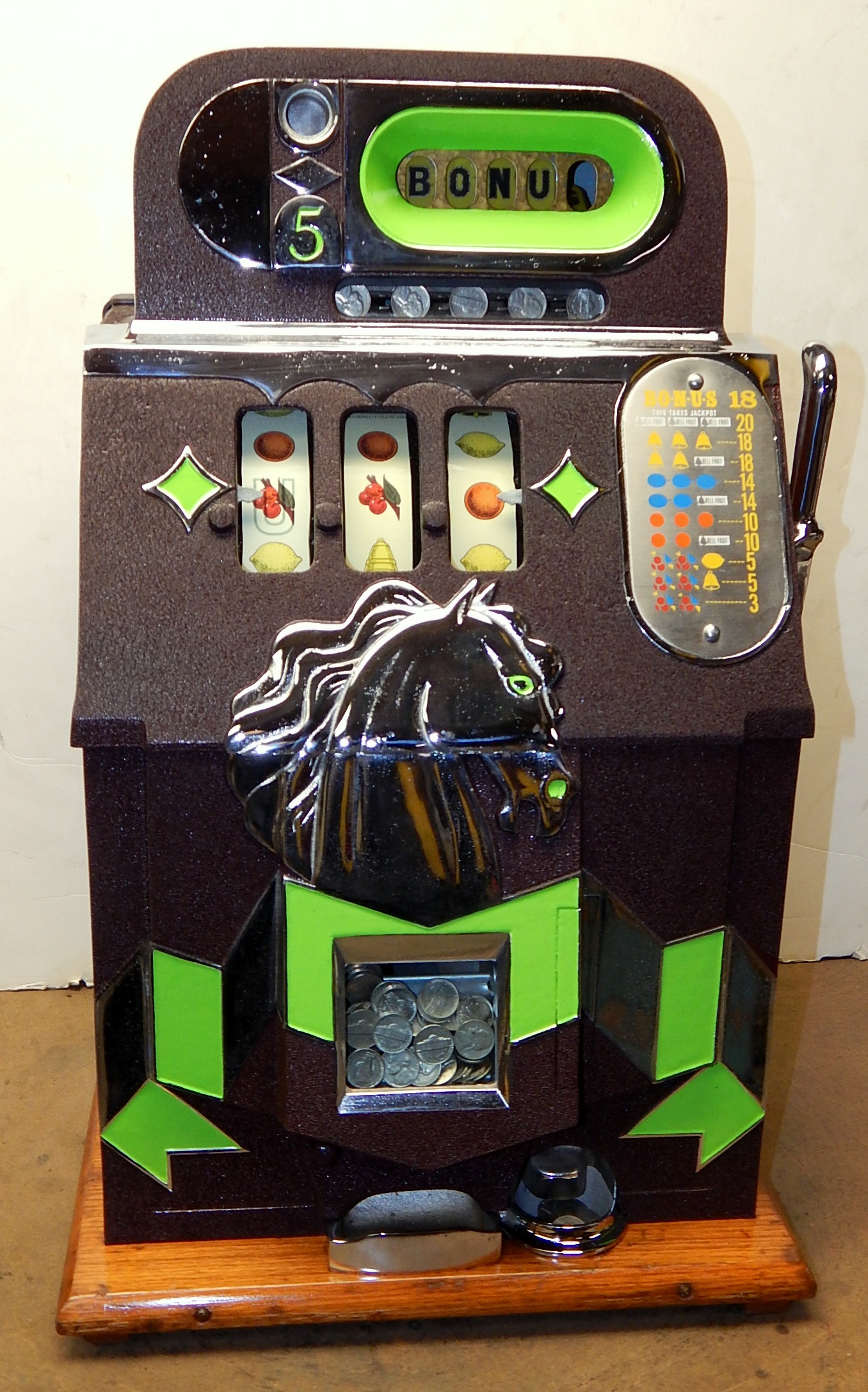Mills 1938 Horse Head Bonus, 5 cent, Previously restored back to the original colors, painted wrinkle brown, trim in green with the Hard to find Bonus feature. New reel strips, new award card, cashbox, original back door with Mills lock with one key. Casting are chrome plated. Still has the original paper work on the inside of the cabint. Plays very easy and pays as it should.