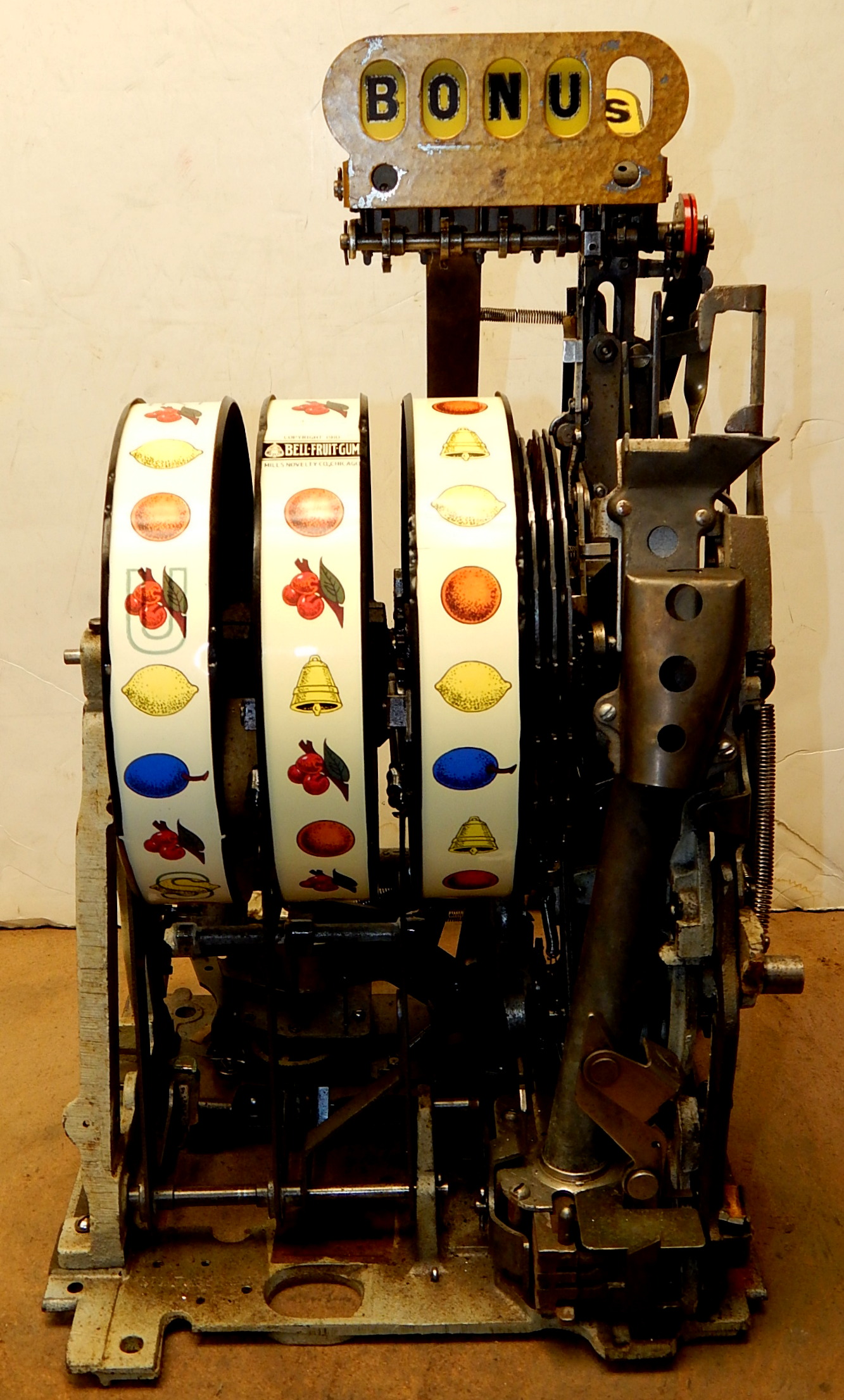 When the BONUS letters on the first reel come up in order, corresponding letters will appear at the top right of the machine. Once the entire word BONUS is spelled out, you win 18 coins. This was another way Mills would try to keep people playing longer and if you had almost all the letters showing, it was hard to walk away.