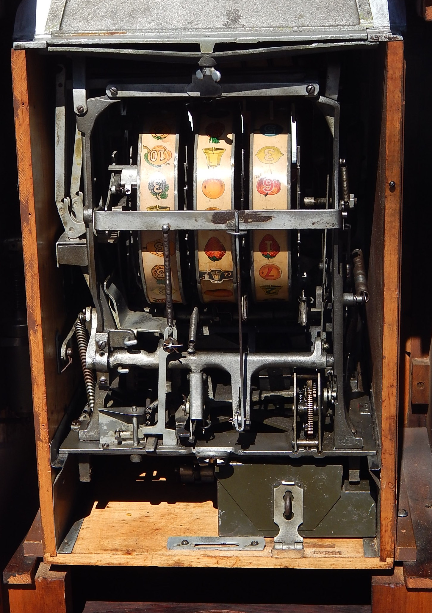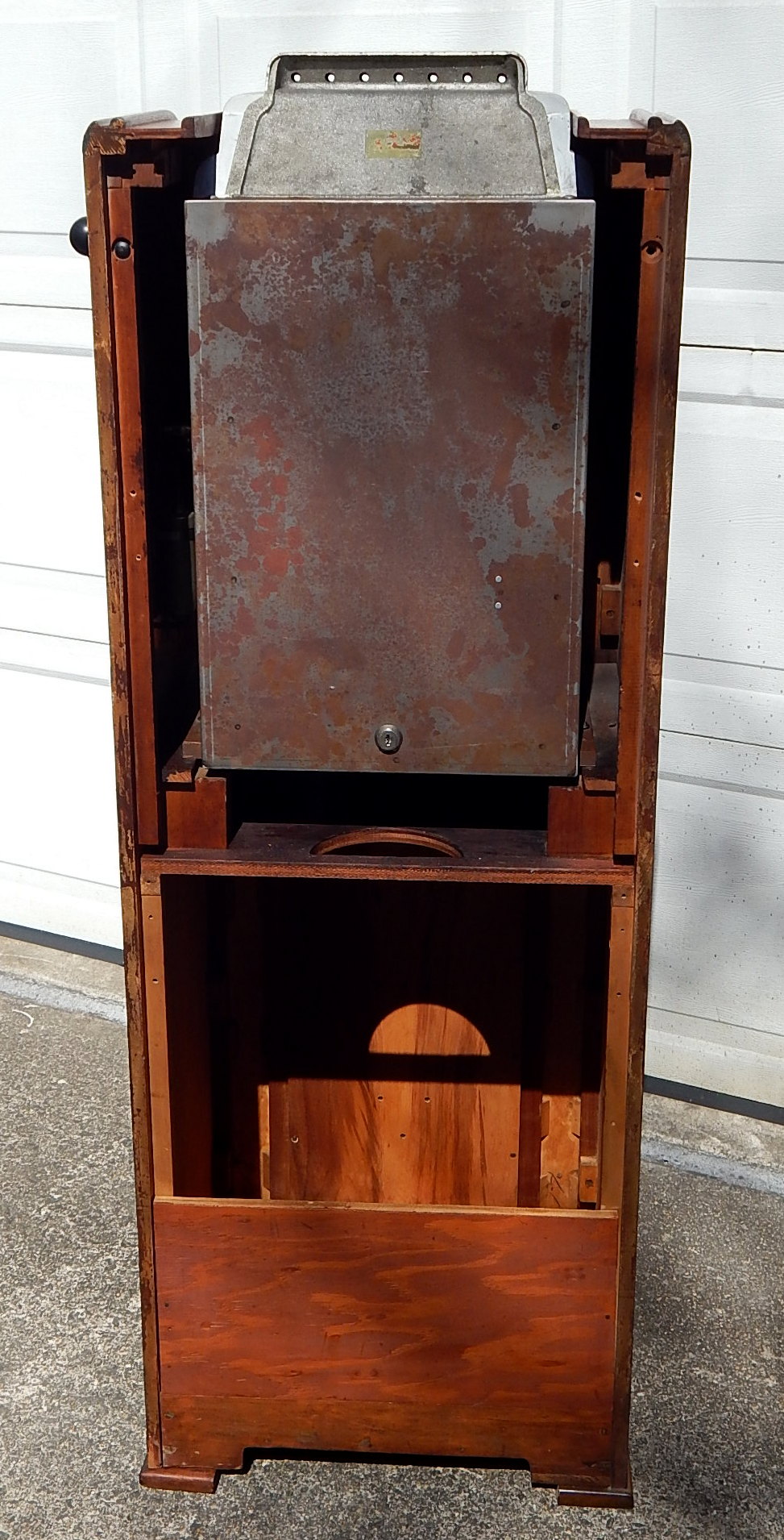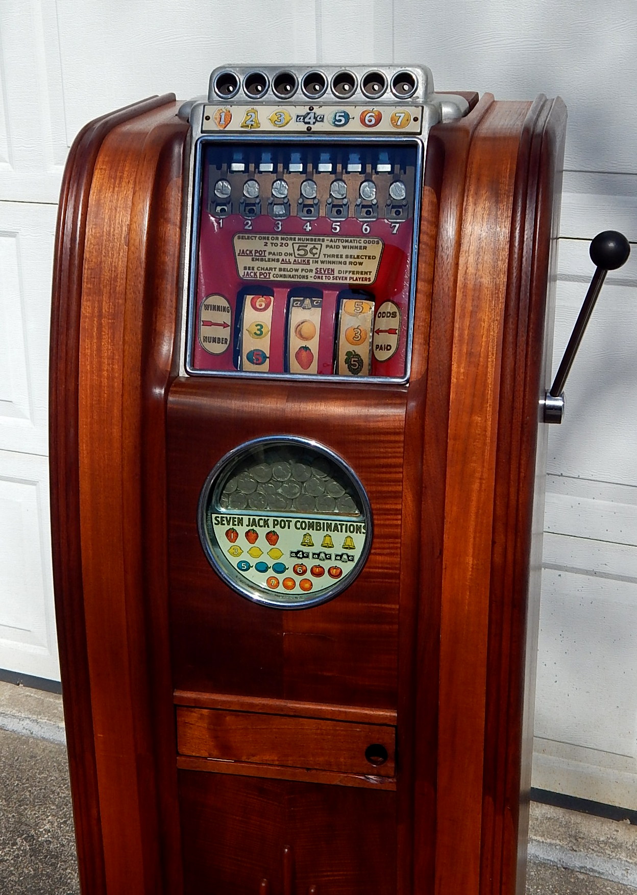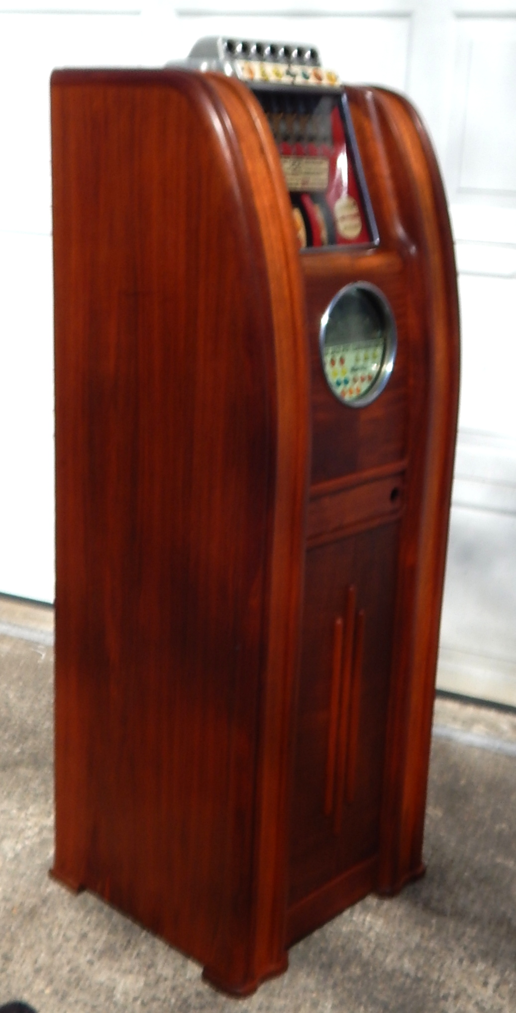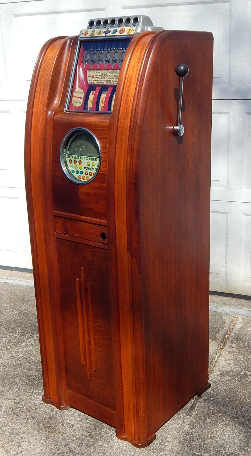 AC Multi-Bell Console 5 cent. Not many of these floating around these days.7 people can play this at a time, Has 7 separate Jack Pot Combinations. 7 times the action. 7 coins at one time. Mystery Pay Out 3-5-10 or 20 coins. It's modern cabinet has styling and lasting beauty which is reflected in the graceful unbroken lines with blending wood and finish. 20" wide, 57 1/2" tall, 17 3/4" deep, 171 pounds Plays and pays as it should.