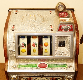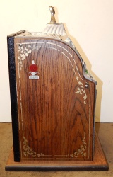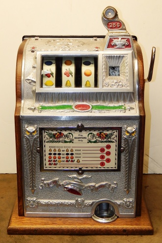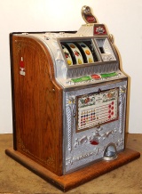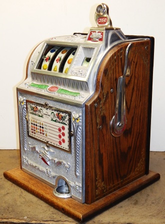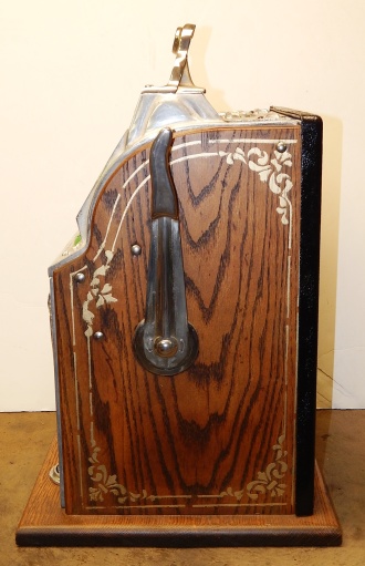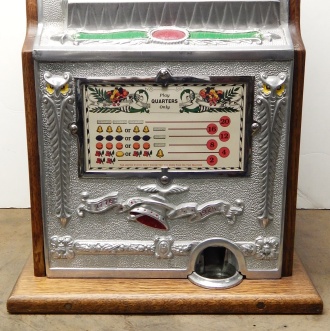 1923 Mills COK Banner Vender 25 cent, with gold leaf oak cabinet, in restored condition, original Tin reel strips, original back door with lock and key, original cash box. play and pays as it should.