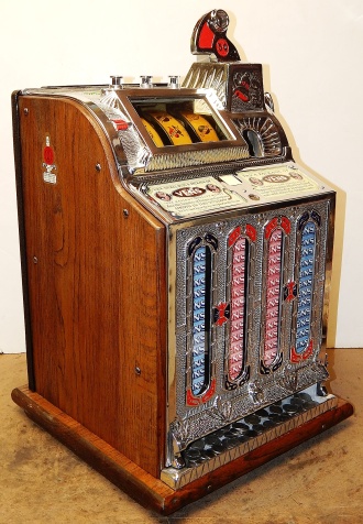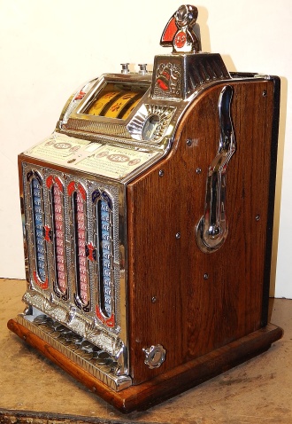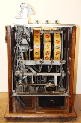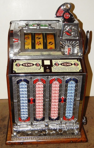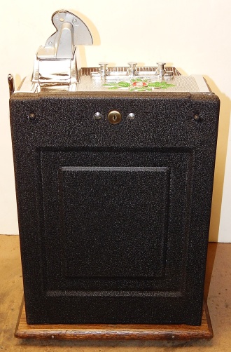 1926 Mills FOK 4 Column Vender with Skills Stops 5 cent, restored back to original condition. Polished not plated. This machine has a lot of things going for it, Mint vender, which give you a roll of mints every play plus, if you are good enough, you have the opposition of stopping the reel your self, making you think you had a better chance to win. This was Mills way to make the machine more appealing to the player and get around the gambling laws back in the day as a game of Skill. Plays great and pays as it should.