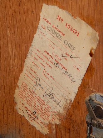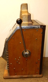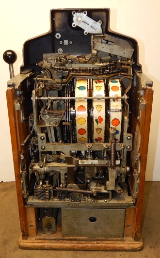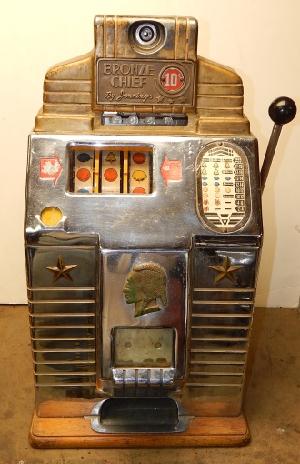 1945 Jennings Bronze Chief, 5 cent. original machine, original cash box, original back door, original reel stripes. Jackpot with reserve. Plays nice 3-5 payout.